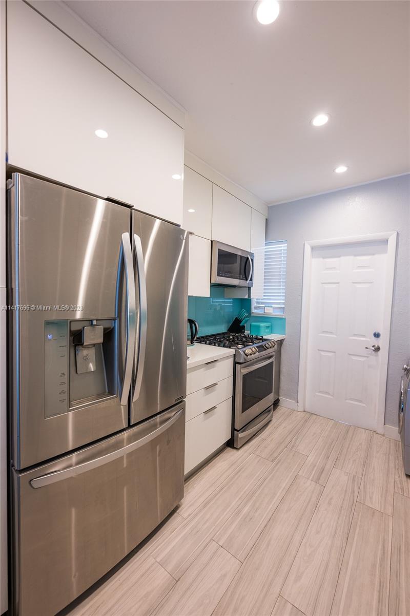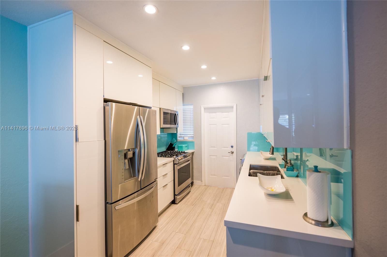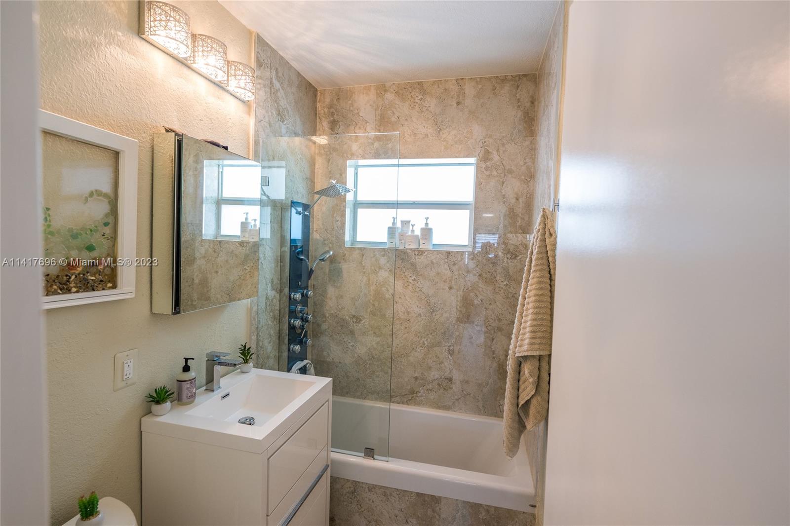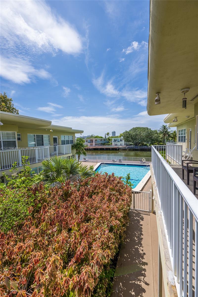 Waterfront corner unit in a 2-storey art deco building for sale in a quiet Normandy Isle neighborhood. This 2 bedroom, 2 bath condo is completely updated with state-of-the-art kitchen and LG appliances, including washer/dryer. Both bathrooms are modern with Shower Panel Tower Systems and rainfall shower heads, and bedrooms are large with plenty of storage room and built-in wall units. The condo has a Spanish porcelain tile floor and white Florida shutters throughout, and the courtyard features a pool, BBQ area and a deck with loungers. Shops, restaurants and churches are within a 7-minute walk and the beach is a 15-minute walk away.