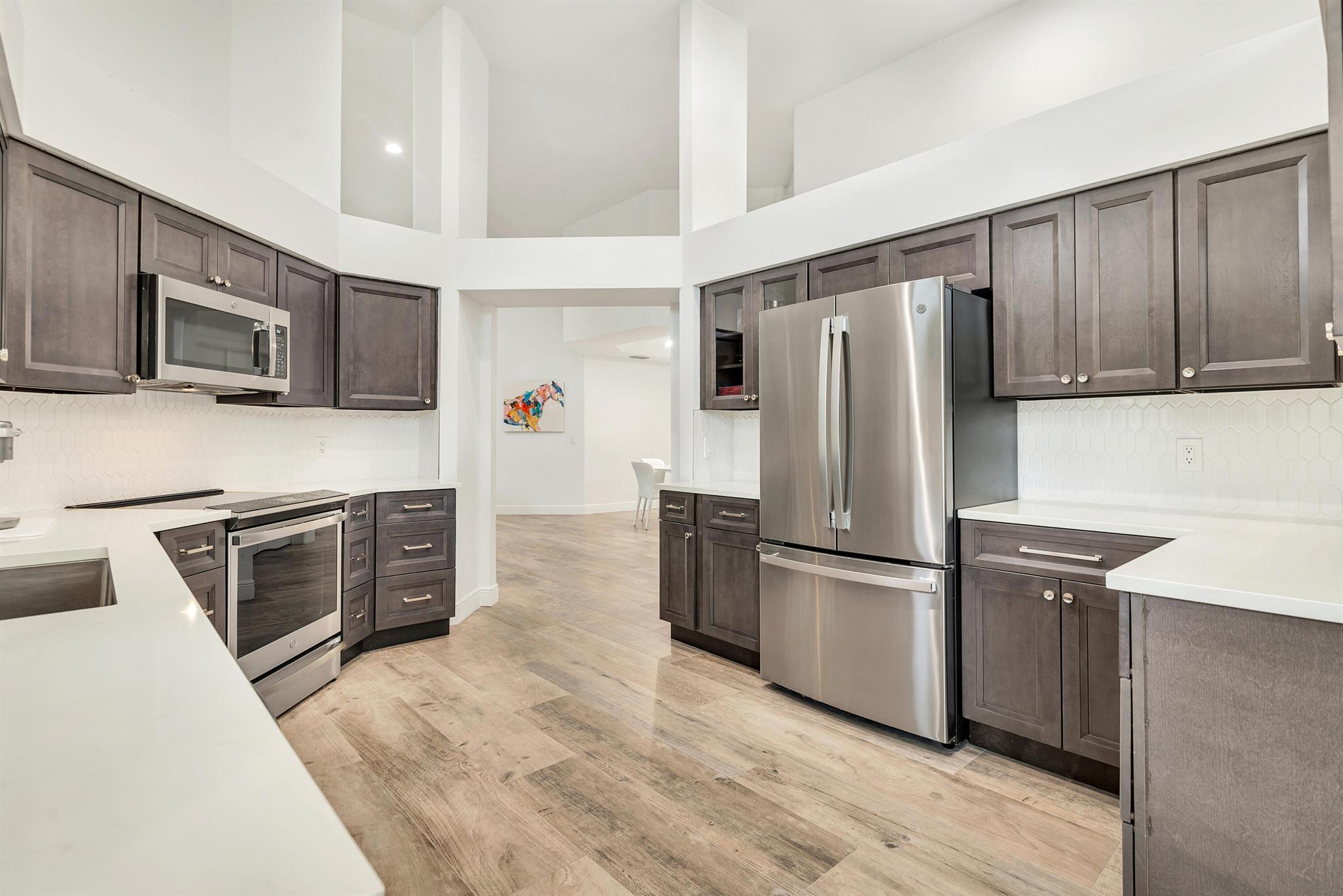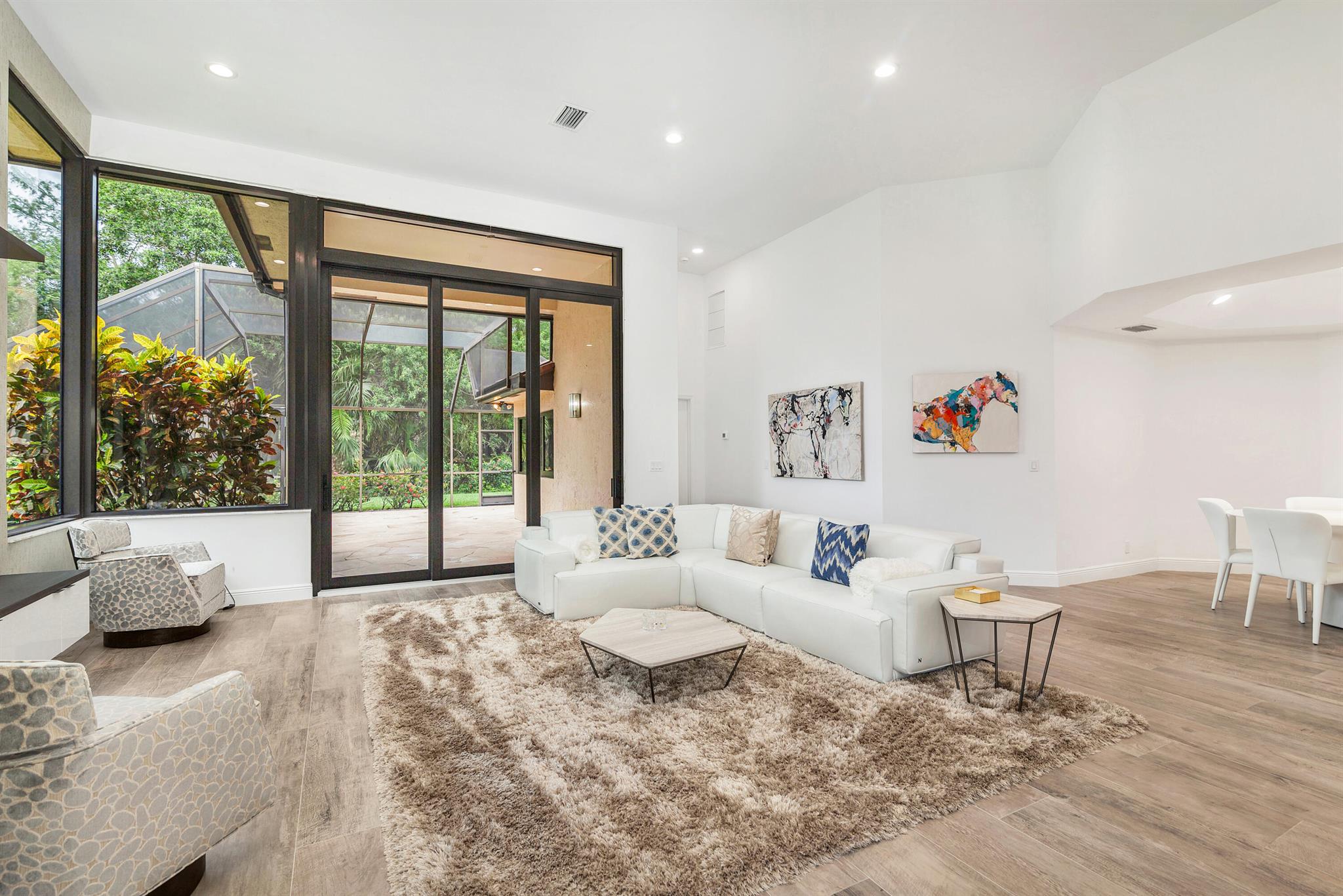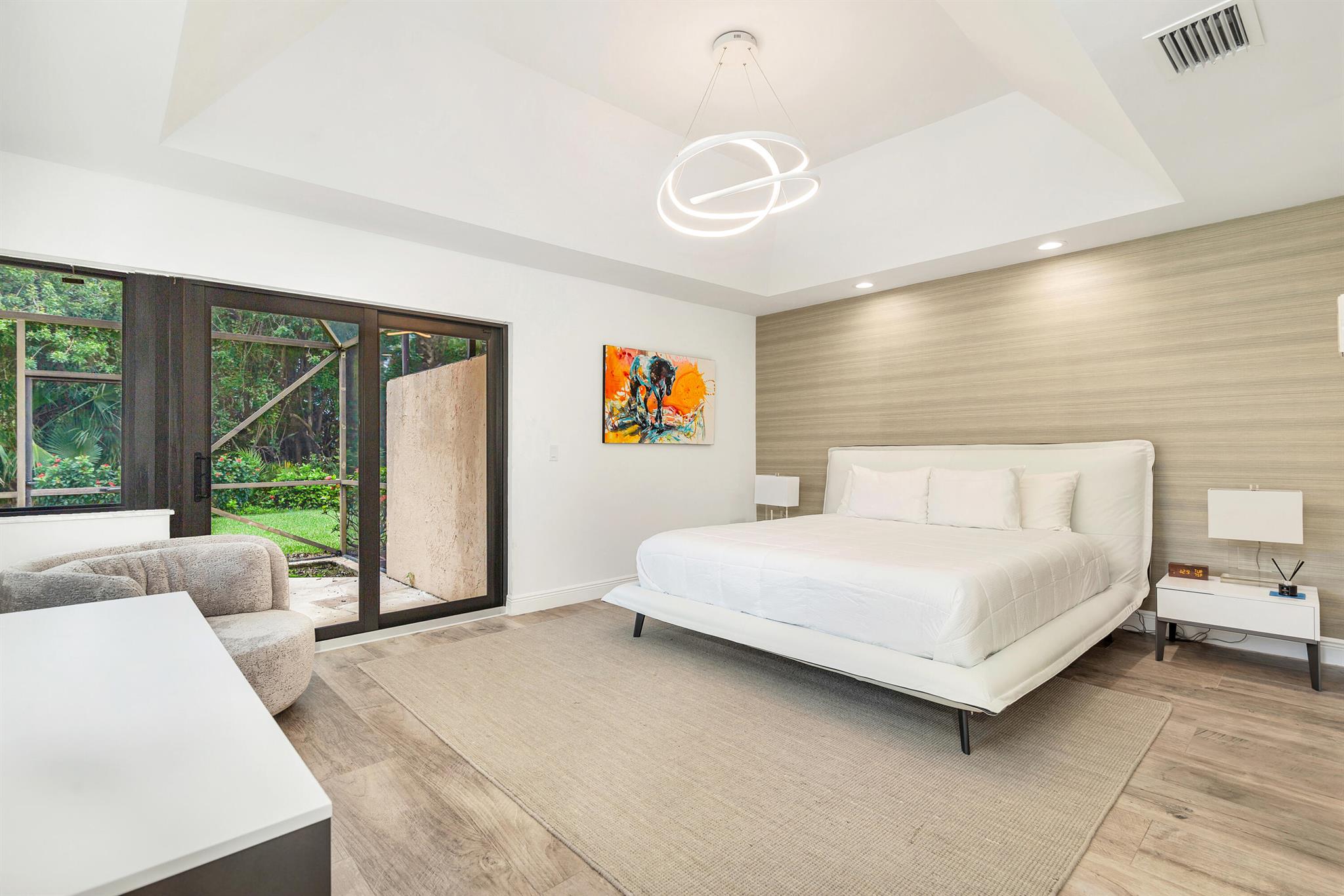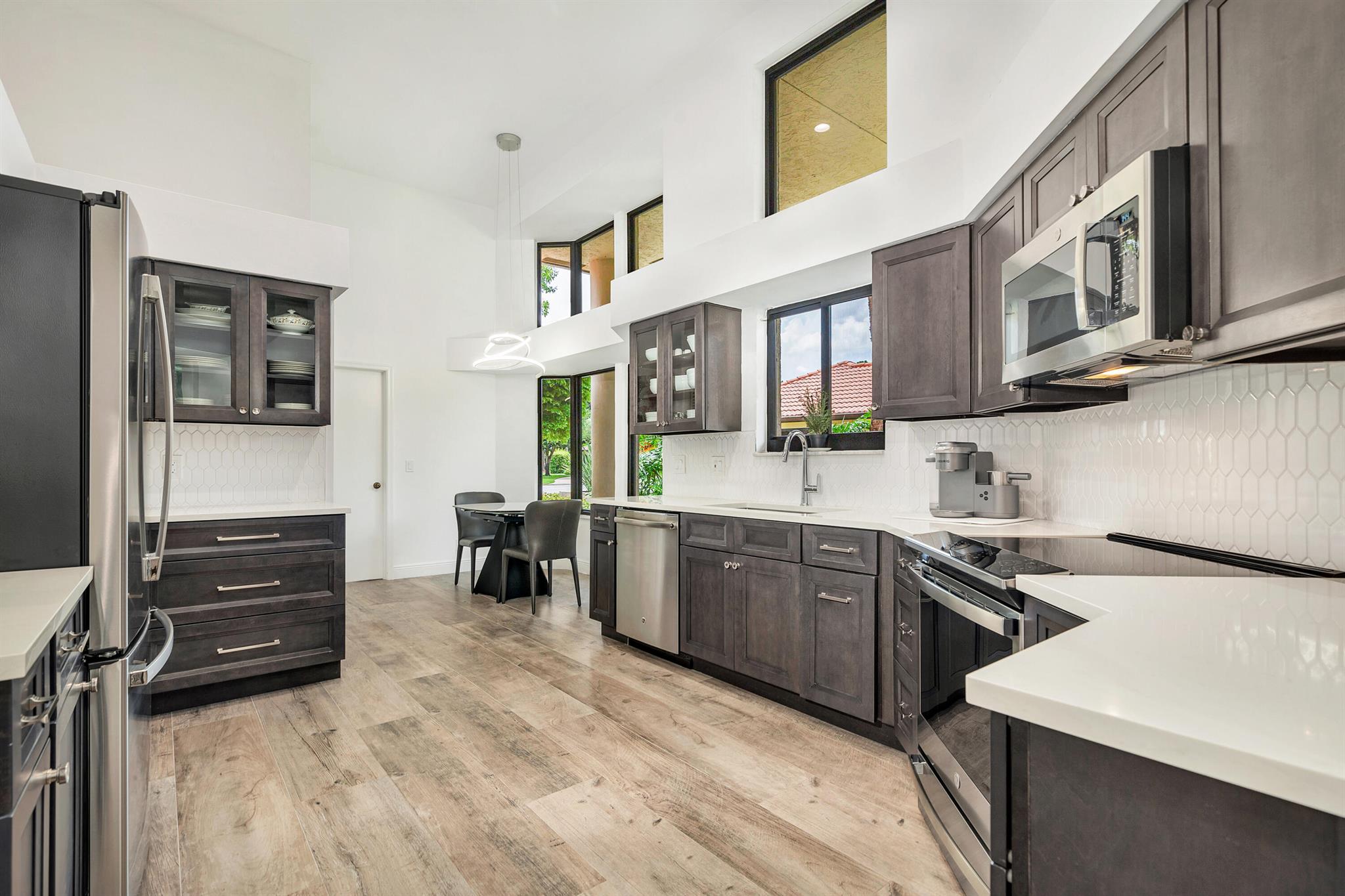 This luxury Villa is fully renovated to the highest of quality in design and architectural features. Located in the pristine community of Breakers West this 3BR 2BA 2 car garage is a rare find and a designer's dream come true. New kitchen and Baths. Mature trees, lush greenery and landscaping surround you the moment you walk up to your private Sand Drift Villa. Features include: All new Hurricane glass impact windows, transoms, sliding doors and custom designed glass entry door. The moment you enter you will be taken in by the 15ft high ceilings and natural light that pours in. Wide plank wood tile flooring is in all rooms. Custom lighting, skylights and dining room with wine bar. A large eat in kitchen with breakfast room that overlooks your charming entry garden.