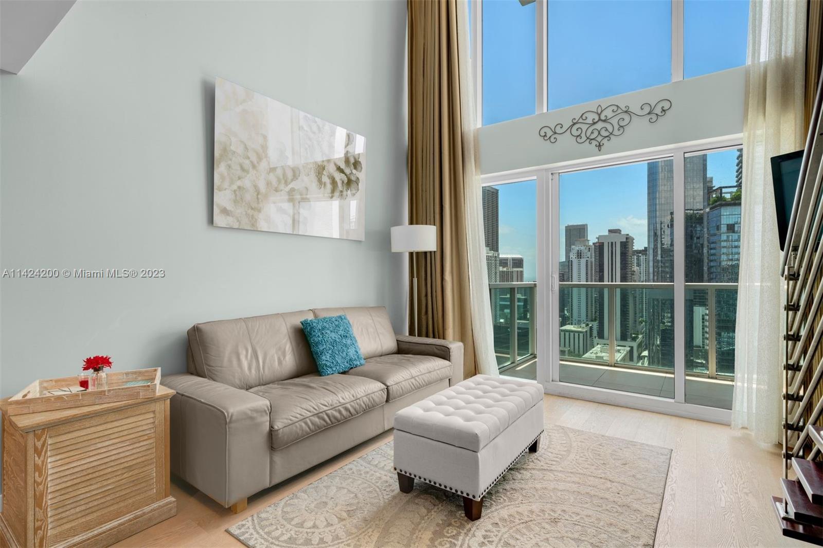 A turnkey furnished 1 Bed/1.5 Bath loft at Brickell on the River South w/ a renovated kitchen, stainless steel kitchen appliances, wood flooring throughout, Jacuzzi bathtub, in-unit washer & dryer, large walk-in closet, and double-height ceilings w/ floor-to-ceiling glass windows overlooking the city skyline from 42nd floor. Includes one assigned parking space on the 1st floor and all furnishings, electronics, dishware, and linens. Airbnb/short-term rentals allowed (no minimum rental period). Amenities include 2 pools; a 3-story fitness center; spa w/ men's & women's sauna, steam room, and whirlpool; conference room, business center, party room, 24-hour valet parking, and 24-hour concierge & security. Steps from the MetroMover and an array of high-end shops, restaurants, and entertainment.