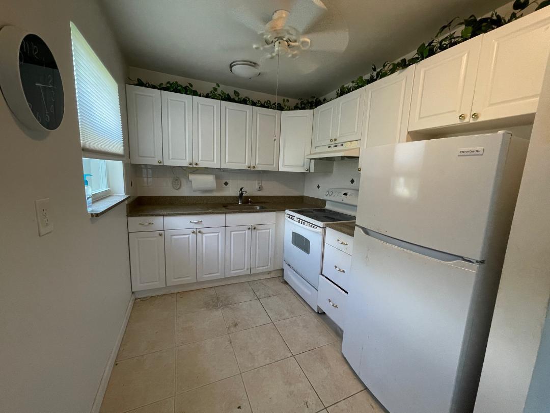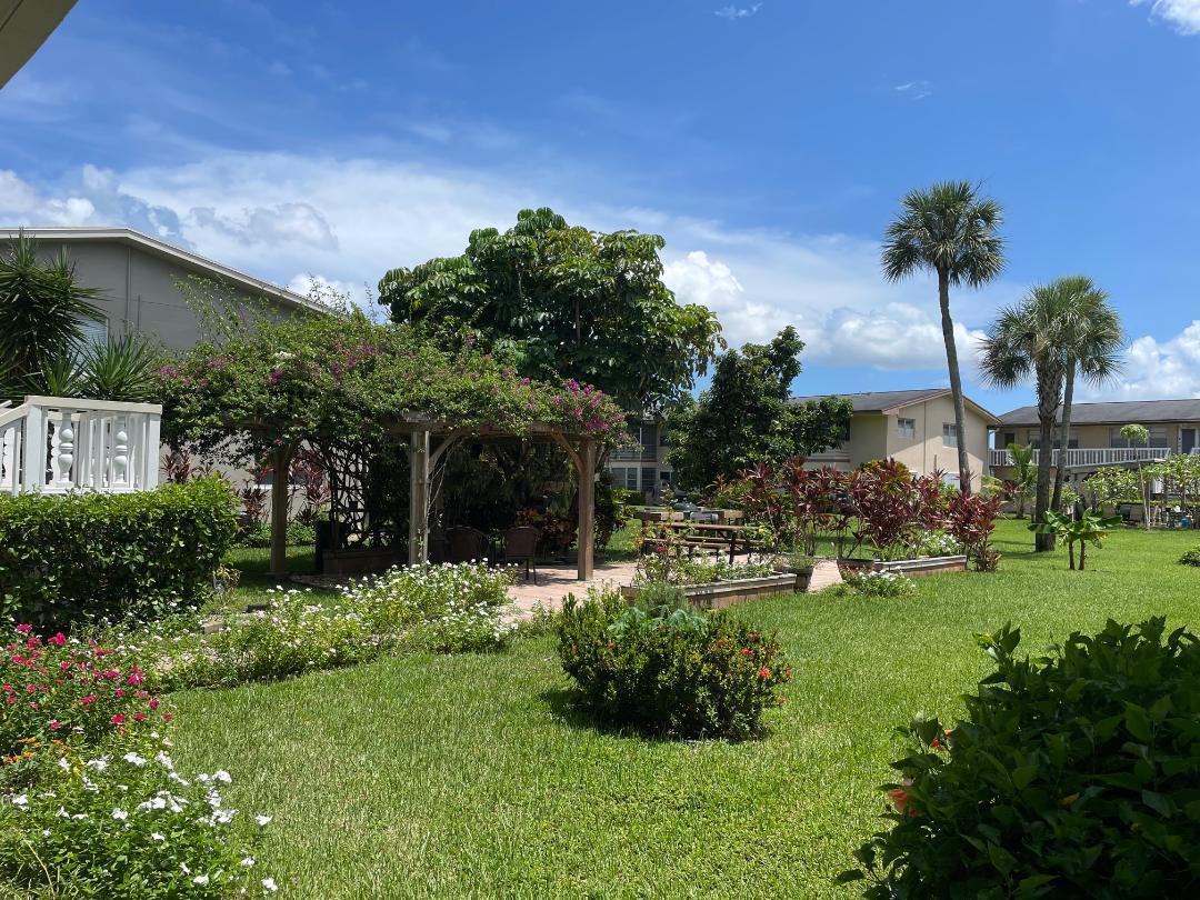 WOW - FIRST FLOOR CORNER 2/1.5 Centrally Located Within 55+ Century Village! Enjoy views of the lovely, landscaped resident patio from the kitchen window. Kitchen updated with white cabinets, granite counters, and tile flooring. Popcorn removed from ceilings. Impact windows. Enclosed lanai (non-impact). Central AC. Some work needed but great bones, location, and price! Fantastic location close to the Haverhill Gate, Main Clubhouse and Hastings Fitness Center. Nicely maintained building with pretty resident patio and new roof in 2018. SOLD AS IS. Century Village is a 55+ community with so much to offer...
