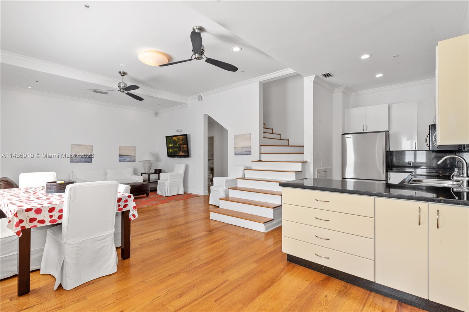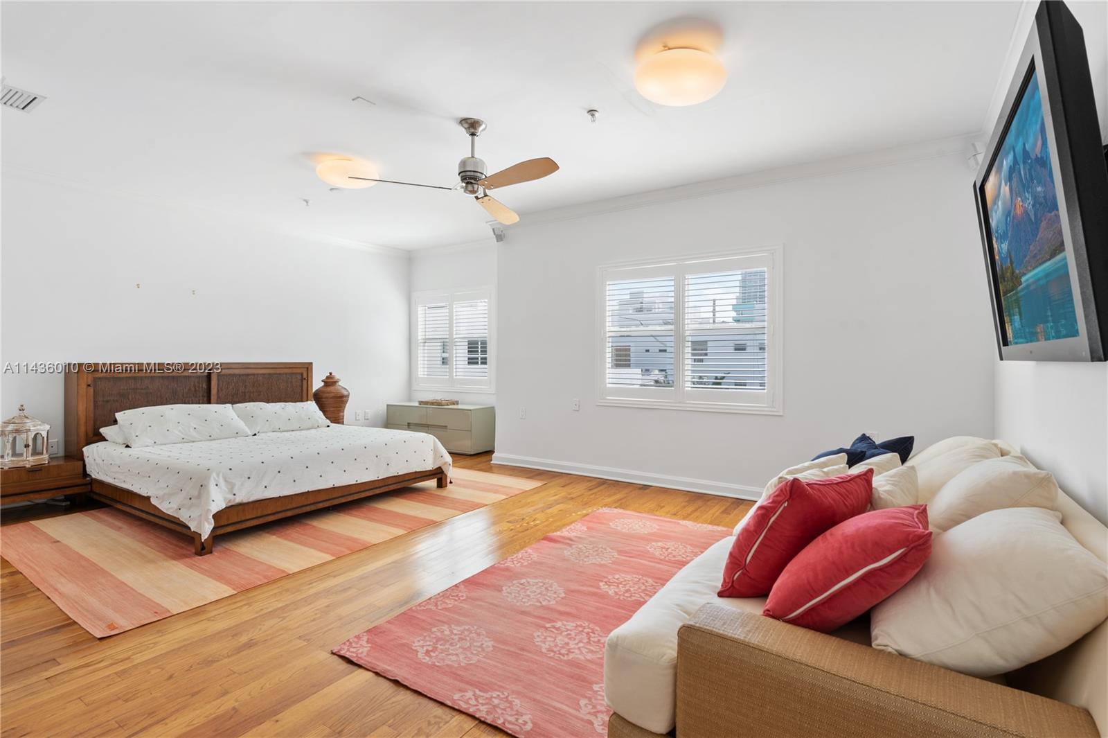 This 3 bedroom, 3 bathroom two story townhome is located in the heart South Beach (South of Fifth), in the 14 unit boutique building of The Presidents Club. Just two blocks to the beach this spacious home features real hard wood and marble flooring, volume ceilings, and an open kitchen/living room area. Two bedrooms downstairs both with access to their own private bathrooms. Upstairs you will find a huge primary bedroom with a large walk in closet and a spacious 500 SF rooftop patio providing the best city and ocean views. Impact windows and doors throughout. Brand new AC. One garage space included. Washer/dryer in the unit. Just a short walk to the white sandy beach, restaurants and the best shops that South Beach has to offer.