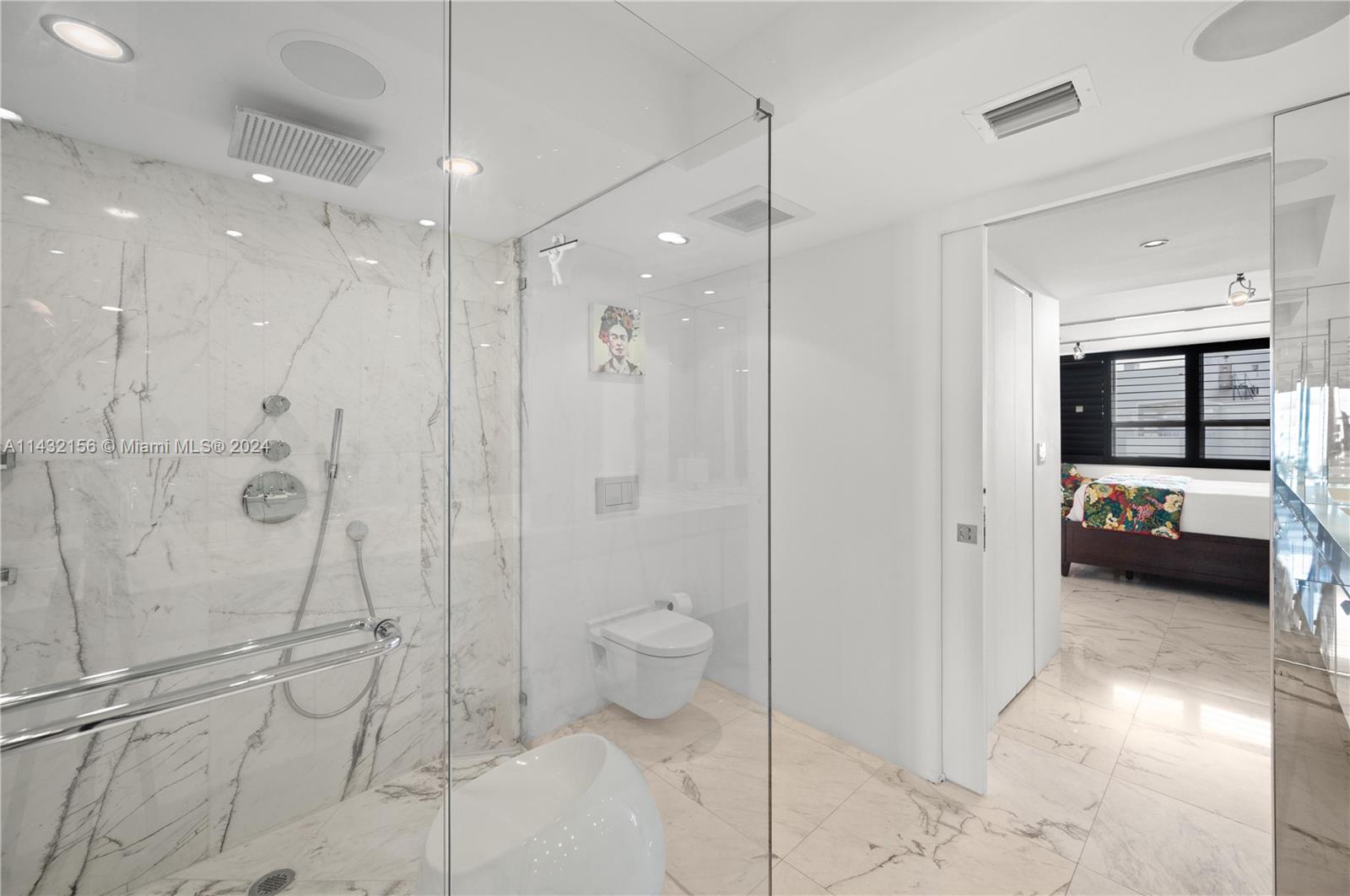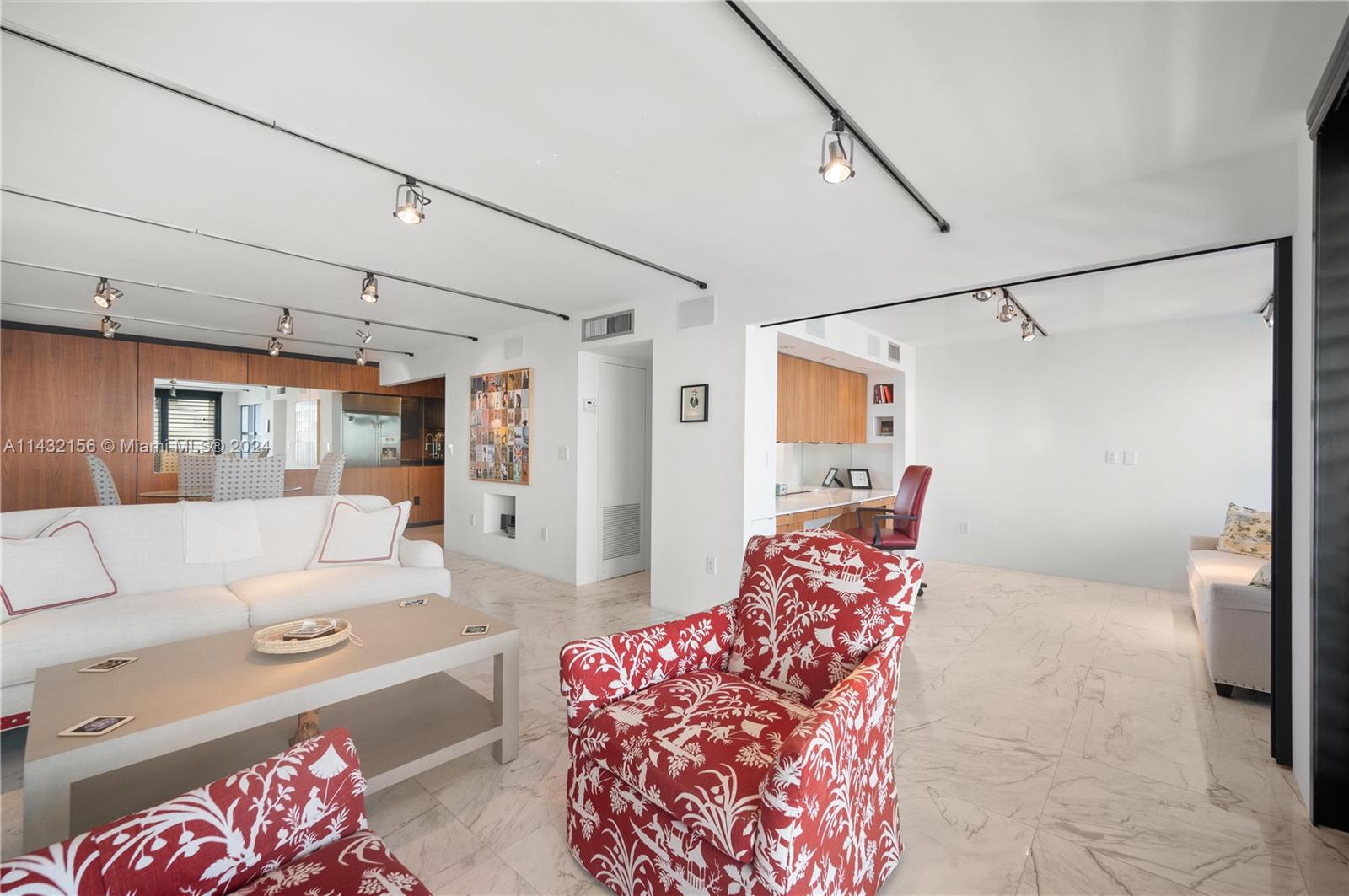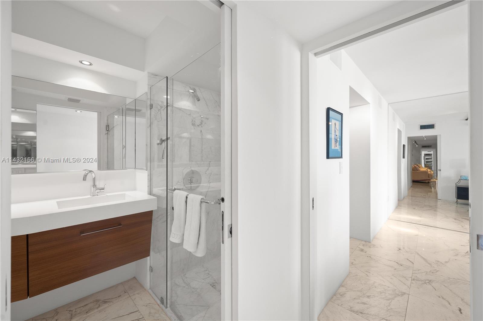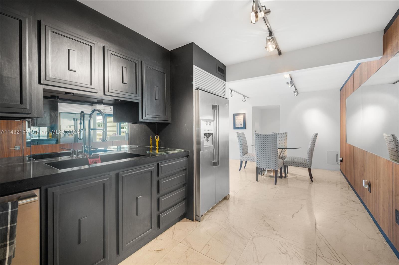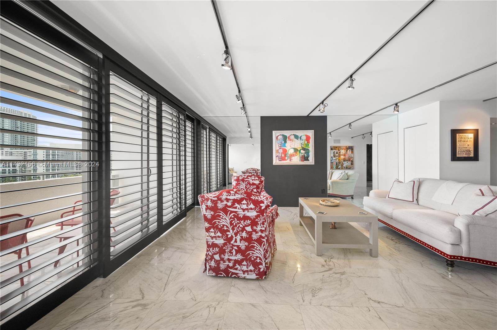 LOBBY reopened and it is STUNNING. Come see this sleek, chic and just BEAUTIFUL unit with glamorous white marble floors, great natural light, dramatic black kitchen & walnut wall panels. Plantation shutters throughout hint at the views beyond. Ample storage, impact windows/doors adjustable closets, barrier free showers. Second bedroom has sliding panels that open into the living room & create privacy when needed. SPECIAL ASSESSMENT PAID IN FULL. Pet friendly building with great amenities. Building updated with new hallways, elevators, fire sprinkler, EV charging, gym ++. Building collects reserves. Matterport 3D tour.
