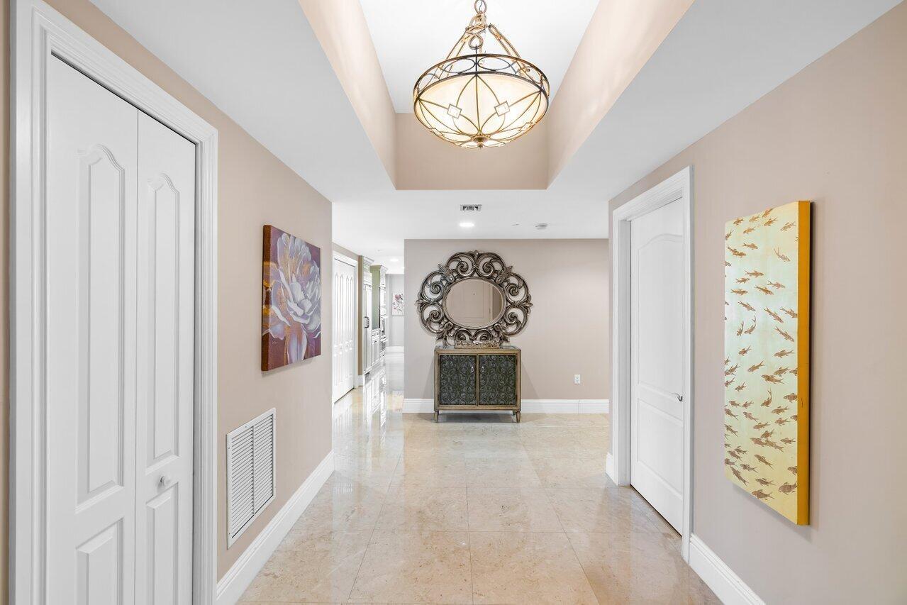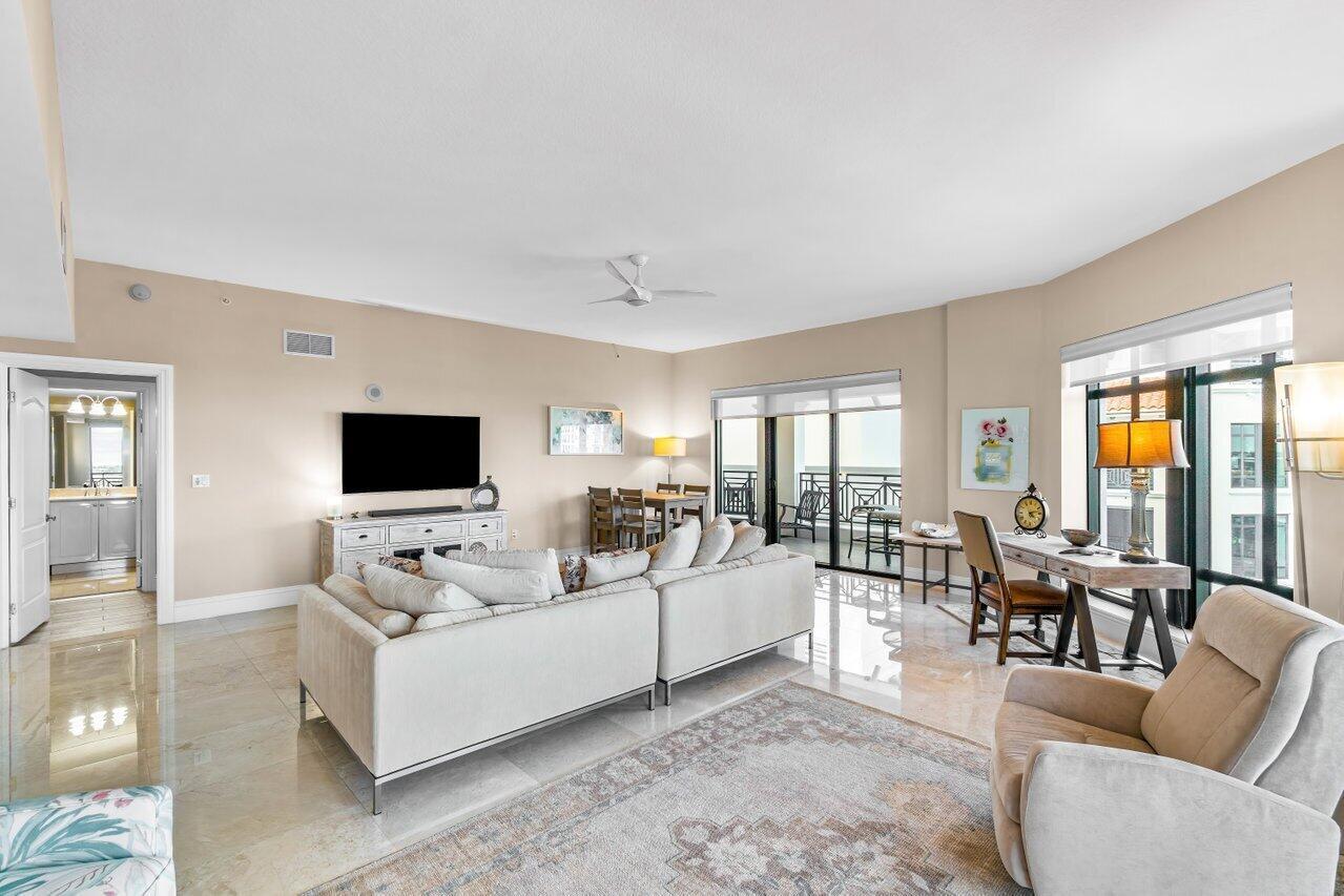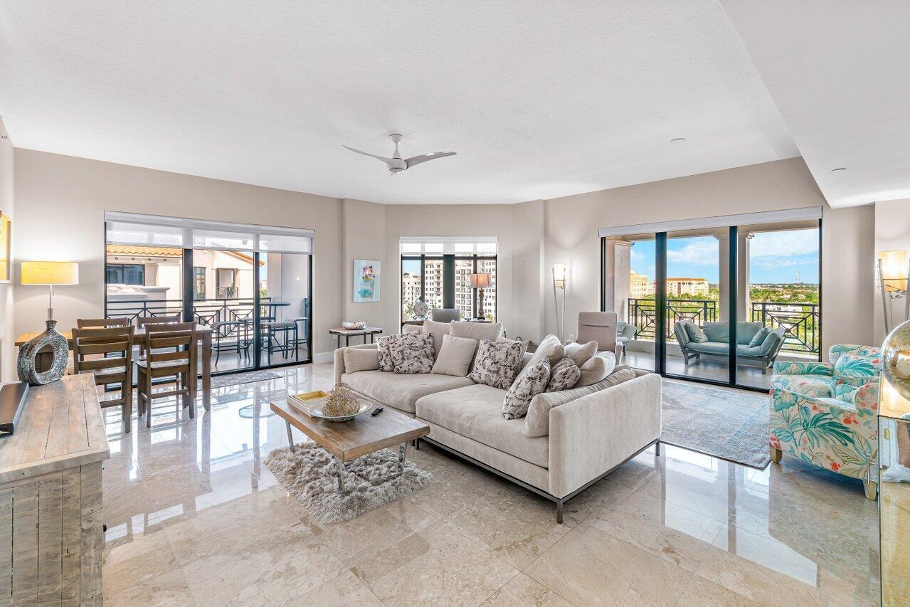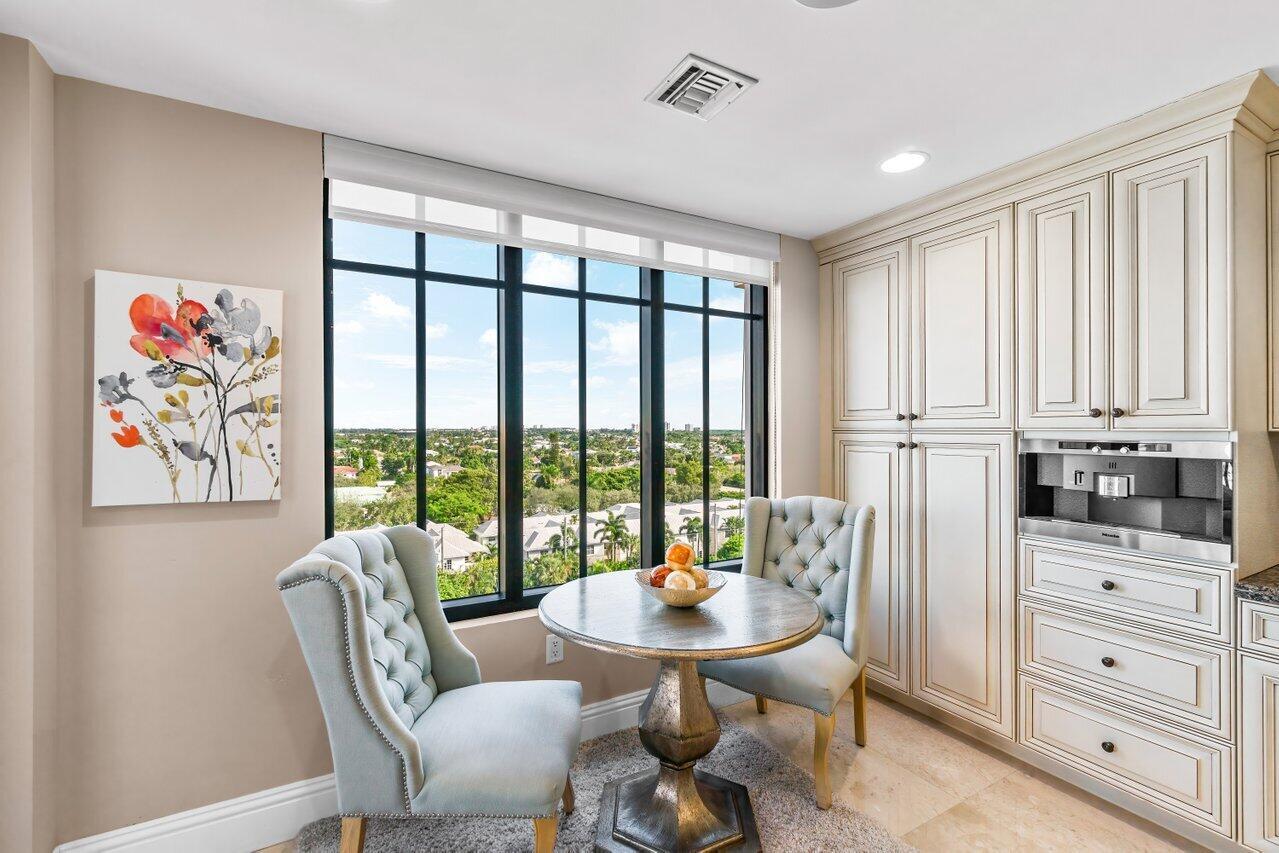 WOW. Lower Corner Penthouse. Northwest exposure, there are beautiful views of the City to the Ocean. High ceilings, oversized balconies, and a split bedroom plan are some of the best features of this fantastic condo. Grand double door foyer, powder room, two bedrooms and an eat-in-kitchen. The master suite features 2 bathrooms and 2 walk-in closets. Available furnished. 2 Parking spaces by the elevator. Located on the corner of Mizner Blvd and Palmetto Park Road this is a fantastic walkable location. Steps from Mizner Park, Royal Palm Place, Shops and Restaurants on East Palmetto and The Boca Raton Beach. The New Bright Line Station is also in walking distance.