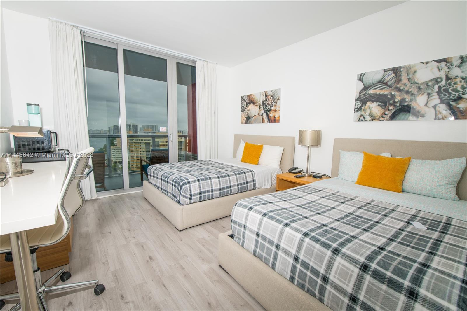 EXCEPTIONAL INVESTMENT POTENTIAL! Flexibility for Daily, Weekly, or Monthly SHORT-TERM RENTALS. This turnkey 2 bed / 2 bath unit is situated in a high-rise featuring on-site Restaurant, Dual Swimming Pools, Round-the-Clock Gym. Option to divide into two separate living spaces for diverse rental possibilities. The one-bed, one-bath suite comes with a well-appointed kitchen featuring stainless steel gadgets, in-unit laundry, a master bedroom with a luxurious king-size bed, and a renovated bathroom complete with a modern shower. The studio layout offers two queen beds, a dedicated bathroom, and ample closet space. Enjoy breathtaking vistas of both the Intracoastal Waterway and the Ocean, by day or night.