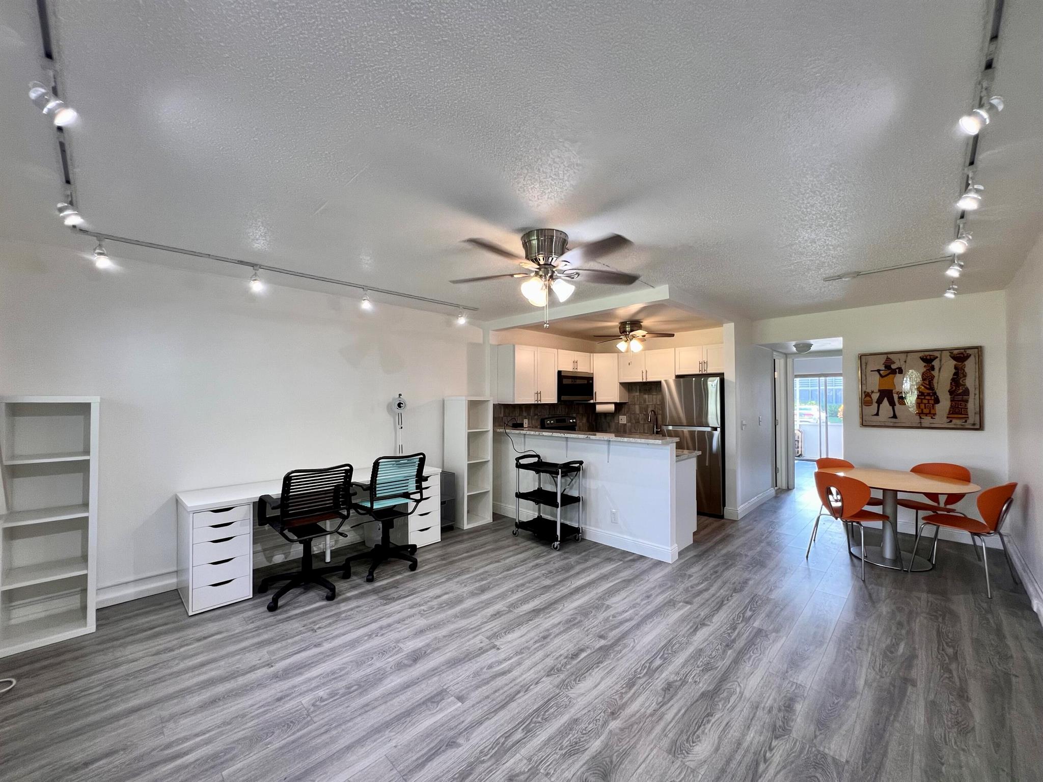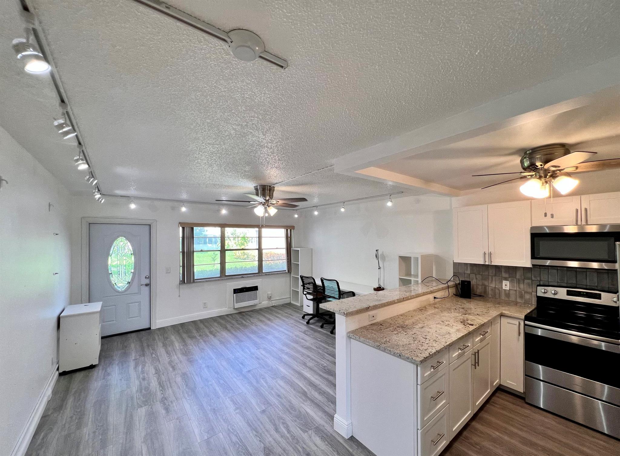PRETTY & MOVE IN READY IN 55+ CENTURY VILLAGE! Light, bright, and beautifully updated very lightly used FIRST FLOOR 1/1 in a convenient location. Updated & open kitchen with white Shaker style cabinets, granite counters, and stainless appliances. Updated bath with step-in shower. Premium vinyl plank flooring throughout. Updated front door and interior doors. Screened lanai with easy access to parking. Nicely maintained building with new roof and pretty resident patio. Convenient location close to the walking path, the main clubhouse, and Hastings Fitness Center. Sold AS IS. Century Village is a 55+ community with so much to offer...