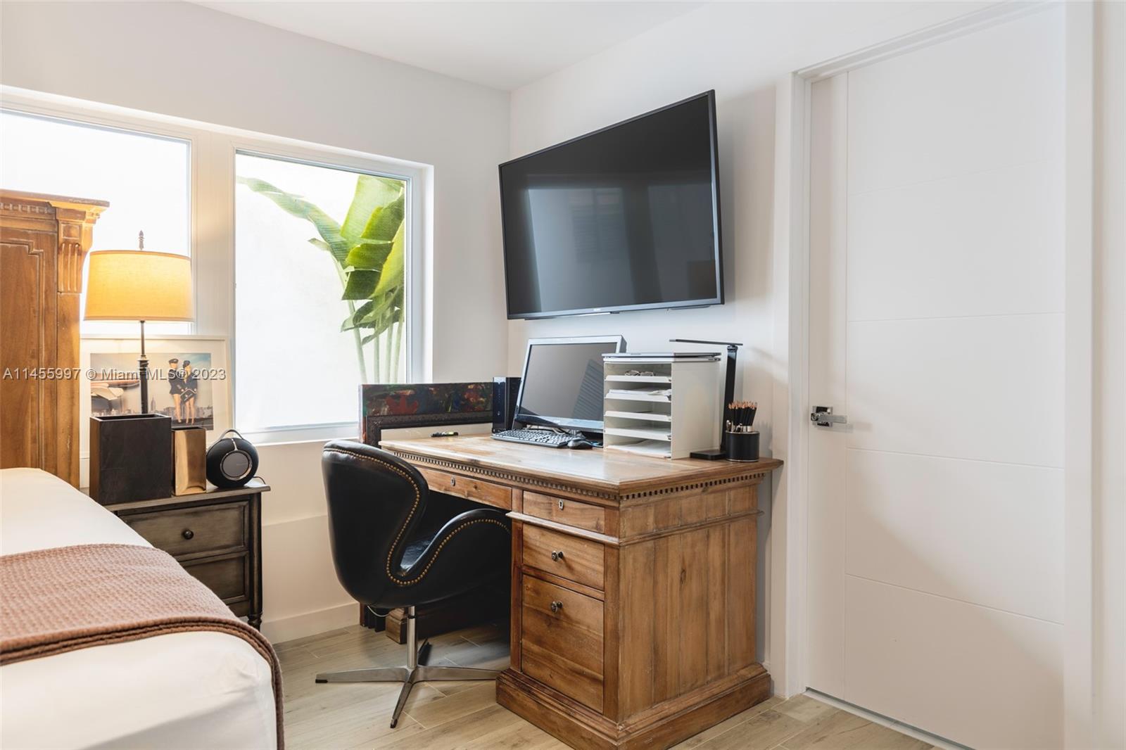 Introducing a chic studio nestled in the heart of Miami Beach's vibrant retail and dining scene. This 348 SF pied-a-terre is perfectly located on the second floor of an Art Deco building fully renovated in 2021 and steps from Lincoln Rd, Beaches, and Convention Center. This stylish space combines the allure of vintage architecture with modern conveniences, offering an ideal urban beach retreat. Features modern finishes throughout with porcelain wood-look tile, S/S appliances, upscale bathroom fixtures, central AC, full-size W/D, and impact windows. Seller to include two wall-mounted flatscreen TVs. Cable, internet, and reserves are included in the low monthly maintenance fee of $283. Residential permitted street parking available and garages nearby with spaces for monthly rent.