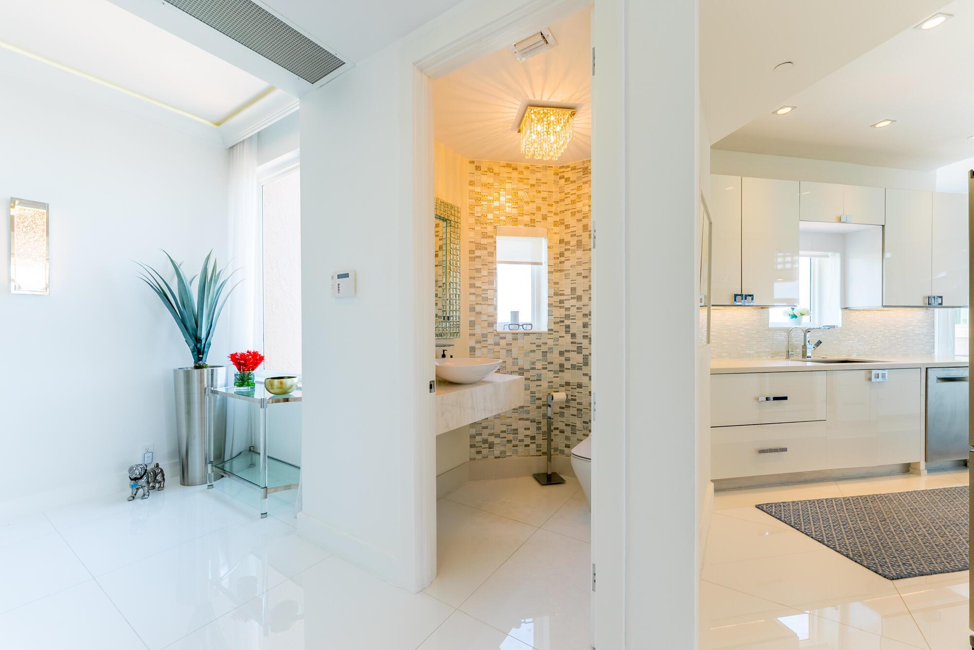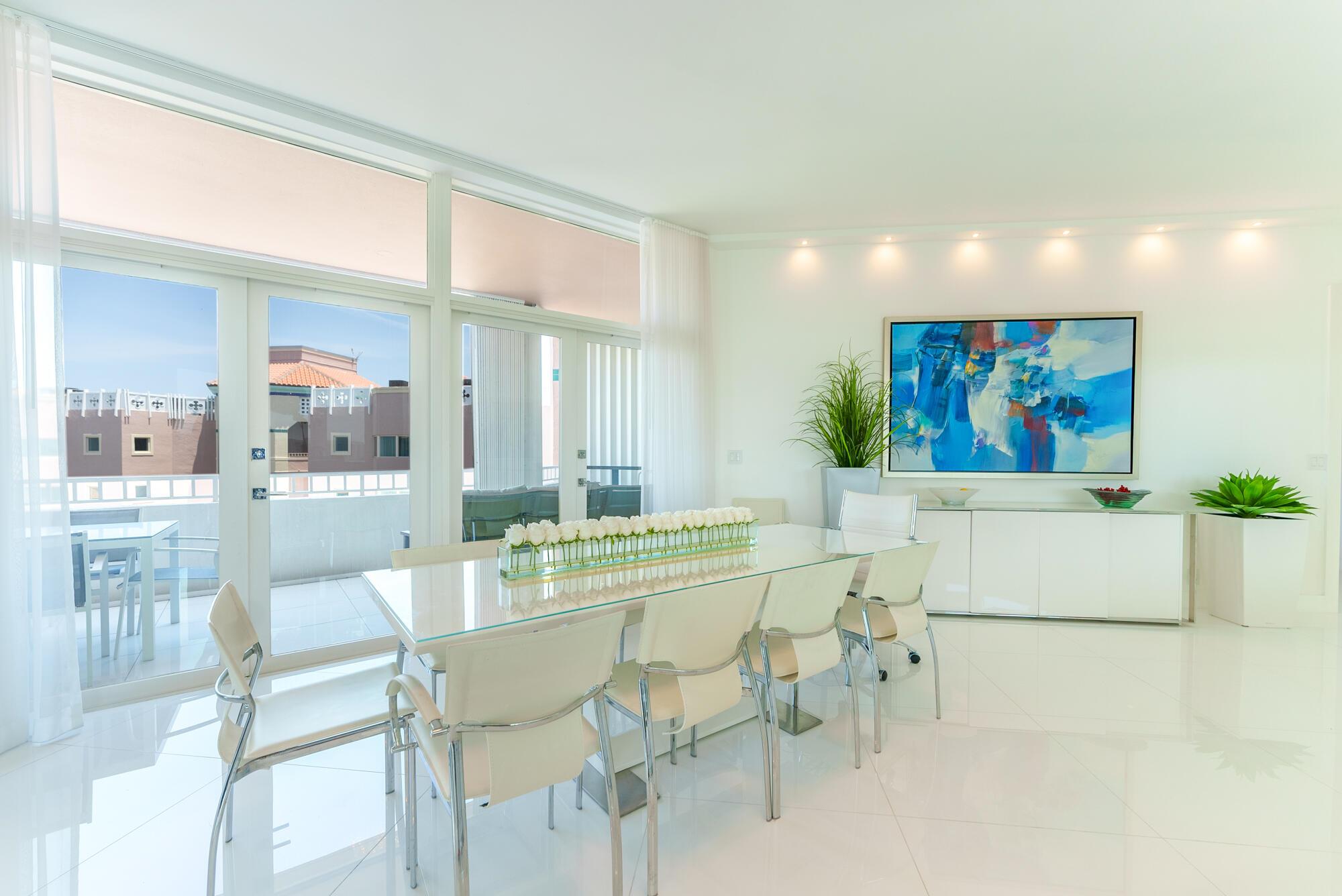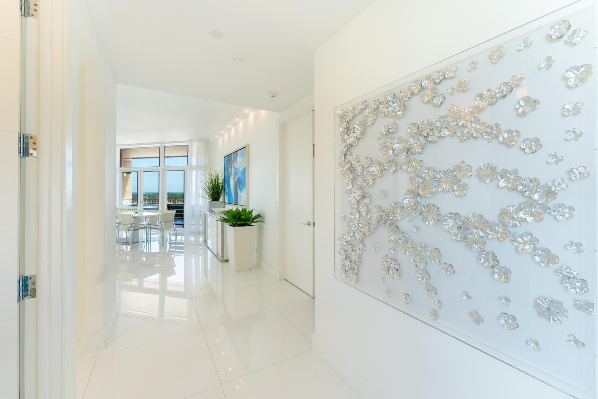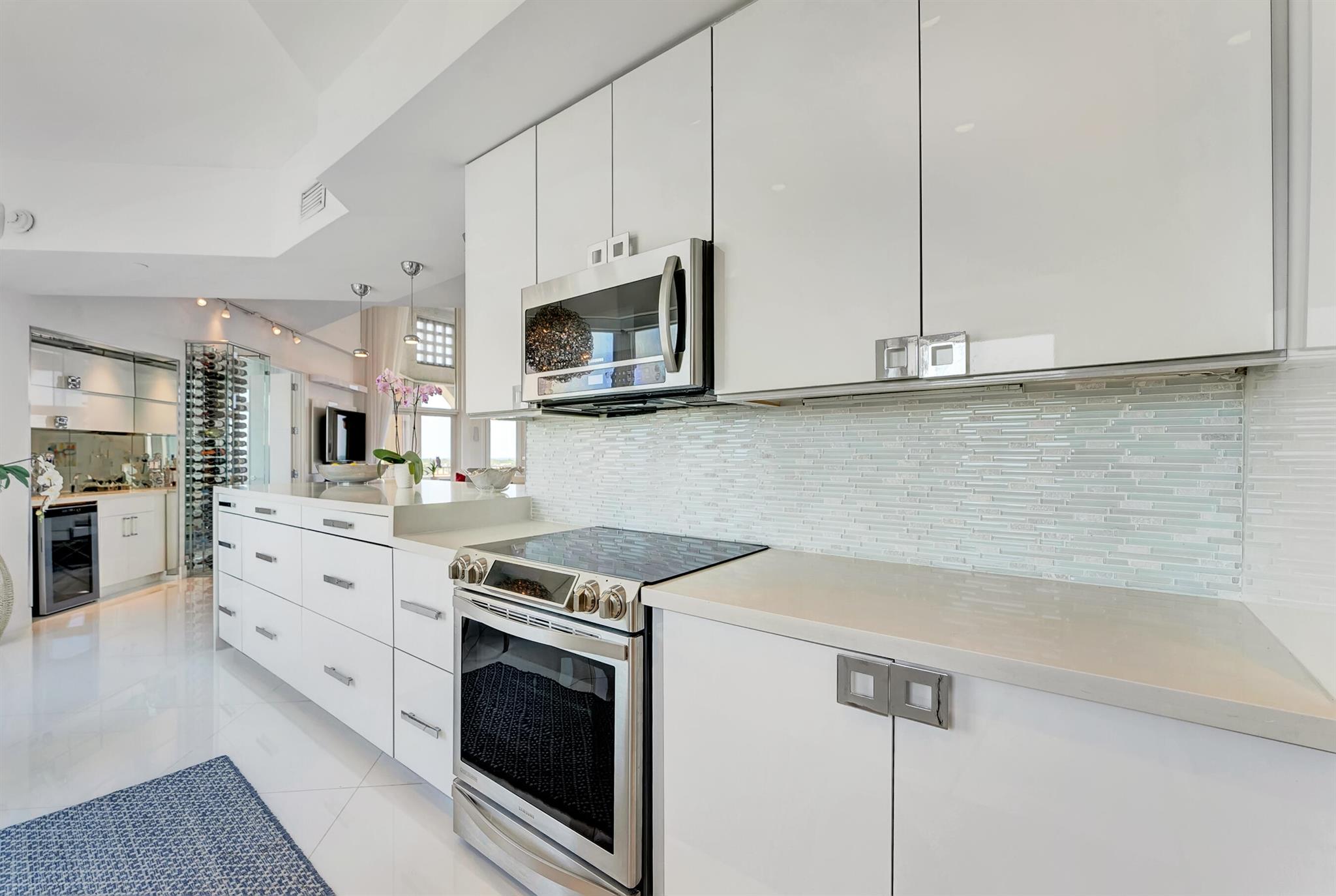 Welcome to your dream home complete with picturesque panoramic views of the ocean, Intracoastal, city, and golf course. This Sophisticated Penthouse residence boasts a spacious floor plan filled with natural light and high ceilings. With every room providing access to the expansive wrap-around terrace, you can enjoy breathtaking views of South Florida's beautiful skyline and the sparkling waters of the Atlantic Ocean. Impeccably renovated, the residence features striking interiors with plenty of living space and modern touches throughout. Home chefs will love the custom eat-in kitchen with white gloss cabinetry and quartz counters, a wine bar, and luxurious 36''x36'' white glass flooring.