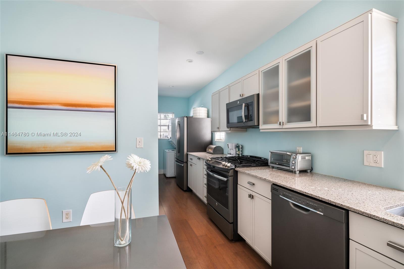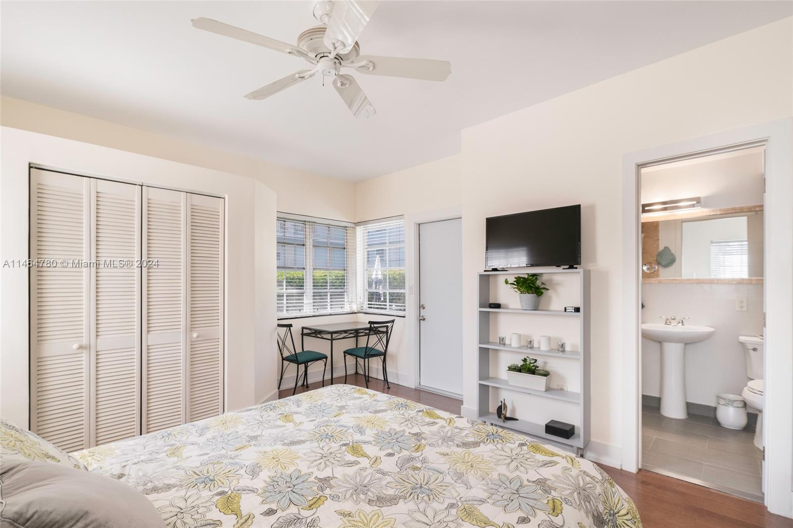 Live the Art Deco dream on the most beautiful, tree-shaded street in South Beach. Casablanca condo is the perfect retreat in the heart of Miami Beach. This South East corner unit has a private entrance, so no hallways or stairs. Ideal for dog lovers (and no weight limit per condo docs). Split two bedroom plan with two en-suite bathrooms. Newer wood floors, central AC, smooth walls and ceilings, updated kitchen and stainless steel appliances, full size washer/dryer in unit. One private parking space. Windows on three exposures fill the unit with light. Meridian Ave is famous for its shade trees by day and lights at night. Central location near the gardens of Flamingo Park, tennis courts, public pool and the ocean. Invesator friendly with 6 month minimum rental, OK first year