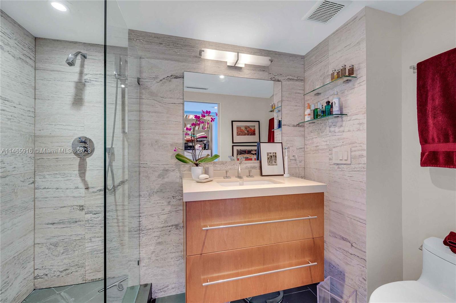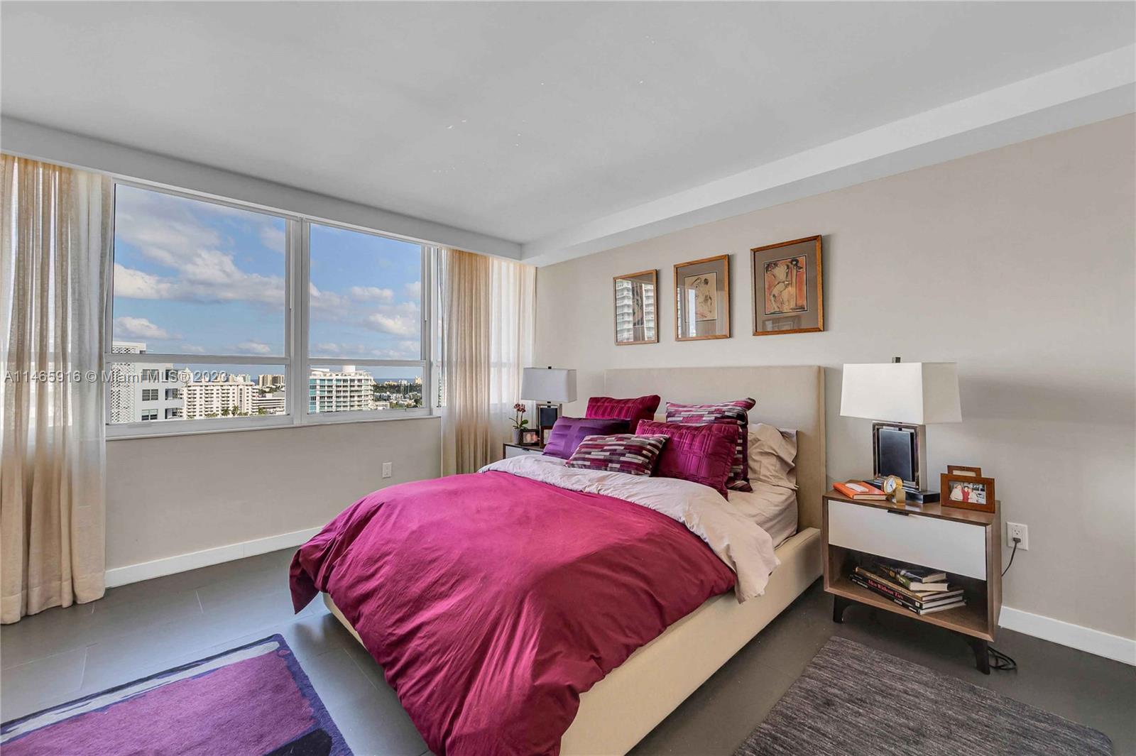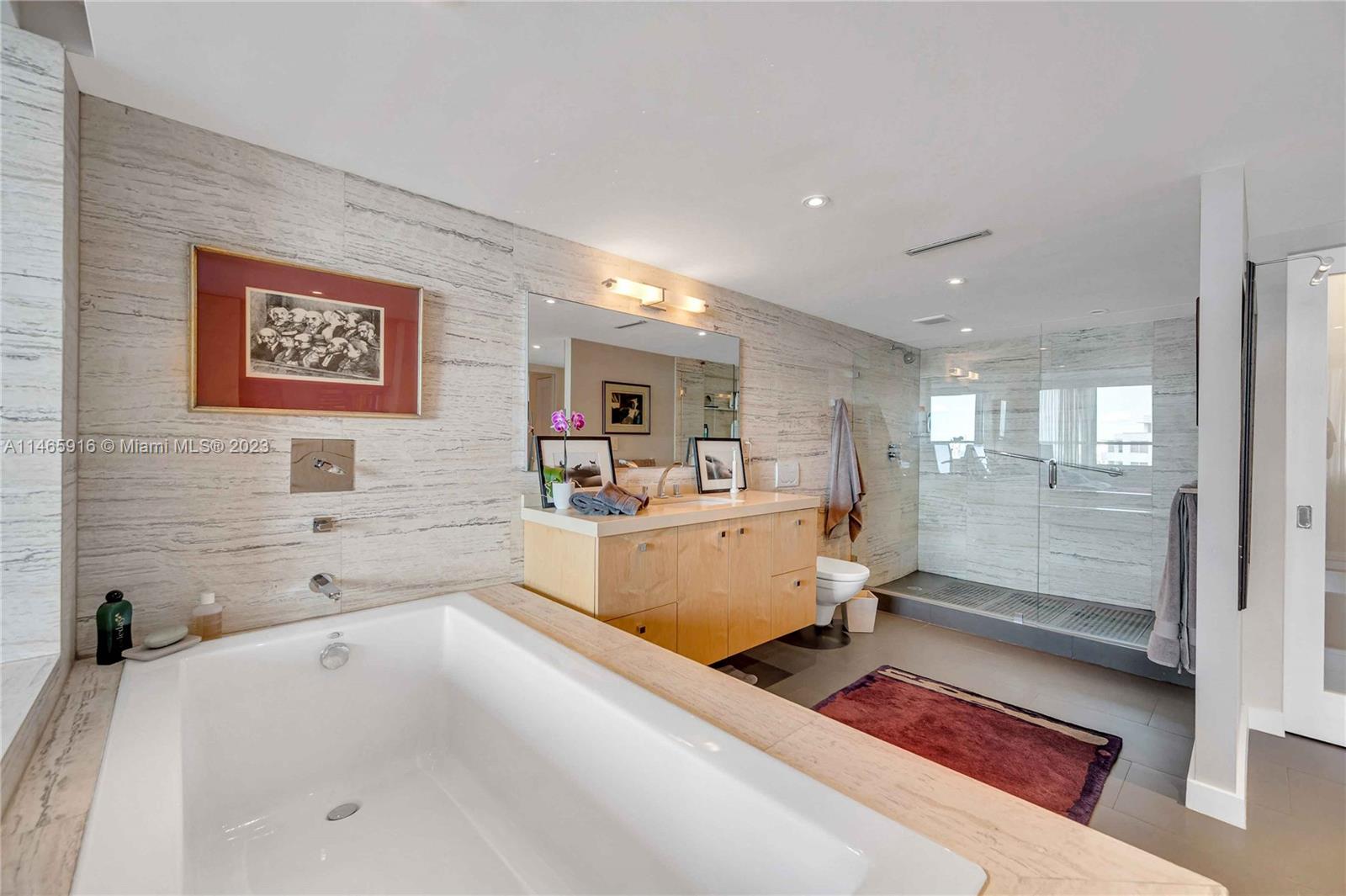 What a...View! Price! Location! NE corner with expansive views of Bay, Marina, Belle Isle Park, & SoBe skyline. Thoughtfully renovated with quality materials & finishes. Custom kitchen equipped with Sub Zero refrigerator, Wolf double ovens/induction cooktop, microwave drawer, & wine cooler. Large matt grey porcelain tiles throughout, impact windows/doors with powered shades, PLUS hardwired internet & speakers for uninterrupted work & play. Both bedrooms have ensuite bathrooms with ample storage. Main has separate soaking tub & oversized shower. Large open balcony adjacent to living room perfect for sunrises, afternoon cocktails, or just enjoy the breeze & views. Updated building with reserves. Completed updates include hallways, internet, fire sprinklers, EV charging, & gym. Lobby underway