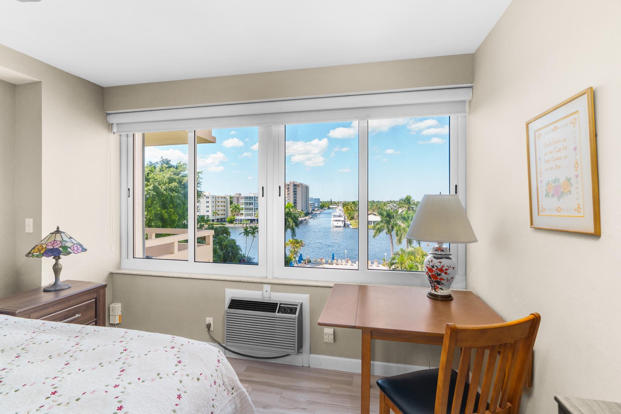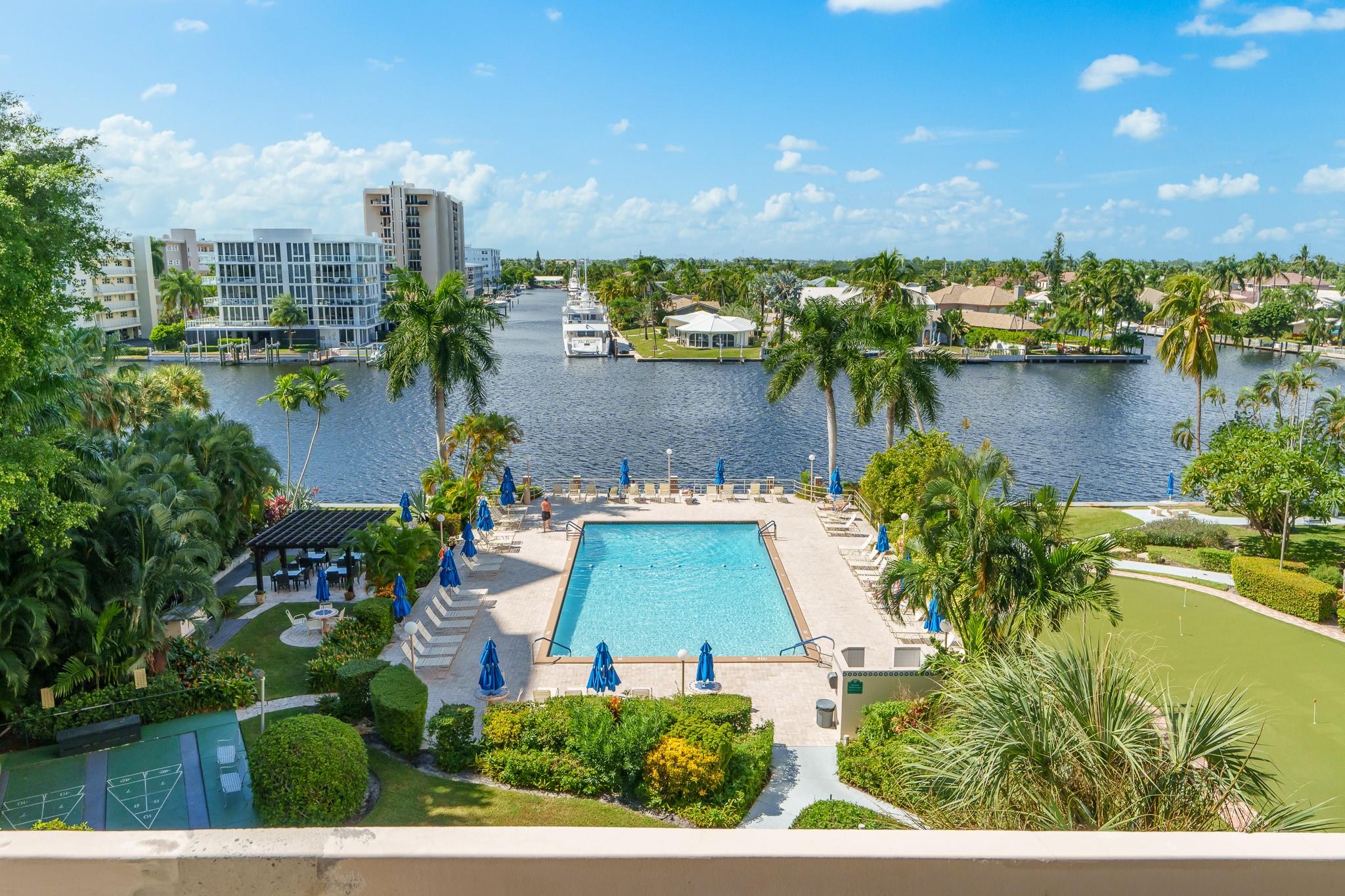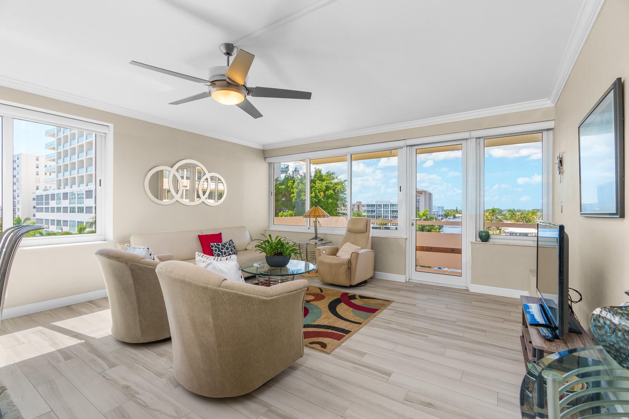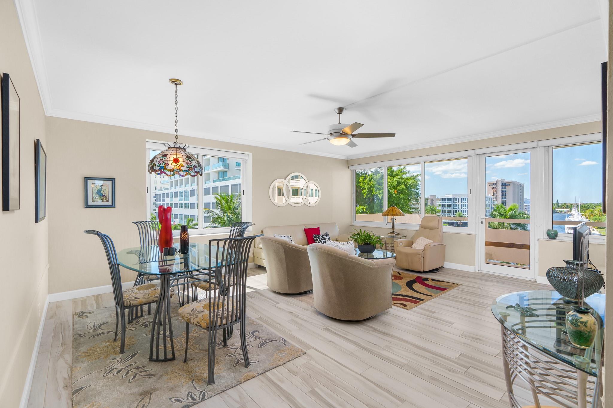 Enjoy stunning million-dollar intracoastal views and sunsets from every room! This move in ready home features an updated kitchen and wood plank porcelain tiles throughout. This home also offers hurricane impact windows, and central AC for added peace of mind. Coral Ridge Towers offers all the conveniences of beachside living, with the luxury of 24/7 security and professional onsite management. This 55+ Co-Op community is located on the barrier island with shopping, grocery stores and restaurants within walking distance. The building offers an array of amenities including a heated pool on the Intracoastal surrounded by lush tropical landscaping, gym, library, putting green, and more. You will love living here!