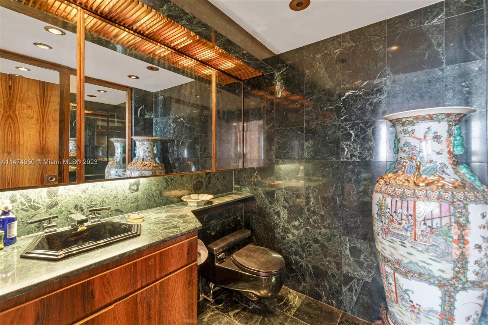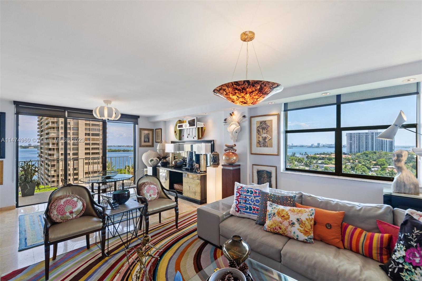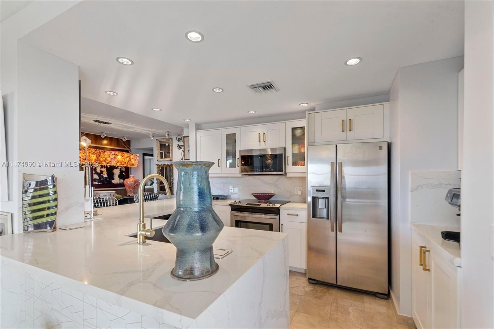 Fabulous 2 bed, 2.5 bath large corner unit measuring 1,754 SqFt. Immaculate showpiece! A grand entrance leads you to the breathtaking water views from the highest floor just below the PH level, in the most desired line. A completely renovated unit boasting cream travertine floors, custom LED ceiling lights, custom California closets & cabinetry, stunning remodeled baths, top-of-the-line finishes, and an open white marble kitchen with modern S.S appliances. The oversized bedrooms with ensuite baths, offers stunning views and the guest bedroom offers a second and independent entrance from the hallway. This unit also boasts a full laundry room which is very rare. With a spacious waterfront balcony and hurricane shutters on every window, this corner unit has it all. Chandeliers do not convey