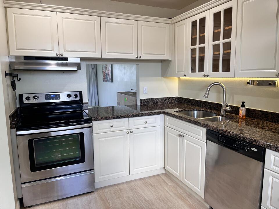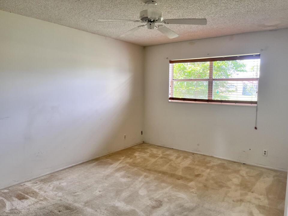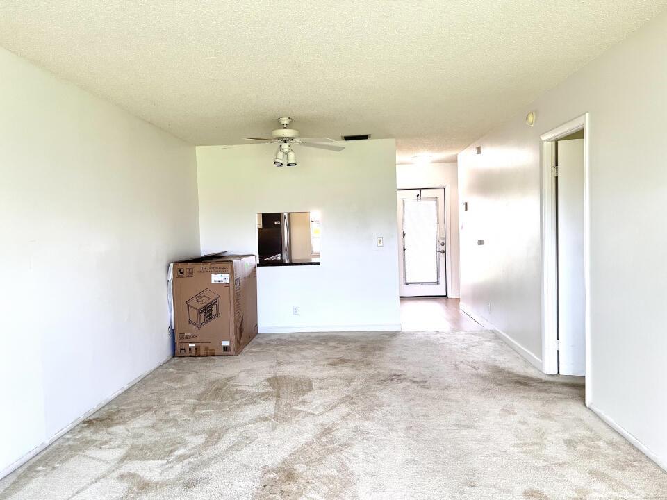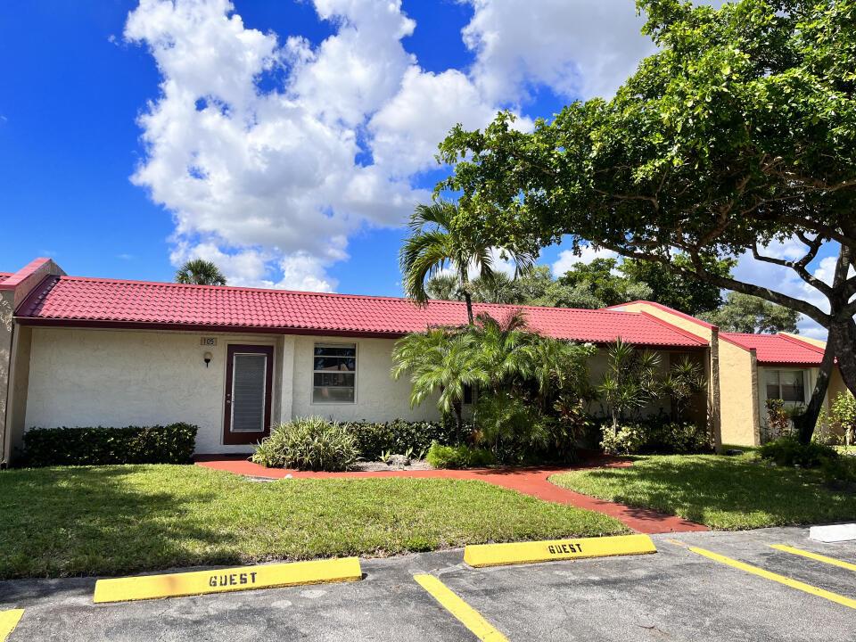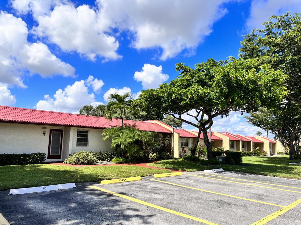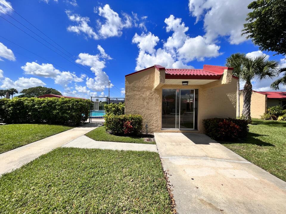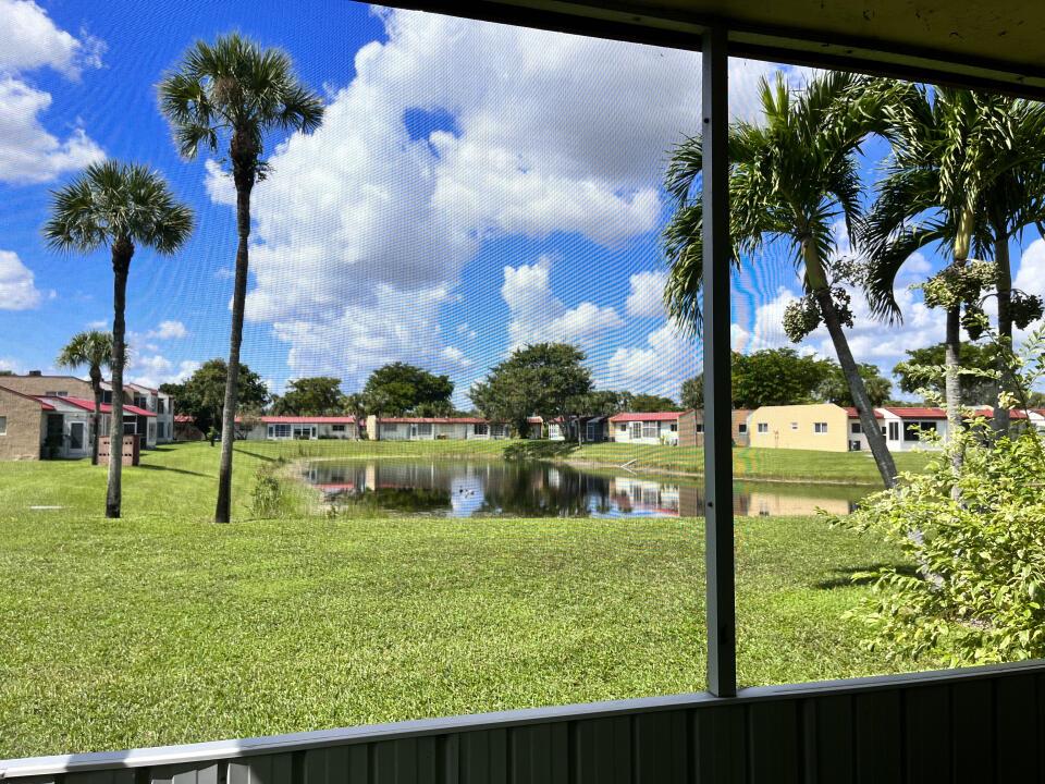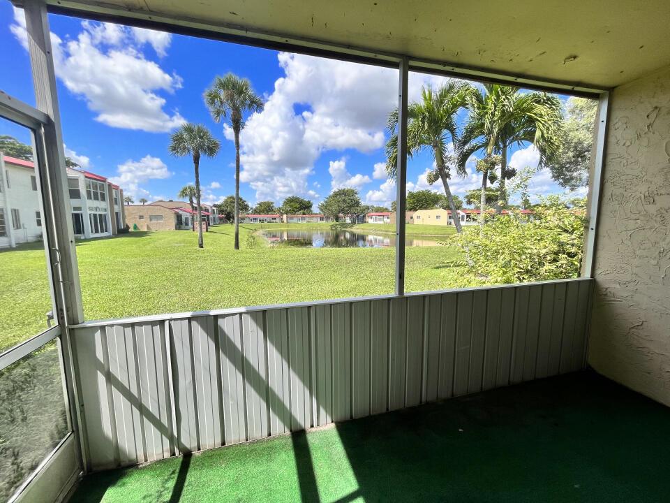 Quant 55+ single story villa with lake view is steps away from pool, mailroom, and laundry facility. Gated community, guard, passkey entries and alternate resident only entry/exit near condo location. Perfectly located minutes away from groceries, shopping, PBI Airport, 20min to the Beach. HOA includes water, master insurance coverage, maintenance for exterior, lawn care, community amenities-Tennis Courts, Pools, Hot Tubs. Kitchen features stainless steel appliances throughout. In unit walk in storage room with AC Unit, and Hot Water Tank. Large living / dining room area well lit from large sliding glass doors to screened enclosed porch. Master Bedroom has full bathroom with tub and accessibility handles. New bathroom vanity in box pictured in living room if buyer wants its included.