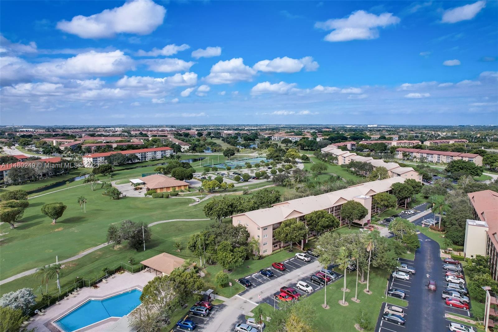 CORNER, 1ST FLOOR UNIT! VIEWS OF GOLF COURSE AND POOL. Don't miss out on this incredible opportunity to own a 2 bedroom, 2 full bath corner, first floor condo in Century Village! This unit offers a split floor plan for privacy, as well as a screened-in patio and extra-large primary bedroom with walk-in shower and closet. Plus, enjoy the added convenience of a washer and dryer in the unit. The 55+ community offers low-maintenance living, with maintenance of the grounds, clubhouse, pool, tennis, golf, amenities, clubs, activities, and bus service. Water, Cable, Wifi and Building Insurance Included. This condo is priced to sell as is.