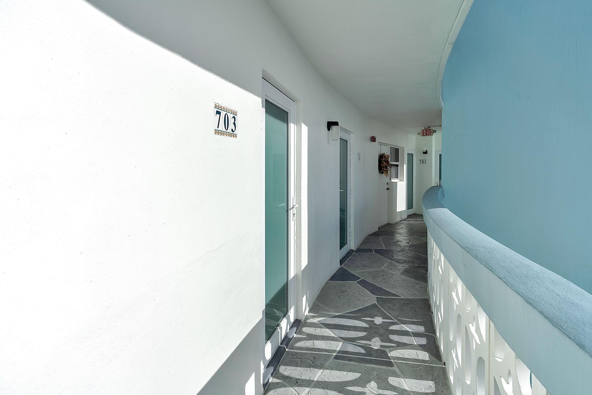 Ocean views from this subpenthouse in sought after boutique condominium from Living room, main bedroom and balcony. 2 blocks from beach. Euro kitchen with granite counter tops, stainless steel appliances, all impact windows and doors, tankless water heater, laminate flooring; tumbled marble tile and granite bath, storage unit. Ready for your update. Charming mid century building offers renovated lobby, lounge and gym, heated pool, BBQ Area, and 8th floor sun deck, all within a short walk to great restaurants, and shopping. On site management office. Enjoy coffee on the balcony, and a pet friendly community! Make this condo yours and enjoy the Beach life!