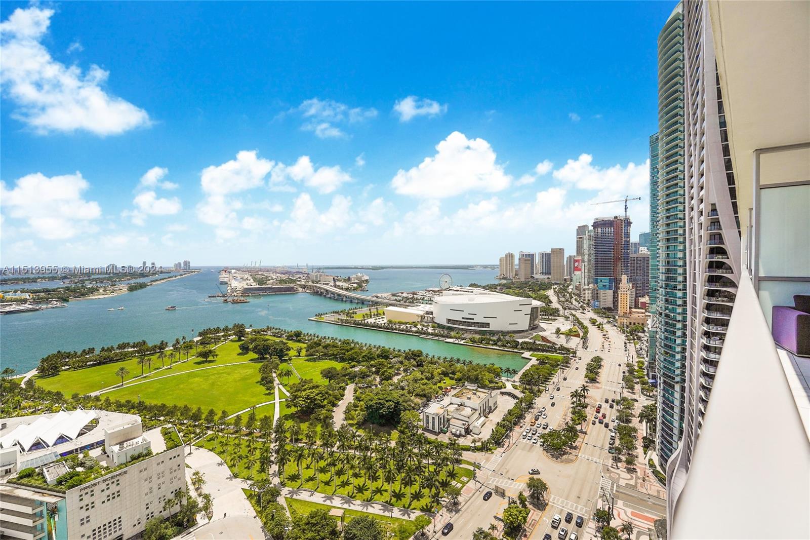 Completely Renovated 2 bed, 2.5-bath unit with stunning water views! As you step into this flow-through unit, two private elevators welcome you into a spacious 1477 sqft space plus an expansive terrace. The breathtaking views encompass Museum Park, Biscayne Bay, Miami Beach, and the ocean, treating you to spectacular sunrises from the master bedroom & living room. Enjoy a brand-new kitchen, updated bathrooms, floor-to-ceiling windows, and ambient lighting. Unit boasts GE Monogram appliances, laundry room with built-in desk & ample storage, brand-new full-size washer & dryer, New Bosch HVAC, custom walk-in closets, and many designer touches throughout. The amenities are equally impressive including a spa, fitness center, 2 pools, concierge, restaurants, hotel, a private beach club & more.