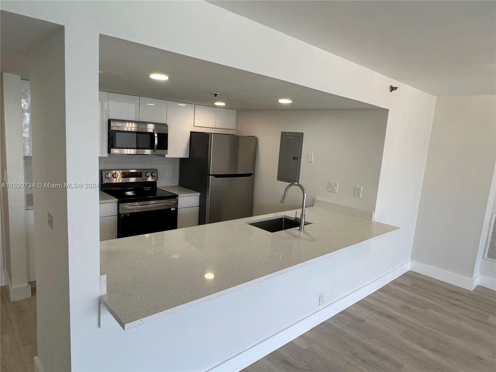 Beautifully remodeled 2bed/2bath unit with water views overlooking renovated swimming pool & tropical terrace area. All work was done with permits. New modern kitchen, bathrooms, flooring & lighting. Open split floor plan. Extra-large balcony. New A/C installed in 2024. One deeded covered garage parking spot. Additional parking can be purchased or leased. Security and management on site. Tenant in place until October 31, 2024. Current tenant pays $2,900/monthly. No Special Assessments. Management also says they have enough reserves to cover upcoming cost for 40 yr. recertification