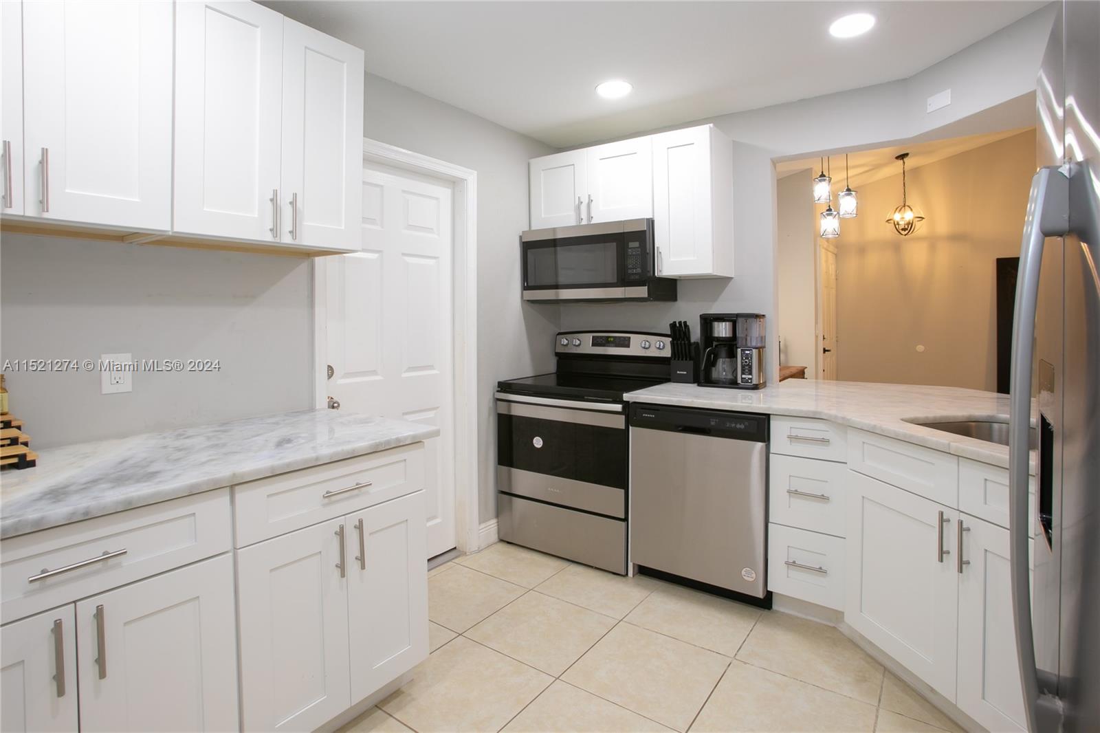 Very strong association. Will qualify for a 5% down conventional. Recently updated 2/2 first floor condo coach home with garage boasting a modern interior. Large stone ceramic tile throughout. Updated gorgeous chef's kitchen with white shaker style cabinets, stunning quartz countertops, stainless appliances and stainless sink. Living room boasts lofty, vaulted ceilings. Master bath and guest bath have been tastefully updated. Screened patio with open garden views. This one has it all. Community is gated, community pool, exercise room. Perfect location to shopping and highways with beaches a mere 6 miles away. Maintenance includes security gate, lawn care, exterior insurance, basic cable, trash, reserves collected for roofs and painting.