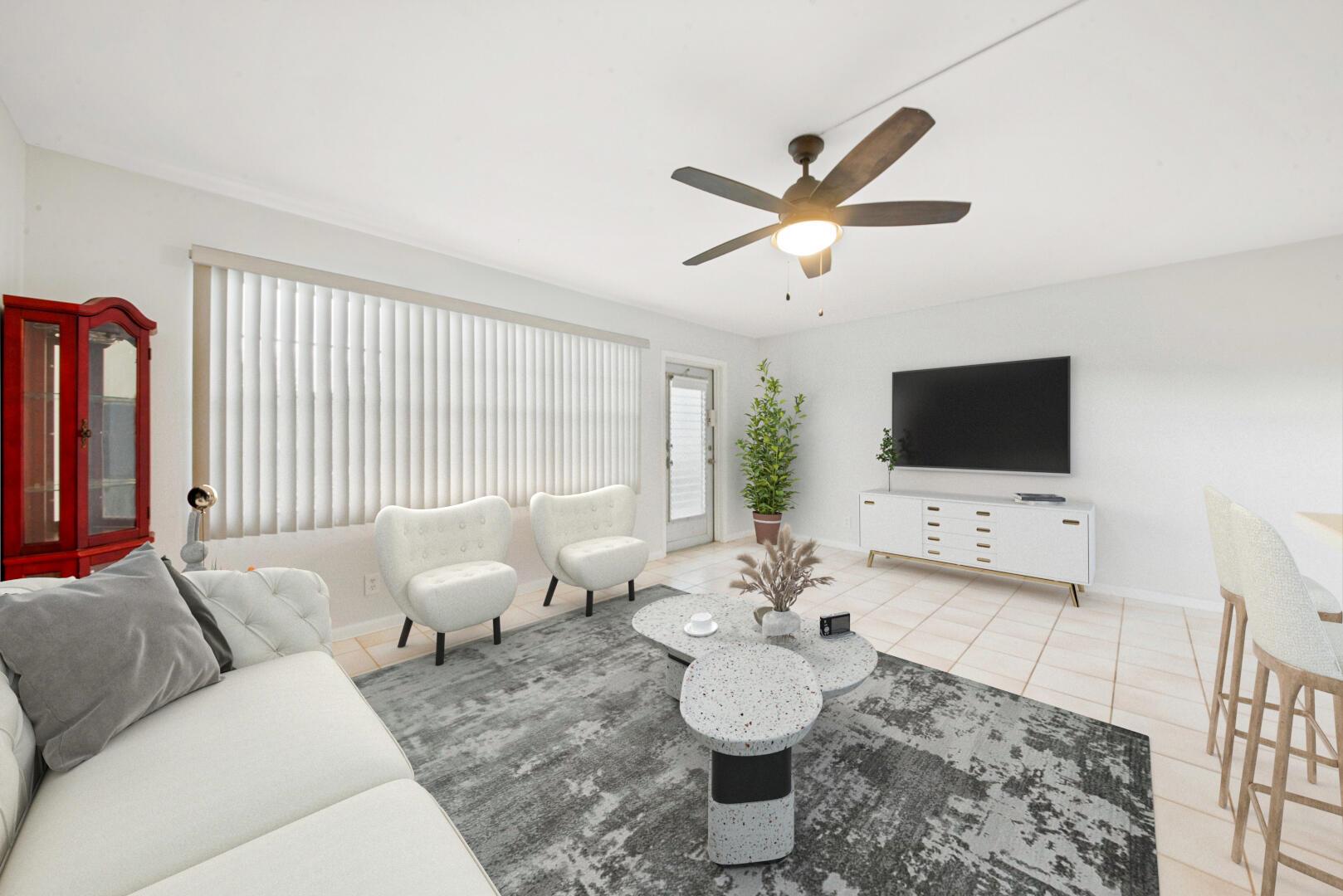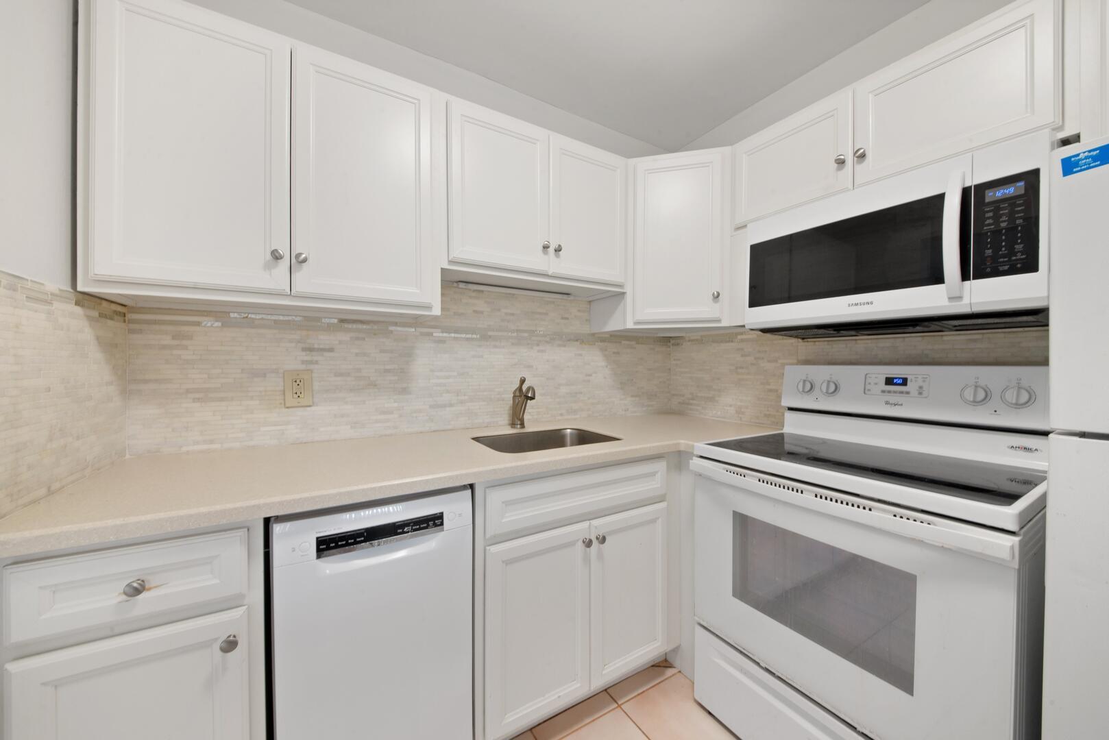 Charming 1 Bedroom Condo with Dream Kitchen in Century Village. Welcome to your tranquil retreat in Century Village! This delightful first-floor condo offers an inviting open floorplan, perfect for comfortable living and entertaining. Step inside to discover a spacious living room seamlessly connected to a cozy dining area, all adorned with neutral flooring that complements any decor style. The heart of this home is the dream kitchen, boasting timeless white cabinets, a stylish tiled backsplash, and a convenient snack bar for casual meals or gathering with guests. Imagine preparing delicious meals while enjoying ample counter space and modern appliances.