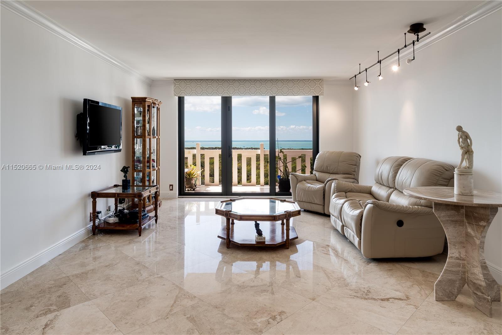 Experience breathtaking panoramic views of the ocean, Bay, and State Park from this exceptional residence. Coveted South exposure offers an abundance of natural light throughout. Immerse yourself in this beautifully renovated split-plan model, featuring light natural stone flooring, an inviting open kitchen, and custom wood cabinetry and moldings. This residence combines stunning vistas with a meticulously designed interior. Easy to showcase, this property invites you to indulge in a lifestyle of both serenity and a true island living. Upper garage parking space #83.