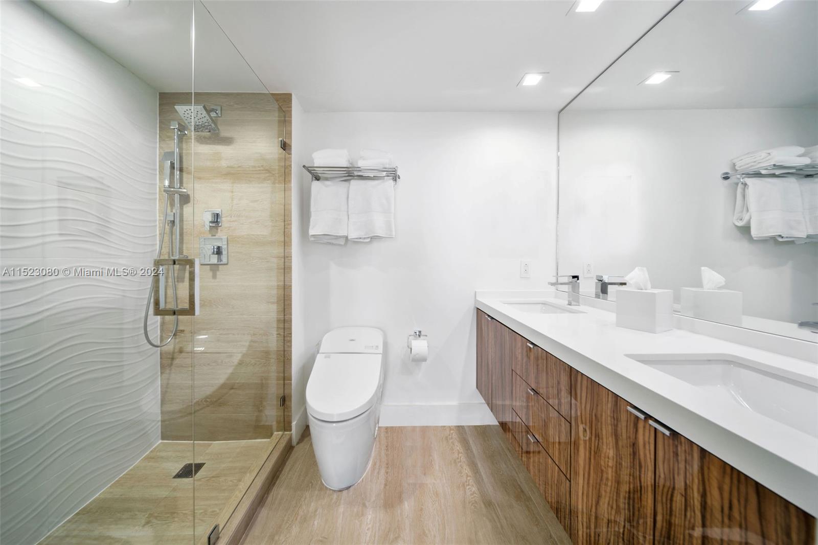 Rarely available high floor corner unit at 650 West. This meticulously renovated 2/2 condo showcases an optimal floor plan with two en suite bedrooms and an open kitchen and living area perfect for entertaining. Revel in a modern aesthetic highlighted by porcelain floors throughout the unit and balcony. Spa-inspired bathrooms, a Jacuzzi tub, chef's kitchen with stainless appliances, wine cooler, full-size W/D, custom closets, and high-end lighting and window treatments add to the allure. With a new A/C unit and the entire space freshly painted and turnkey, this residence is an ideal choice for the most discerning buyers. Seize the opportunity to embrace a luxurious lifestyle with amenities and breathtaking panoramic views of Miami, the Islands of Biscayne Bay and The Best of South Beach.