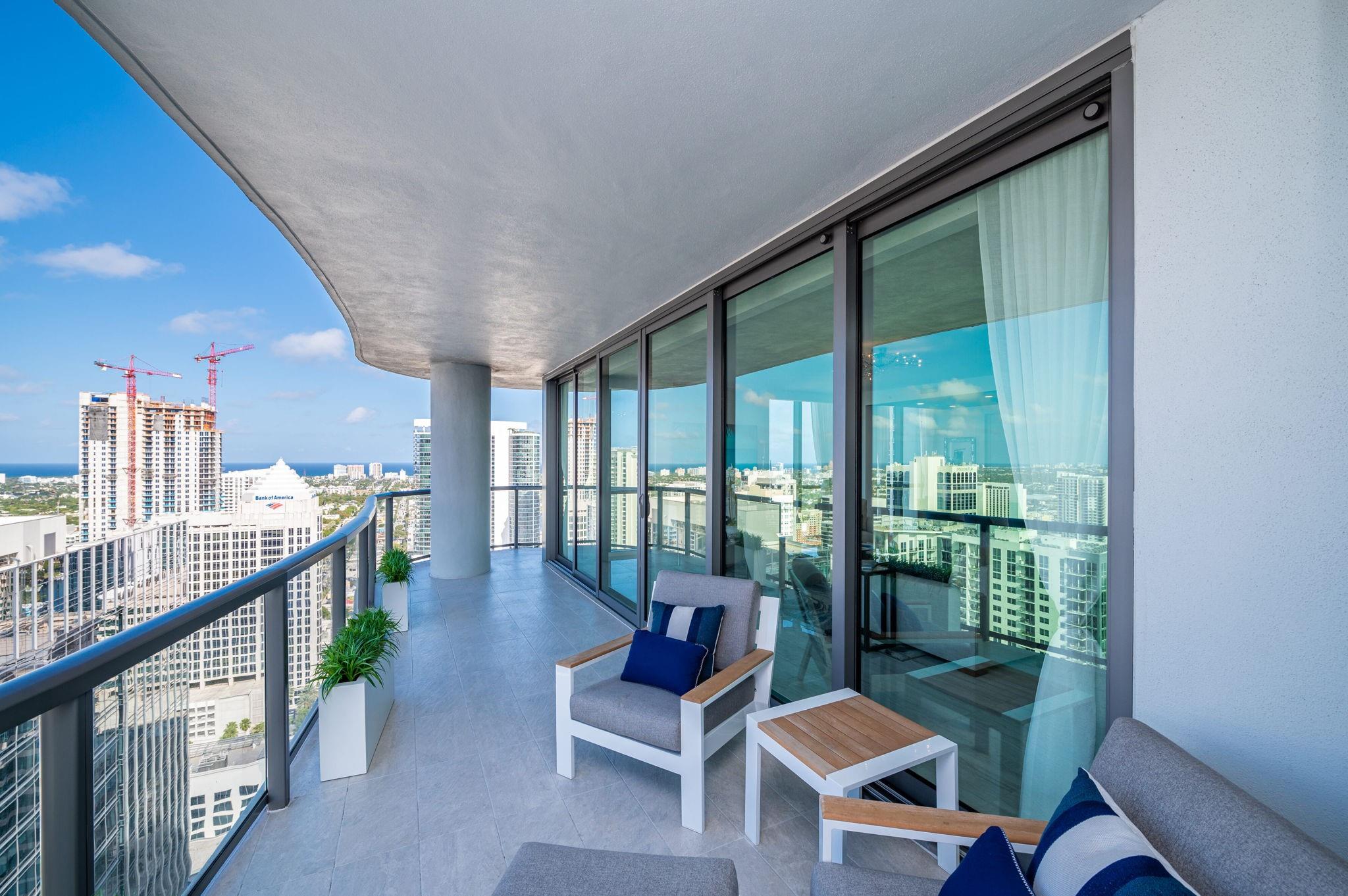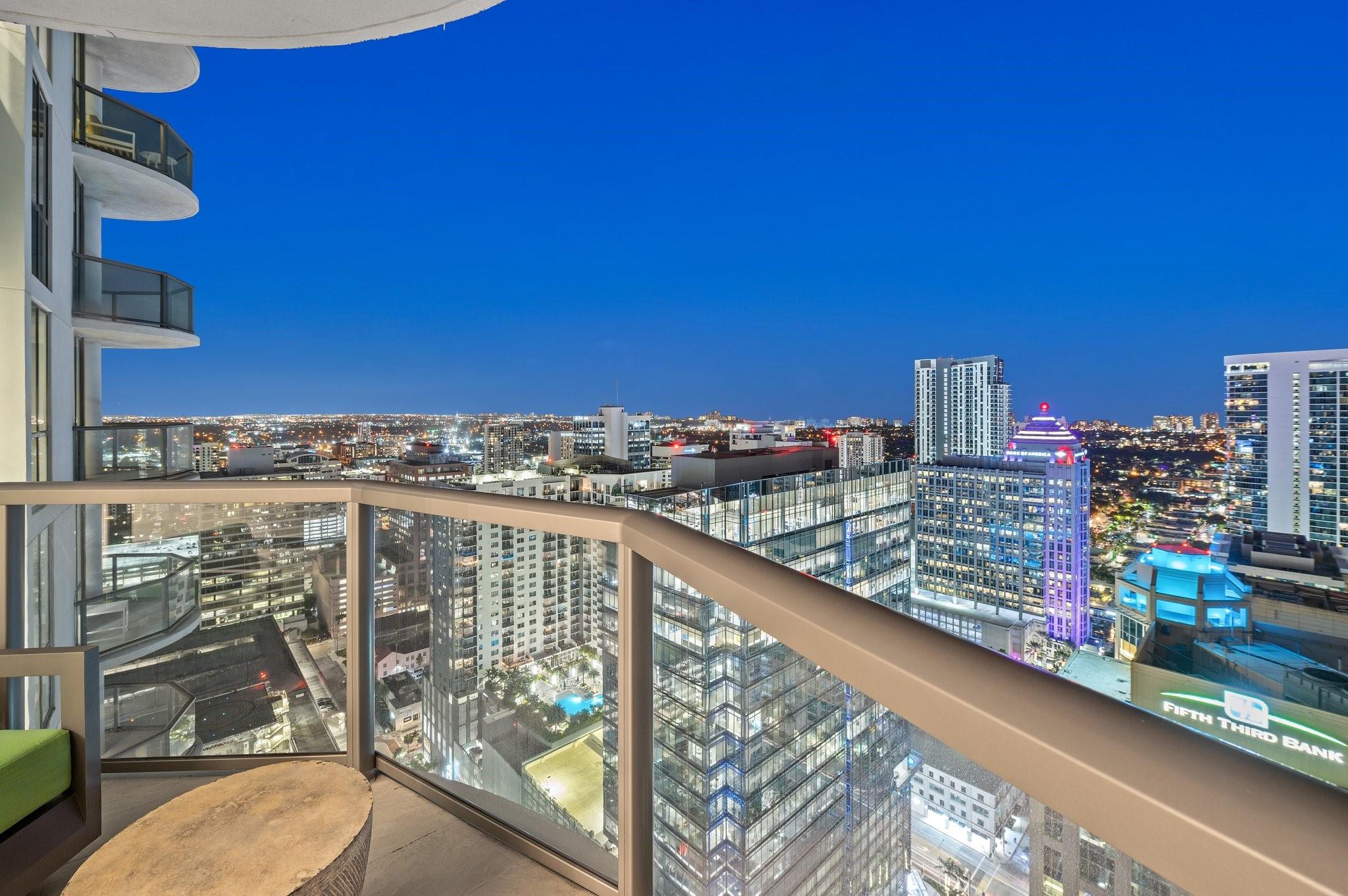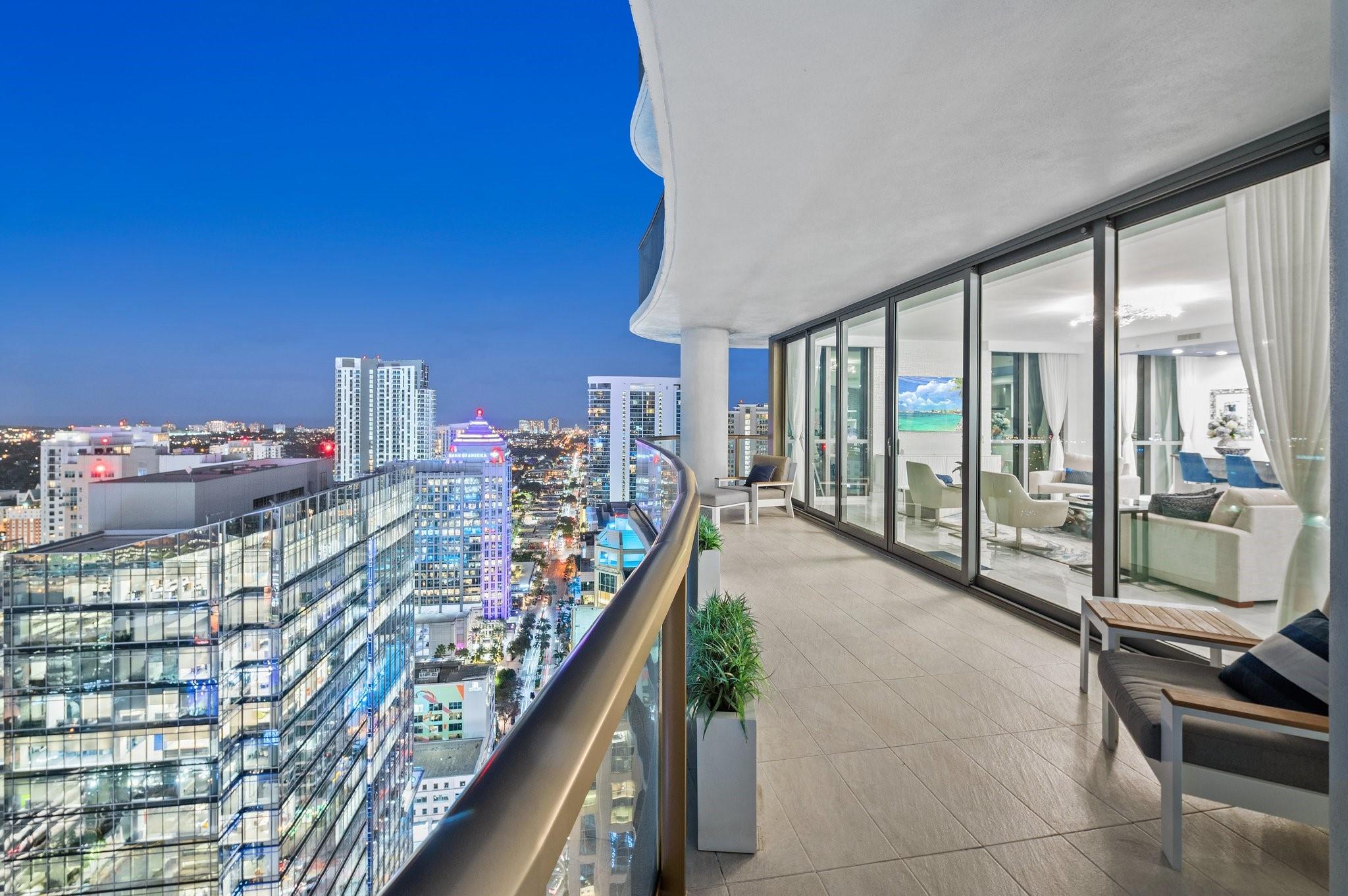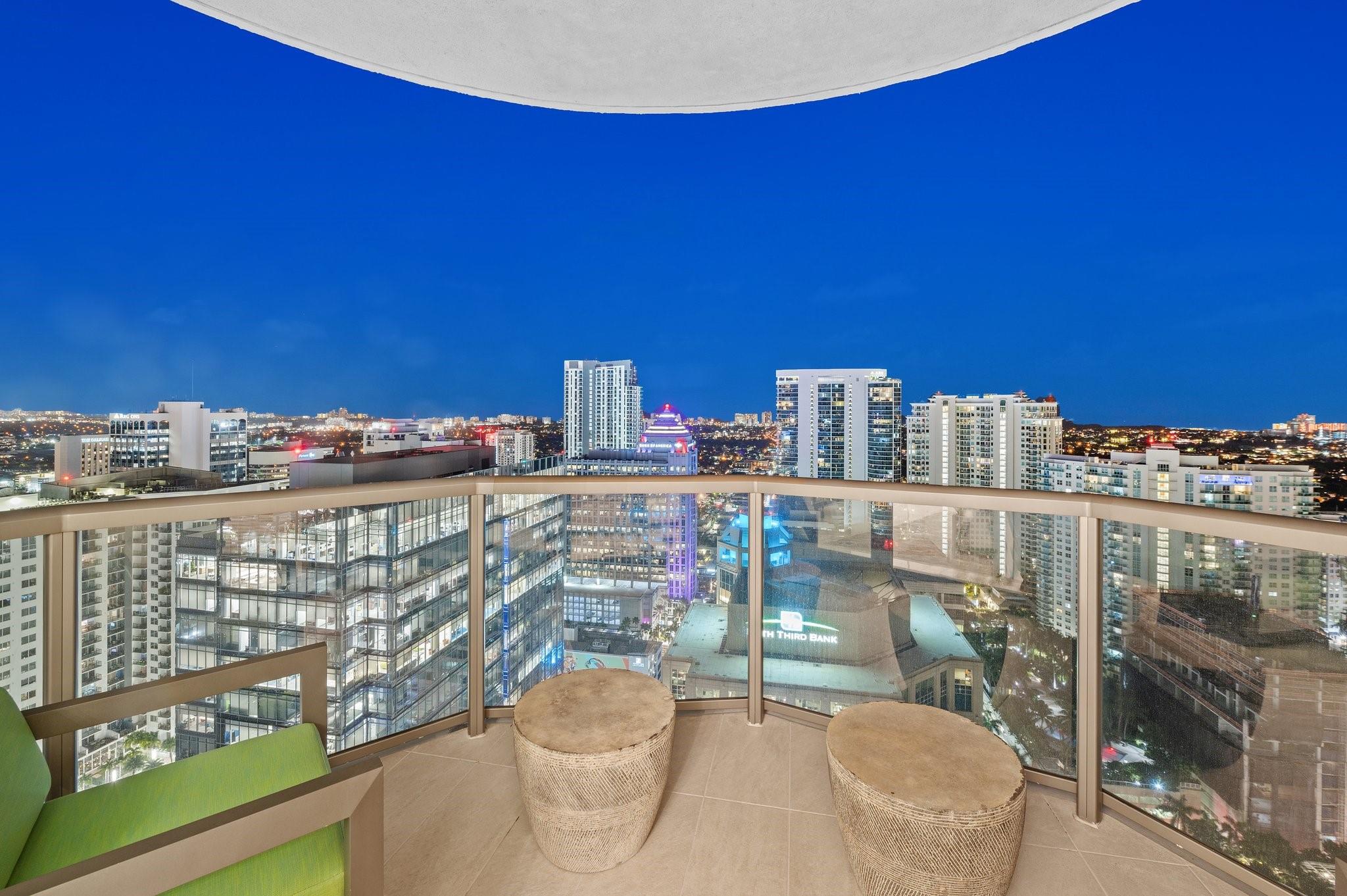Turnkey custom designed condo in Fort Lauderdale's most iconic, newer & tallest downtown address 100 Las Olas is framed by an unobstructed panoramic backdrop of the city skyline, canals, Intracoastal, New River to the ocean from every corner of your home. Enjoy best of both worlds from early sunrises to late sunsets. Magical night views. This great open layout with the best views from floor to ceiling windows, primary bedroom balcony and expansive wrap around curved terrace with tri-fold sliders is what makes this "A" model floorplan so unique & desirable. Top of the line gourmet kitchen, appliances, fixtures, furniture, custom built-in Onyx lit bar and more. This residence is an urban oasis of luxury. Smart technology. Resort style living & amenities. Restaurants, shops, theatre, ocean.