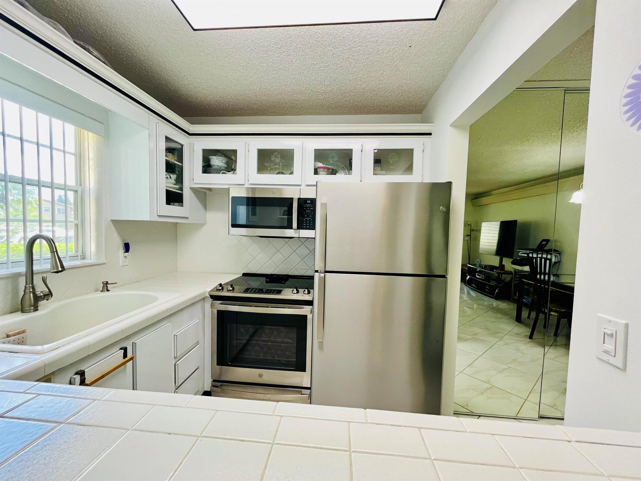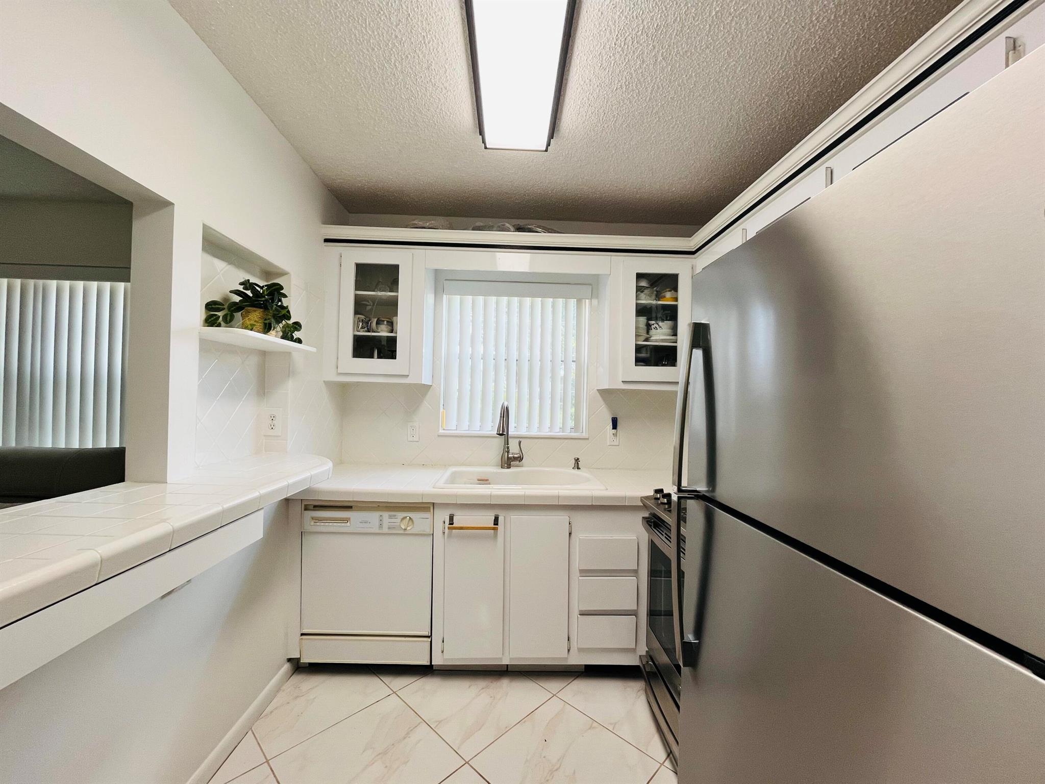 DON'T MISS OUT ON THIS UPDATED GROUND FLOOR 1BED 1 1/2 BATHS WELL MAINTAINED CORNER UNIT. EXTRA WINDOWS, WHITE KITCHEN WITH CUSTOM CABINETS,STAINLESS STEEL APPLIANCES, HIDDEN PANTRIES, EXTRA CABINETS IN THE UPDATED BATHROOM, LARGE TILE THROUGHOUT, CENTRAL AIR, PARK AT YOUR DOOR. WELL MANAGED ASSOCIATION WITH PRIVATE PICNIC AREA , NEW ROOF. SHORT WALK TO THE CAMDEN POOL .Laundry room, assigned parking spot plus visitor parking available; local bus for errands/shopping both within & outside The Village;. COME AND ENJOY RESORT STYLE LIVING IN THIS GATED COMMUNITY FOR ADULTS 55+ Great location close to shopping, beaches, reataurants and PBI Airport.