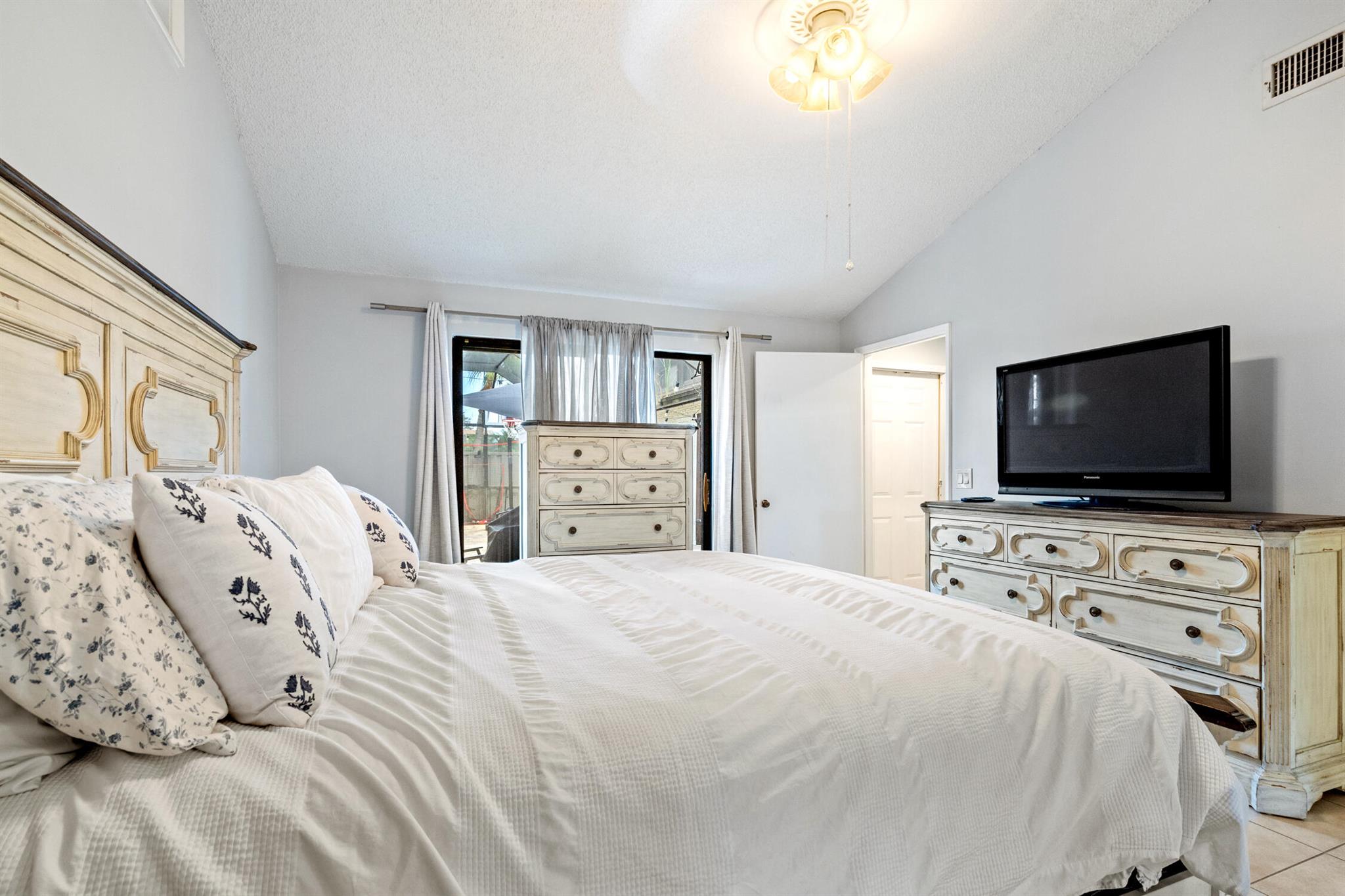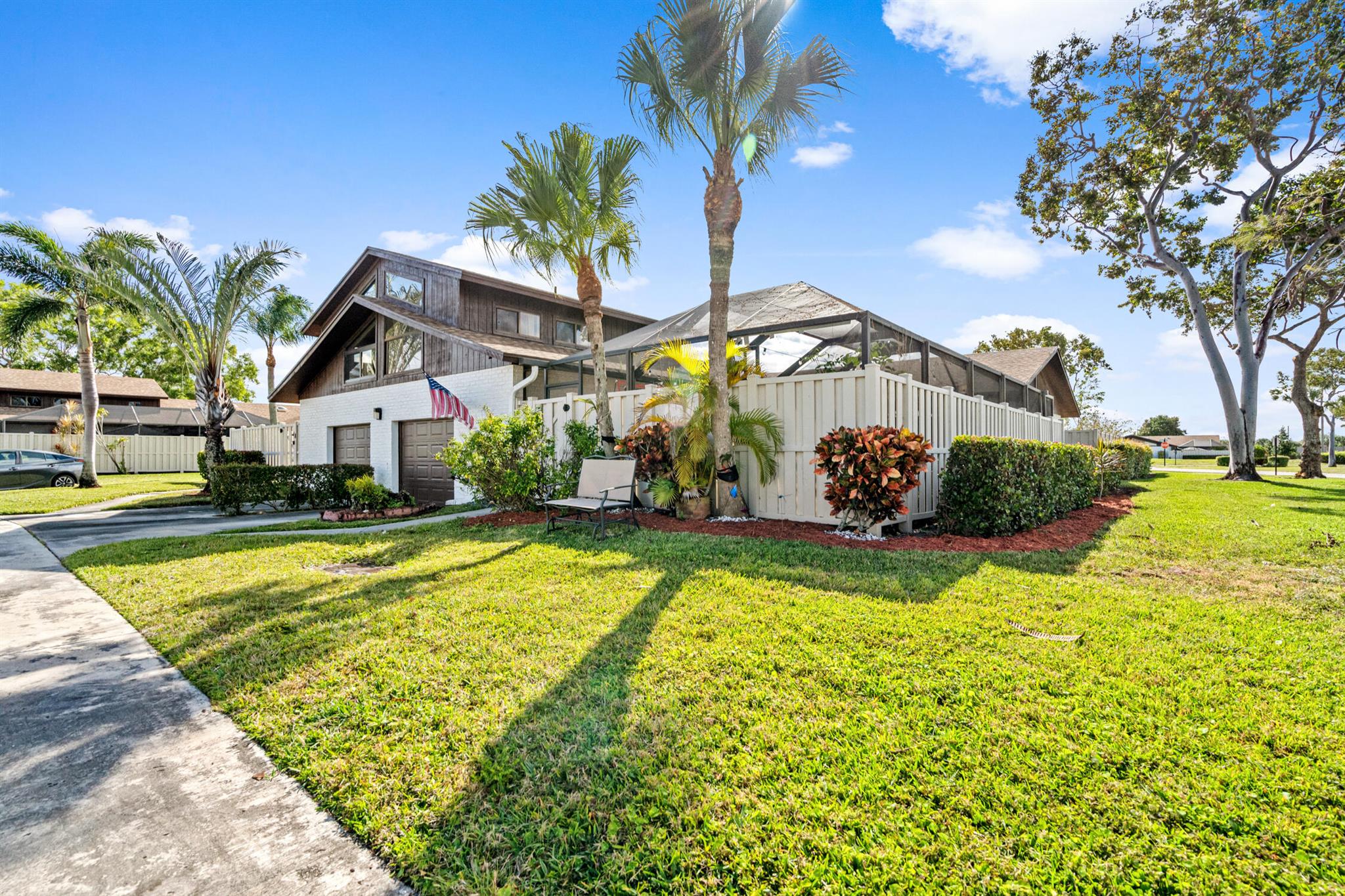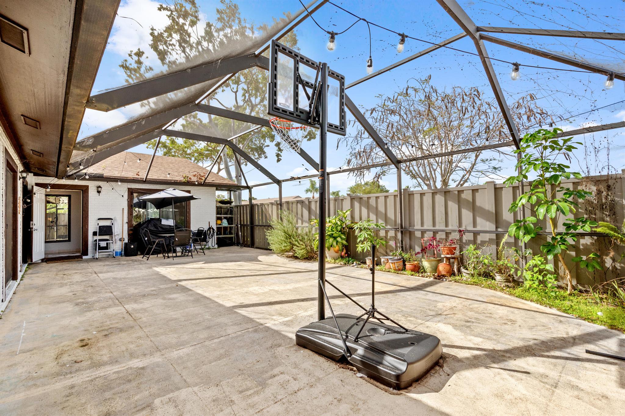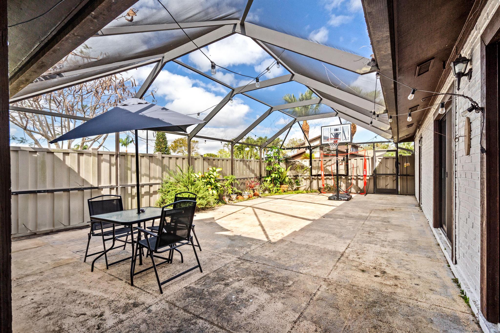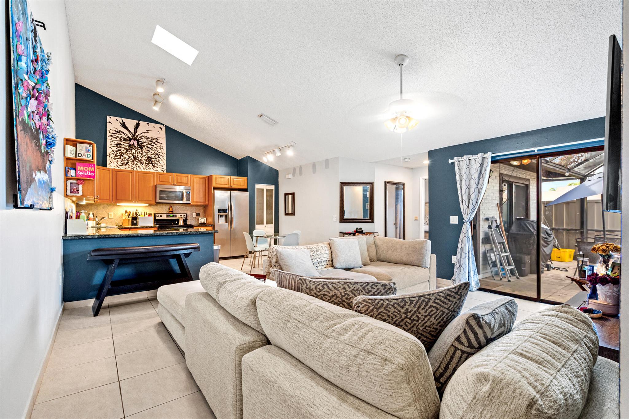 Gorgeous three-bedroom, three-and-a-half-bathroom townhome featuring a one-car garage, driveway, an assigned parking spot, and guest parking. This home boasts an expansive screened and fenced patio, perfect for relaxation and entertaining. The updated kitchen showcases wood cabinets, granite countertops, and a stylish tile backsplash. Enjoy ample natural light with skylights in the living room and three sets of sliding glass doors surrounding the patio. Throughout the home, you'll find tile floors for easy maintenance. Recent updates include a new roof in 2021, A/C is 5 months old, and garage door in 2012.