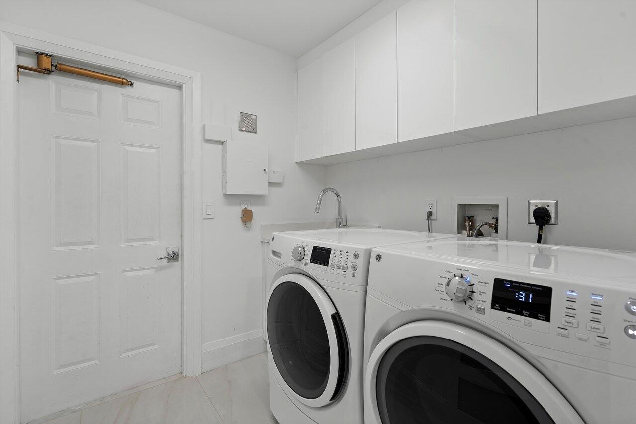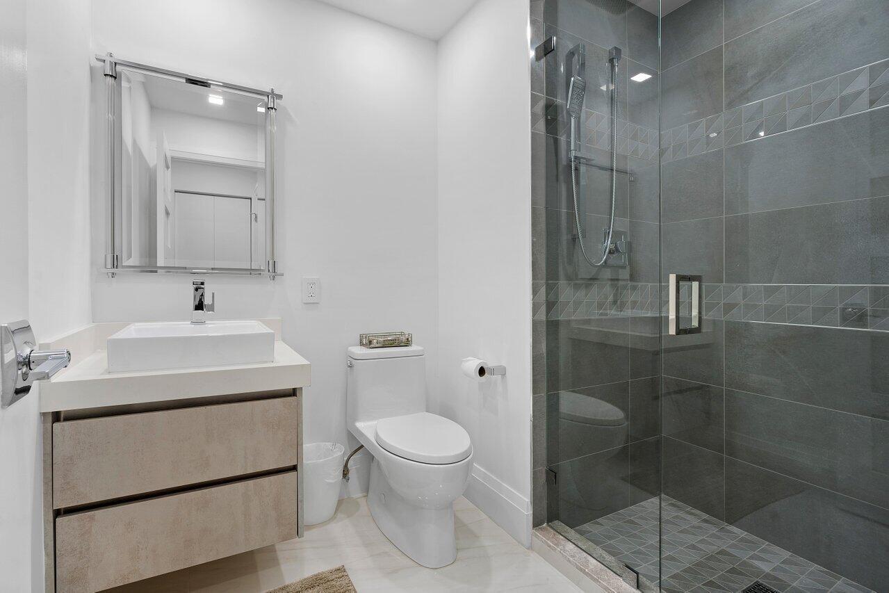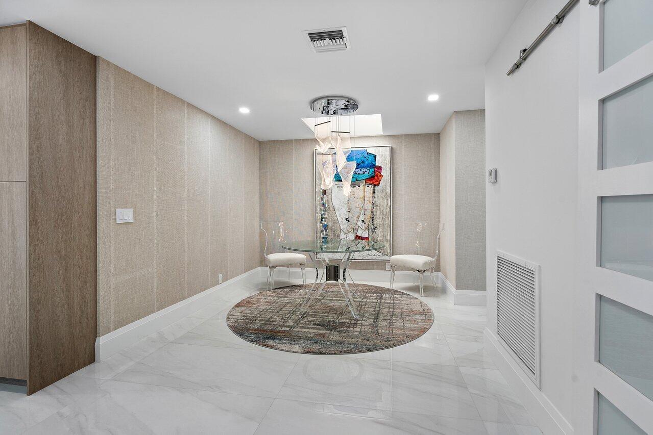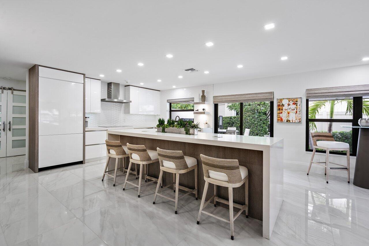 Welcome to this private, modern waterfront retreat in the heart of Boca Raton. This stunning residence offers 3 bedrooms, 3 full bathrooms, and an open floor plan with over 2580 square feet of living space. The house was totally renovated in 2021, including impact windows and doors. Step inside to discover a host of luxurious features including large porcelain tile floor throughout, Miele kitchen appliances, and a (fabulously) large kitchen island open to the great room with views of your private deck and steps to your dock. This space is perfect for entertaining inside and out, with plenty of spaces for relaxing and dining al fresco. The home boasts upgrades galore, including custom closets, motorized shades, and a garage with an epoxy floor and its own A/C. (con't)