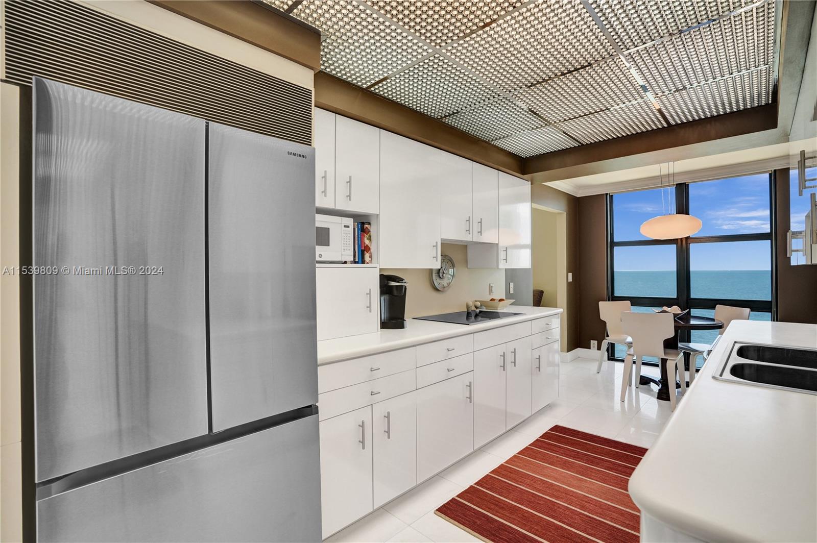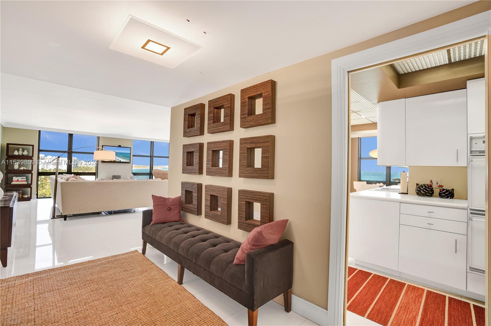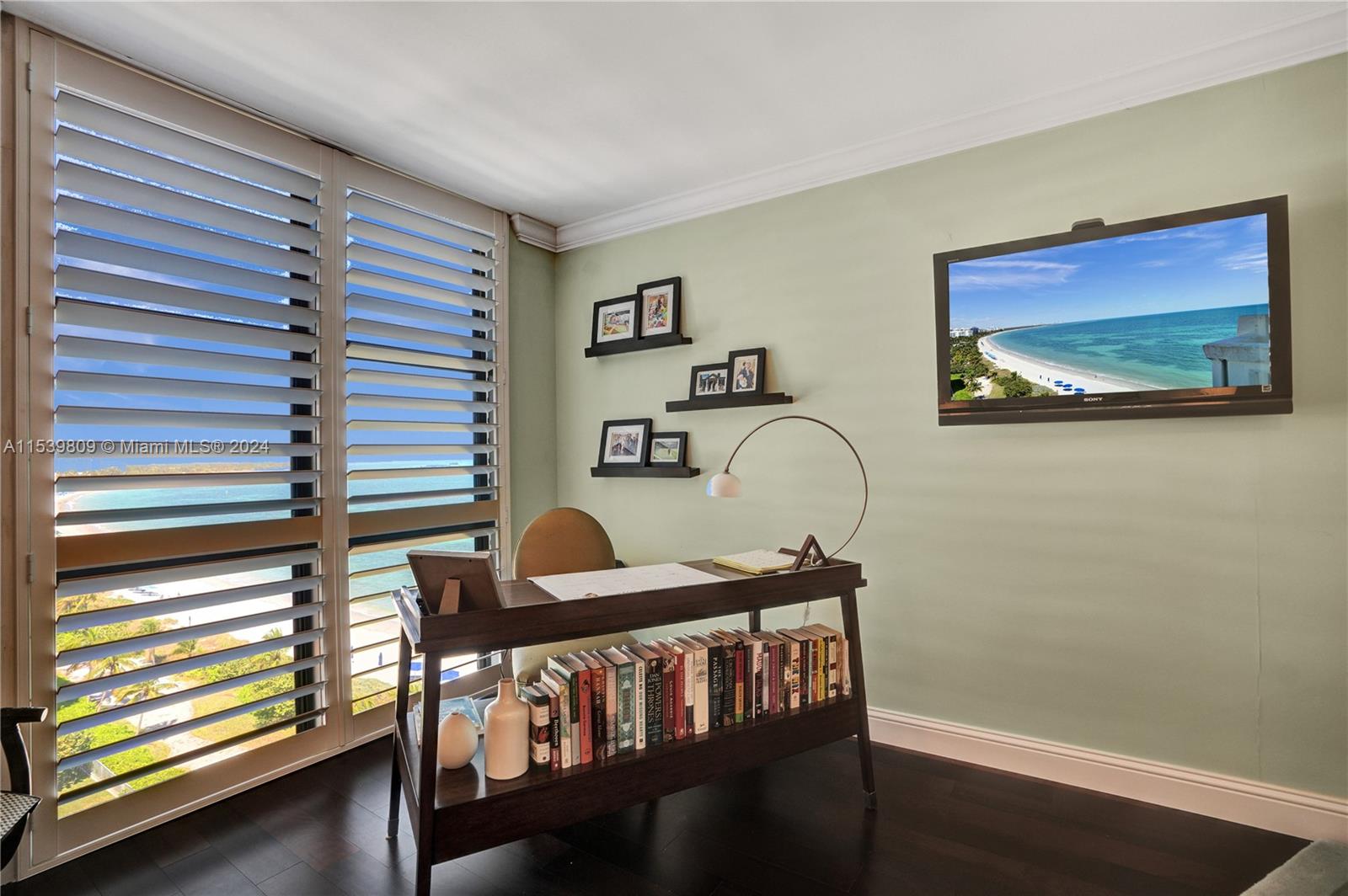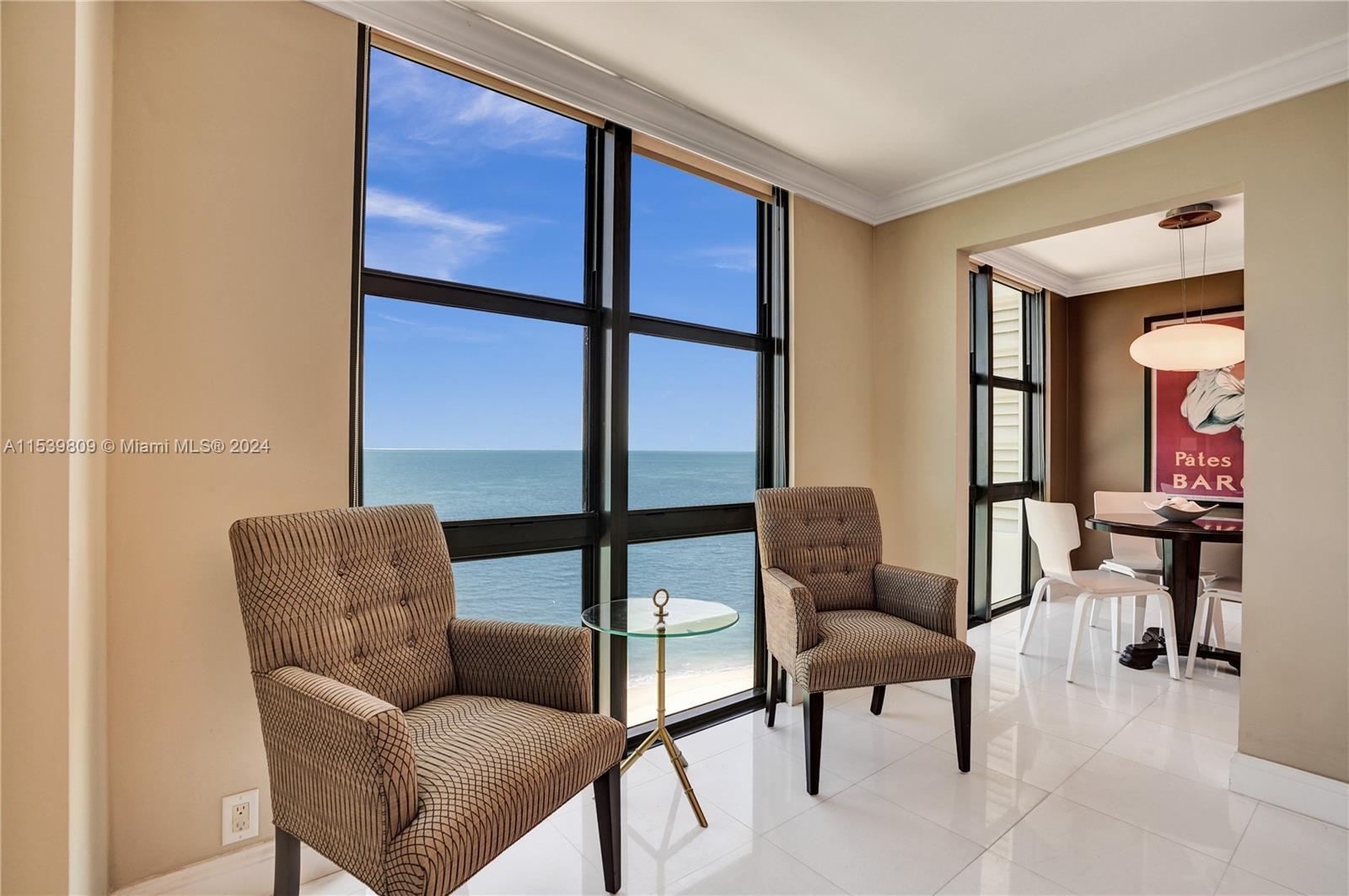 Discover the allure of oceanfront living with breathtaking shoreline views from this expansive corner unit. Welcome to your oceanfront oasis, boasting unobstructed, panoramic vistas of the ocean shoreline, South Point, and the surrounding island. This beautifully maintained unit features new impact floor-to-ceiling windows and doors throughout. It also showcases white tile flooring, crown molding and updated bathrooms. This sought after Estoril model can easily convert into a 3rd bedroom plus office space. 2 upper garage covered parking spaces, #16 and #131.