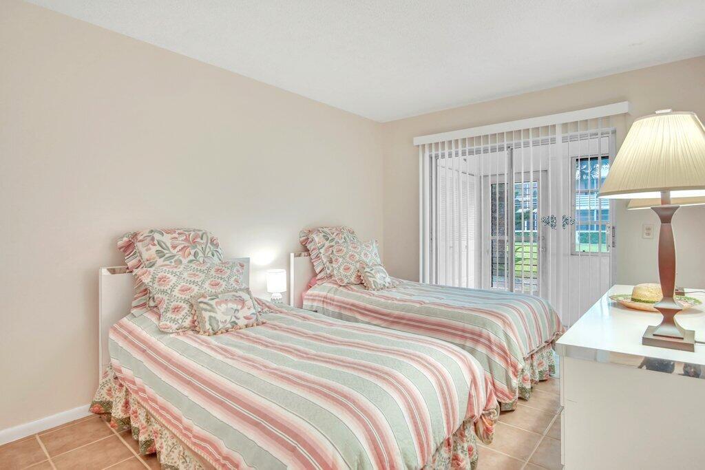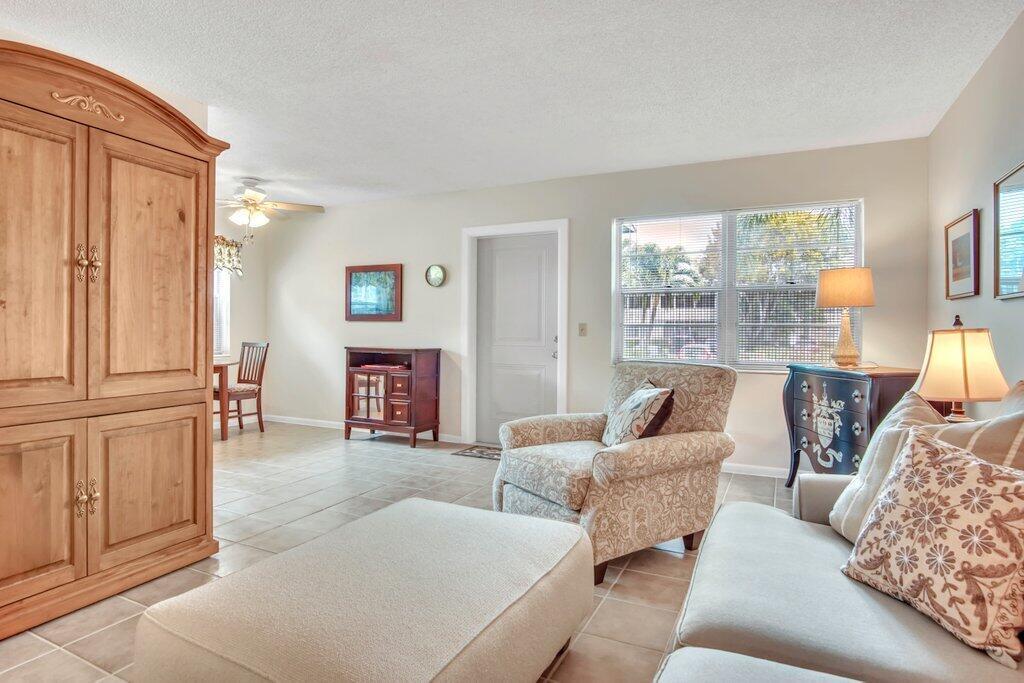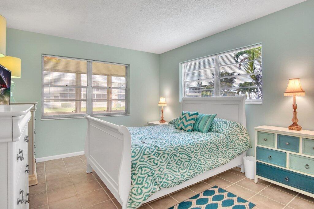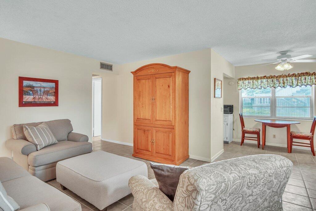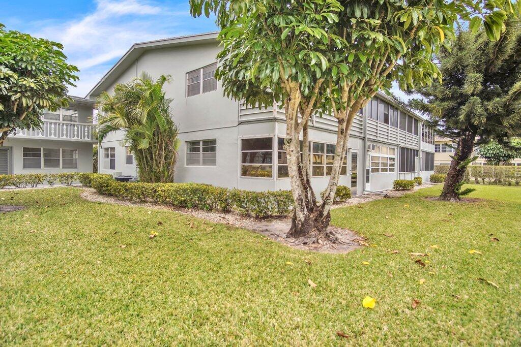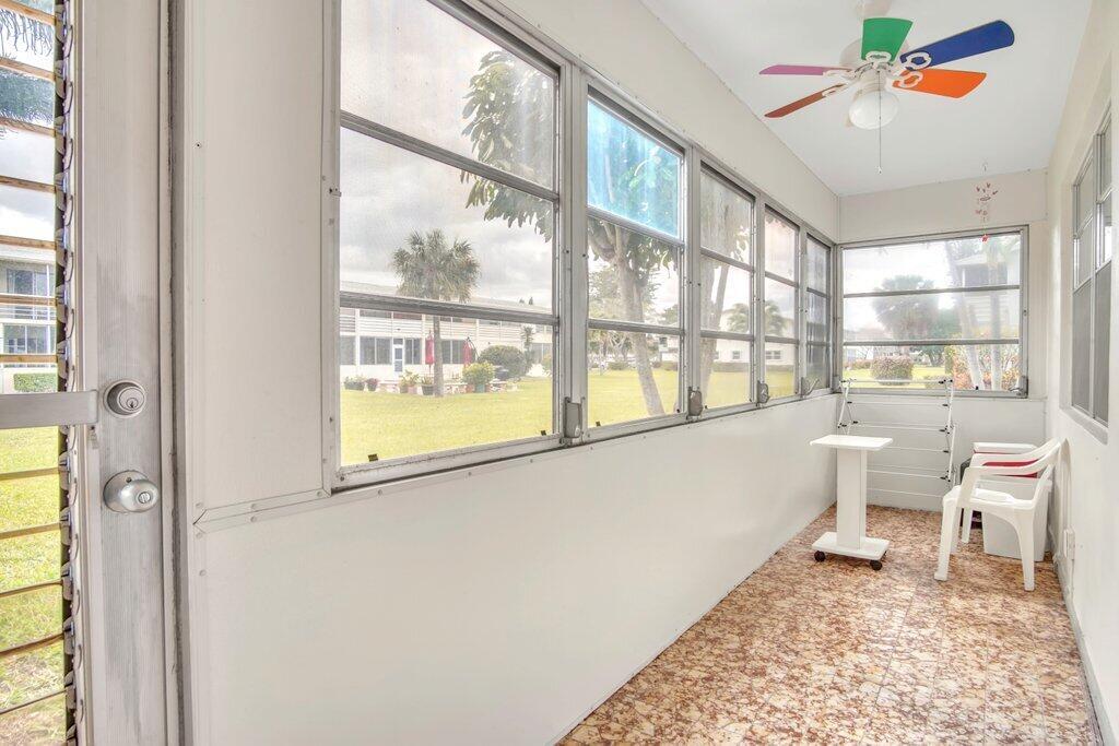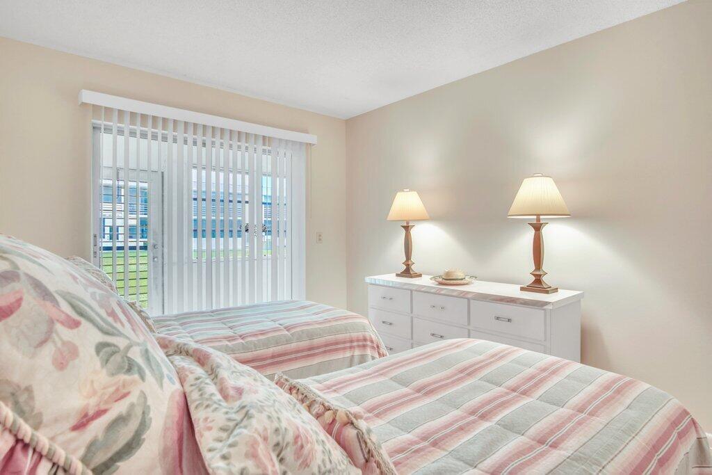 Rare opportunity to own a ground floor CORNER MOVE-IN ready condo! This immaculate condo, used seasonally, is beautifully appointed with lovely furnishings; brings in lots of natural light, and offers a walk in shower; newer AC (2021); neutral ceramic tile and a neutral color palette throughout,. The enclosed back patio adds more space to enjoy and faces an open green area.. Dorchester B is well run and well maintained, The building recently replaced the roof, painted the exterior & completed concrete restoration on common walkways and stairs. A satellite pool is nearby. Century Village offers a state-of-the-art clubhouse hosting many activities, such as shows, movies, billiards, exercise, and many ways to make friends and enjoy all the amenities. This gem of a condo is a must see!
