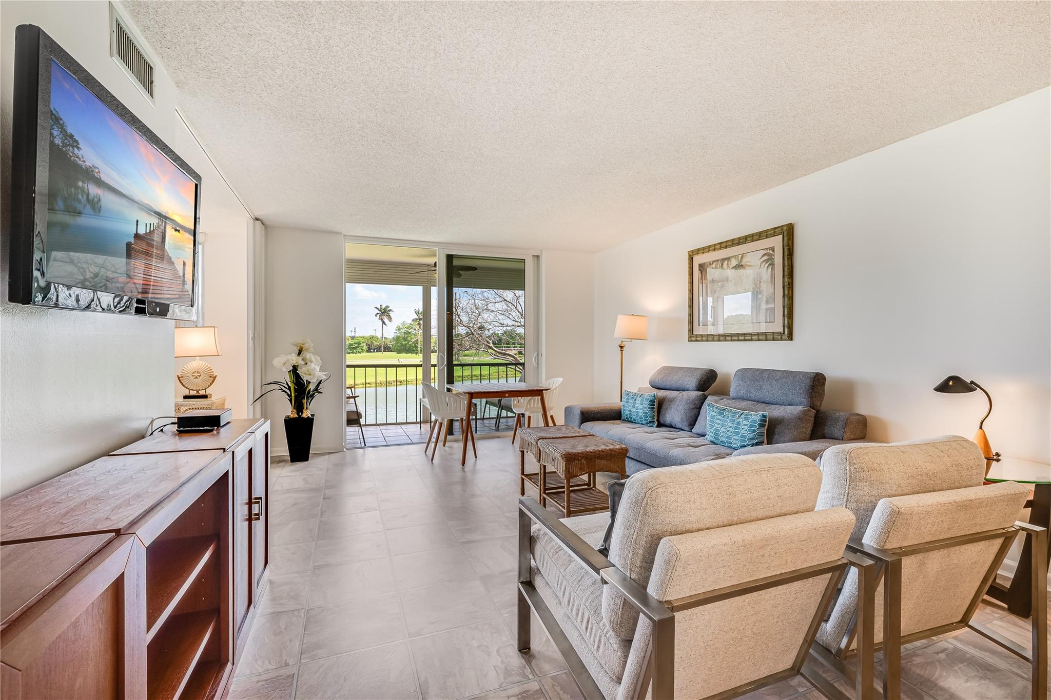SPECTACULAR WIDE LAKE & WIDE 17th PGA Fairway. BRIGHT CORNER,2BR/2BA, 1,170 SF.. Wide open kitchen with high ceiling and mini LED lighting. Snack bar is perfect for looking out to the lake and majestic golf view. NO POPCORN Ceilings. Newer AC. New,100% waterproof vinyl plank flooring in Master Bedroom. Recreation Lease PAID IN FULL! FREE golf (except cart fees) on two 18 hole courses (PGA & Par3); Amenities include Restaurant, Billiard Room, Bbq/Picnic Area, Clubhouse, Courtesy Bus, Exercise Room, Heated Pool, Library, Putting Green, Sauna, Shuffleboard, Tennis, Pickle Ball, Vehicle Wash Area, Electric Car Charging Station. Close to shopping, dining & highways. 15 min. to beach. Association says 55+ age required; BEST VIEWS!