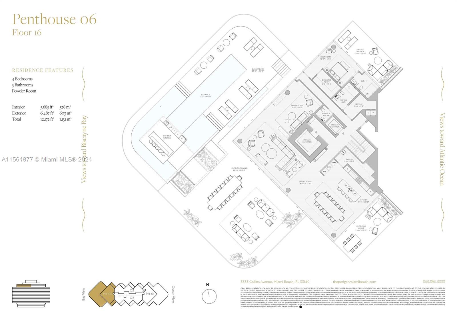 Rising from the most peaceful and expansive stretch of sand on Miami Beach’s coastline, The Perigon is an unprecedented collaboration between three global design icons. The rare seclusion, matchless amenities, and impeccable service of this unique private enclave promises residents an exclusive Miami Beach lifestyle.This PH 4 bedroom residence with over 5685SF of living space and 6487SF of terraces makes this one of the best PH options on the market. Buyer chooses - Kitchen cabinets, flooring options, closets installed - Developer inventory is subject to change based on activity of sales. Gas cooking, Wolf & SubZero appliance, stone countertops. Parking is self park or valet park (owners choice)
