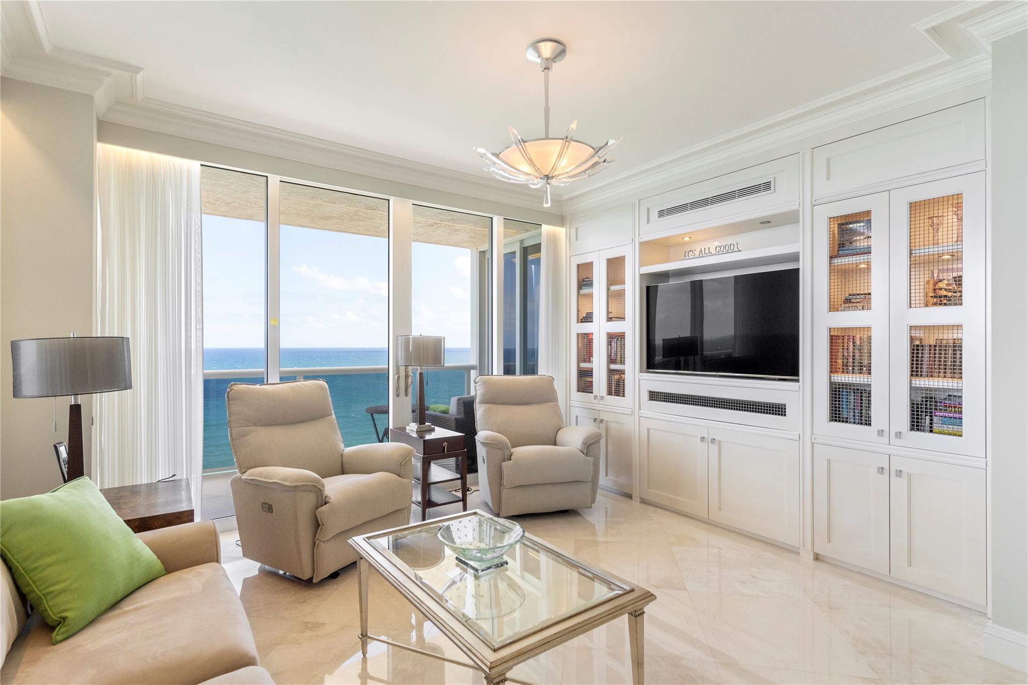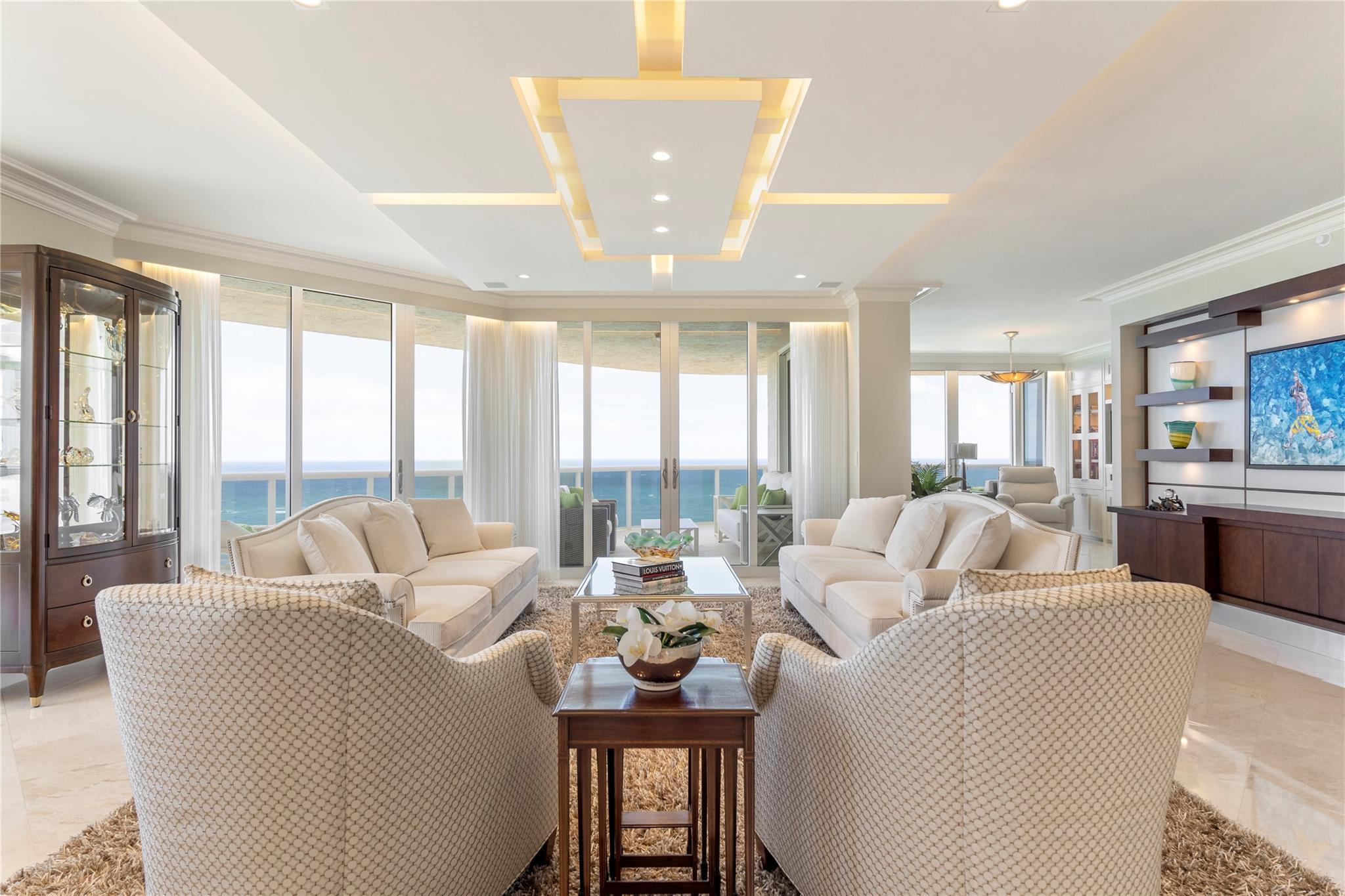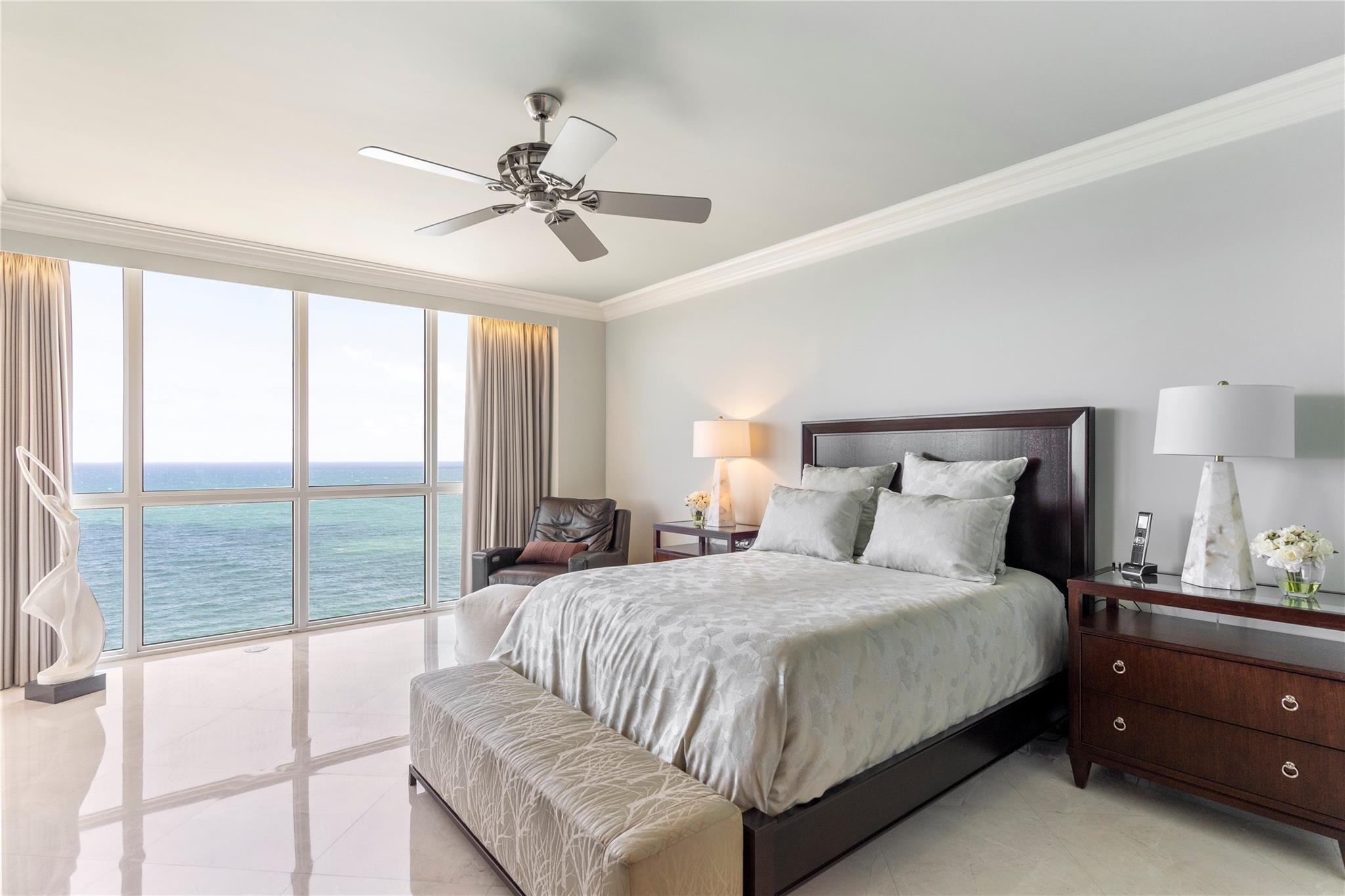 Designer model. DIRECT EAST OCEANFRONT C-O-R-N-E-R ! Available as furnished. 3 bedrooms/ 4 baths. NOTE: one guest bedroom w/ full bath is used as a den w a sleeper sofa and another guest bedroom w closet and full bath is used as an office. Primary bedroom has 2 baths. ABSOLUTELY BEAUTIFUL!!! Resort-like living with poolside restaurant, 2 pools, 2 spas, child pool, 2 tennis courts, private beach pavilion, cabanas, valet PLUS, PARK YOUR CAR YOURSELF in 2 GARAGE SPACE, concierge, TWO PETS, ANY SIZE OK, pet park, too.