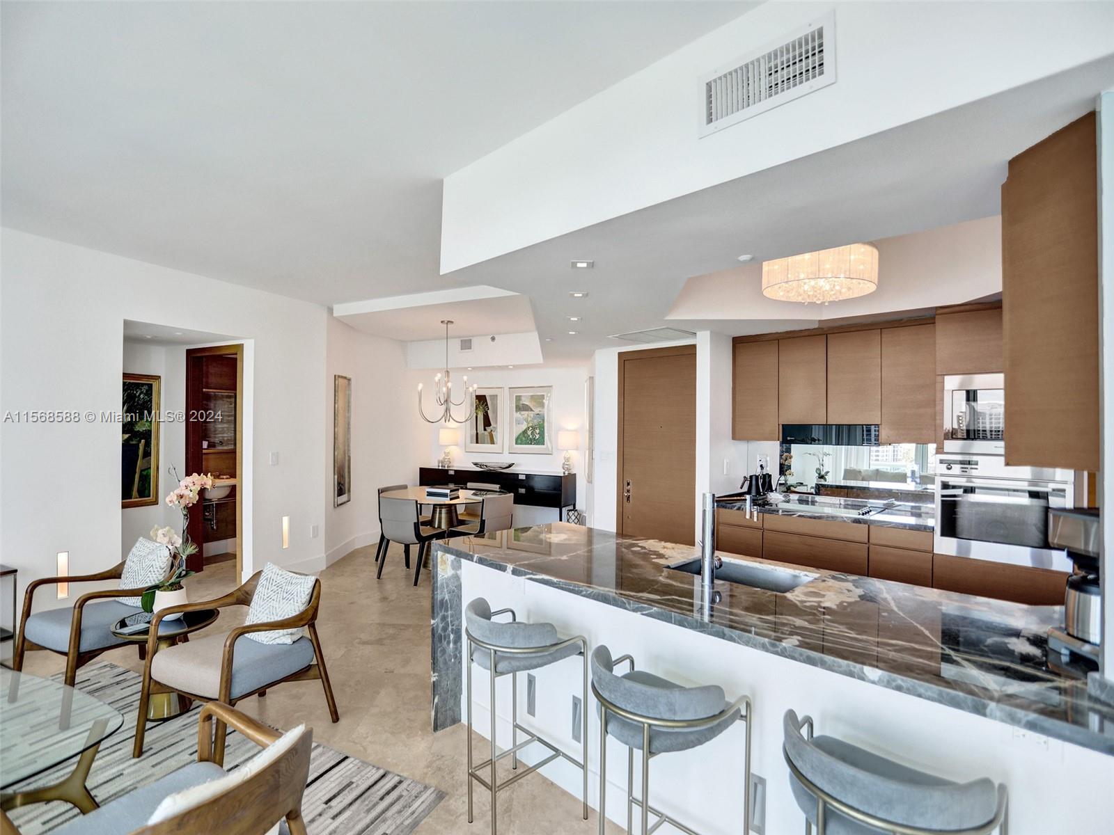This elegantly remodeled and spacious 2bd/2.5 bath offers beautiful and serene water views from every room. Luxury finishes and designer details come together to create a very special apartment. Fully marbled baths, stunning kitchen, custom doors and lighting are just a few of the impressive features that set this home apart. Notable is the massive terrace, almost 400 sf, offering additional living space to enjoy the Miami al fresco lifestyle. Murano Portofino is arguably South of 5th’s finest residence. Known for being extremely well managed and having incredible service and amenities, including a second ‘beach club’ pool and lovely exclusive onsite restaurant, a two-story fitness center and lighted tennis courts. The apartment comes fully furnished. Do not miss this opportunity!