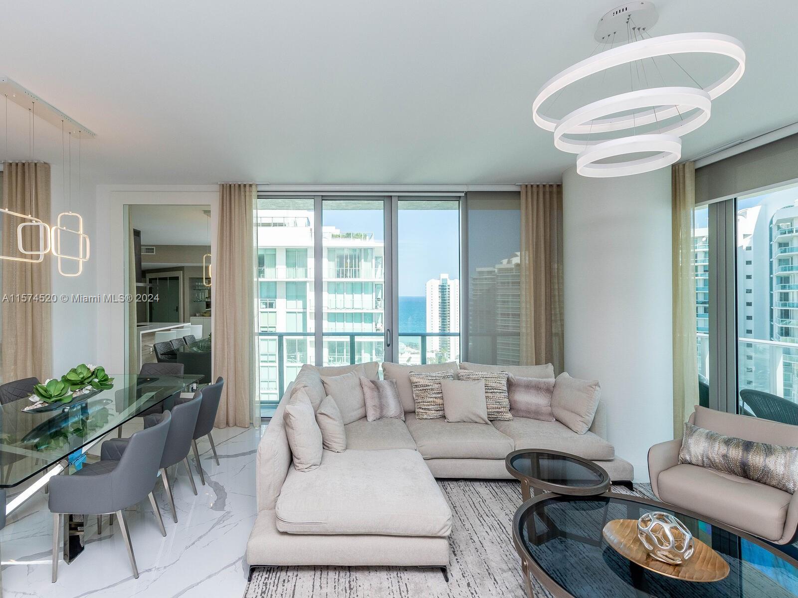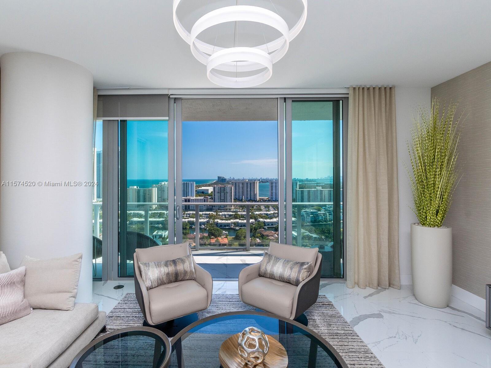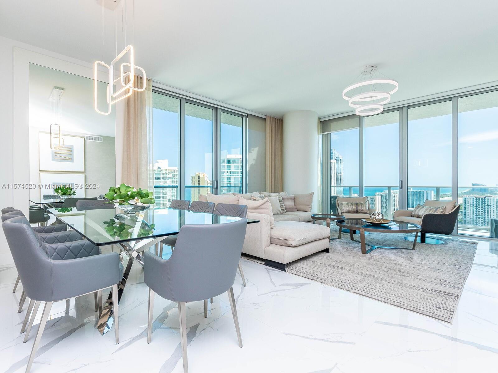 Fantastic furnished unit in Sunny Isles, close to the beach, with 5 stars amenities. Tastefully upgraded 3 bed/3.5 bath, corner unit, high floor and high ceilings, wrap around terrace with stunning panoramic views of Intracoastal, Miami skyline & Ocean. Designed by Steven G with finest furniture and beautiful decor and lots of upgrades. Open floor plan, floor to ceiling Impact glass windows & doors. Gourmet kitchen, quartz Countertops, induction stove, Italian cabinetry, Bosh & Subzero appliances, Italian closest and doors, electric blinds, beautiful porcelain floors. Luxurious amenities:24/7 front desk & Valet, 4 pools, Gym, Spa, Kids Club & Playground, Cinema, Games room, Bistro, Party room. Near the beach, Aventura Mall & Bal Harbor Mall. Awesome Schools.