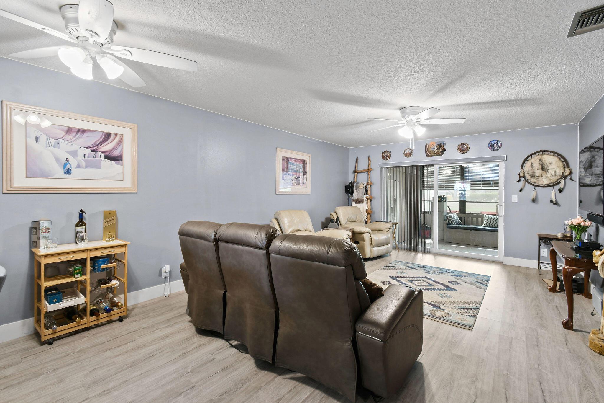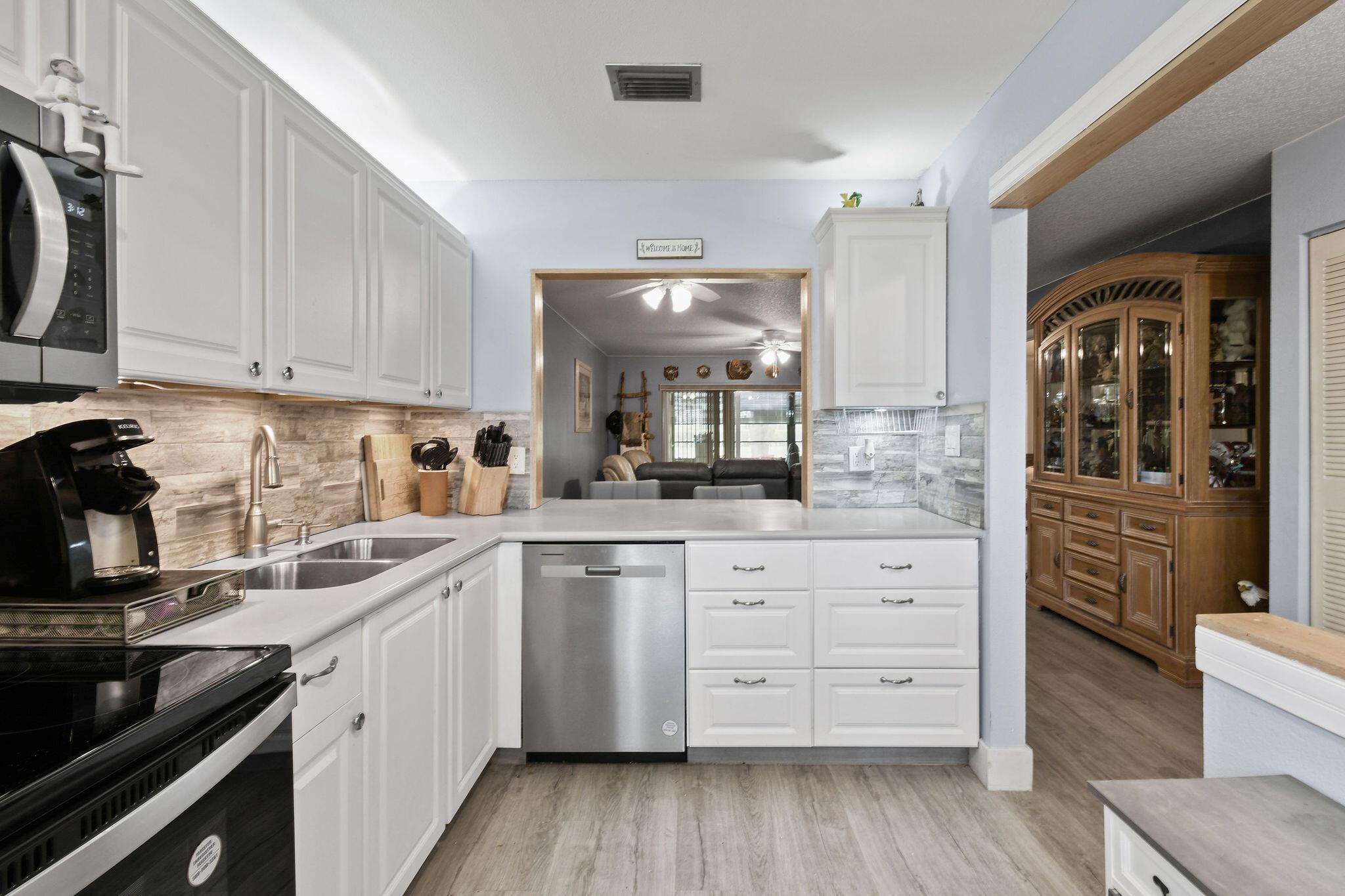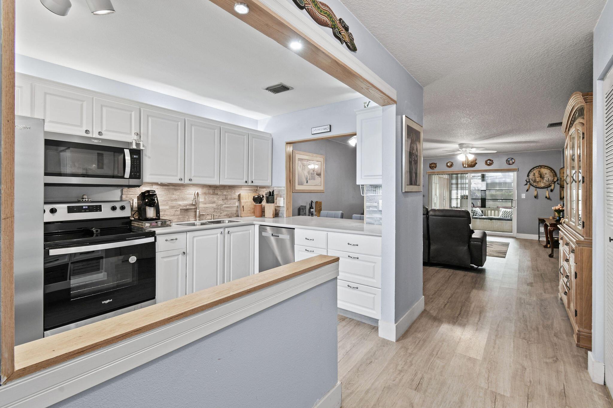 Updated move-in ready Villa. 2024 new A/C, tankless Water Heater, new appliances. 2023 remodeled bathrooms. 2022 IMPACT windows and front door, knockdown ceiling (no popcorn), vinyl plant floors, California closets and 2021 additional insulation added in the attic. Extra large 23'x10' Patio is enclosed with A/C vent, extra storage closet and additional 2nd refrigerator. Lake Rebecca also has a Satellite pool for Lk Reb residents to use. Monthly maint includes water, Xfinity Cable, Wi-Fi Internet, bldg insur, 24/7 guard gated & a social director scheduling shows, trips & social events. Clubhs with Pool, hot tub, tennis, Pickleball, billiards, Cafe and so much more. Come Discover all the amenities Golden Lakes has to offer.