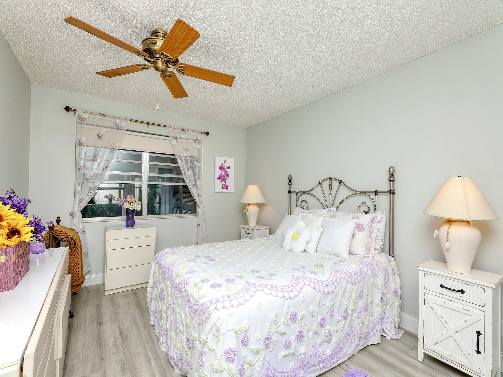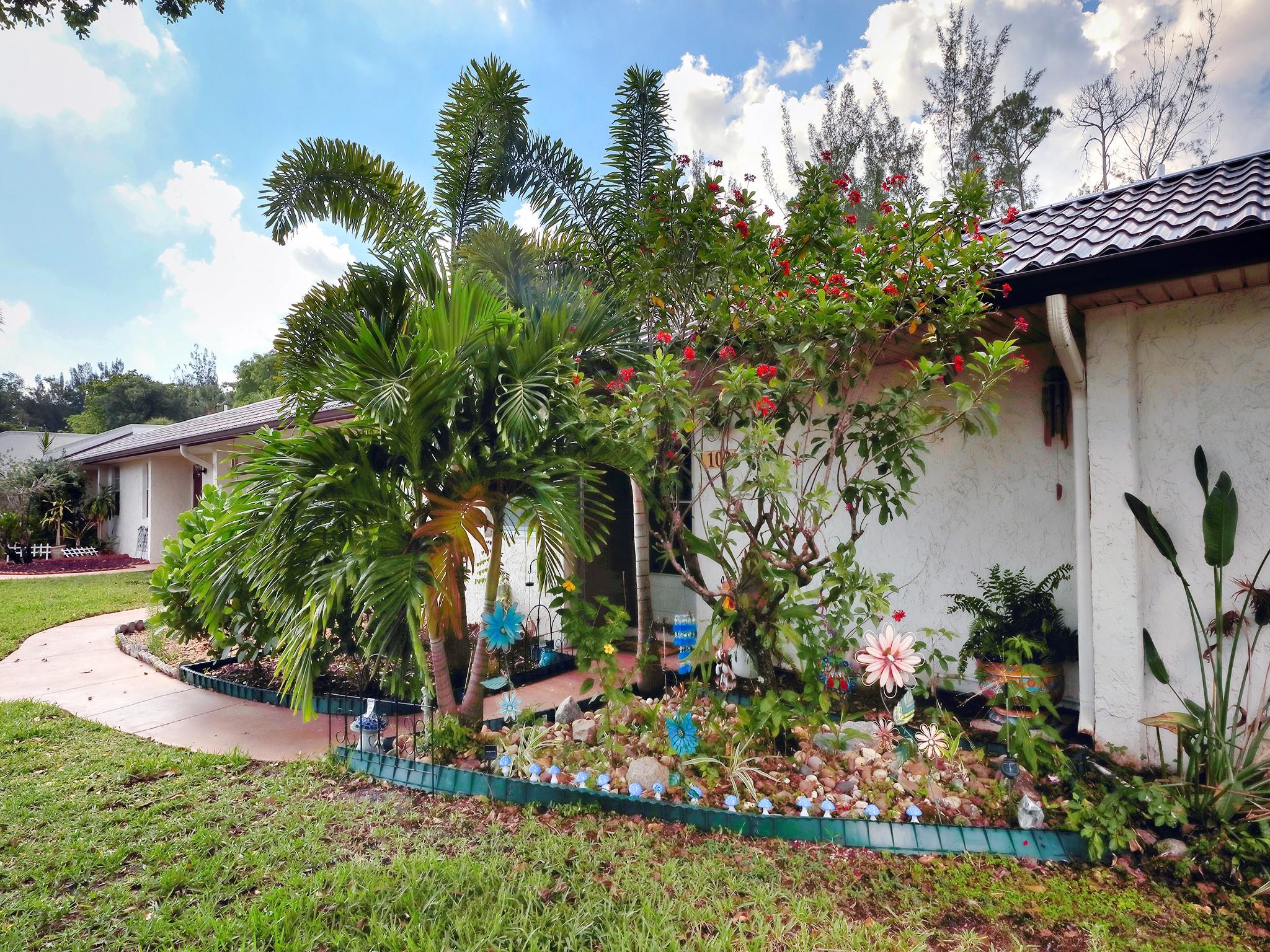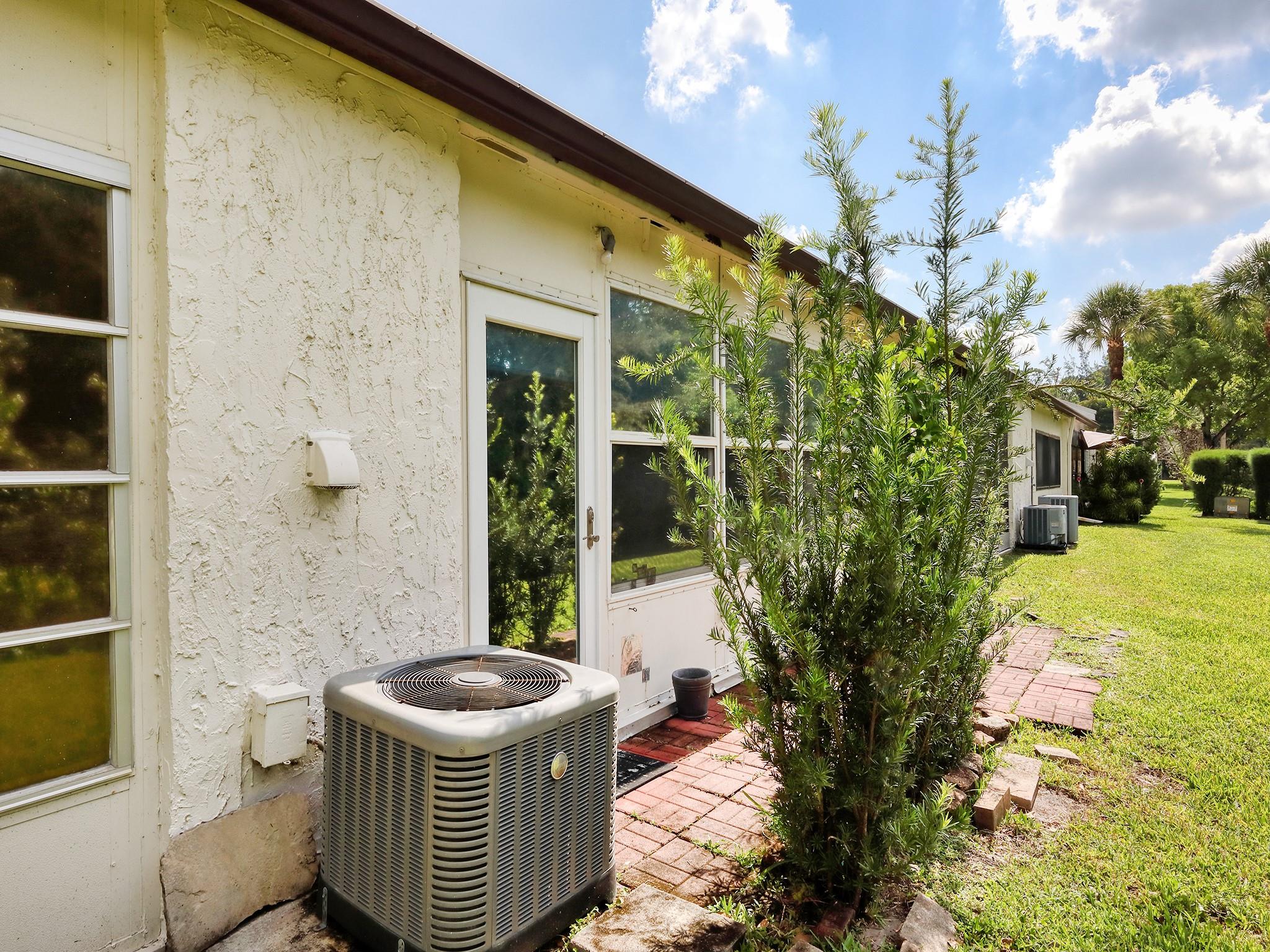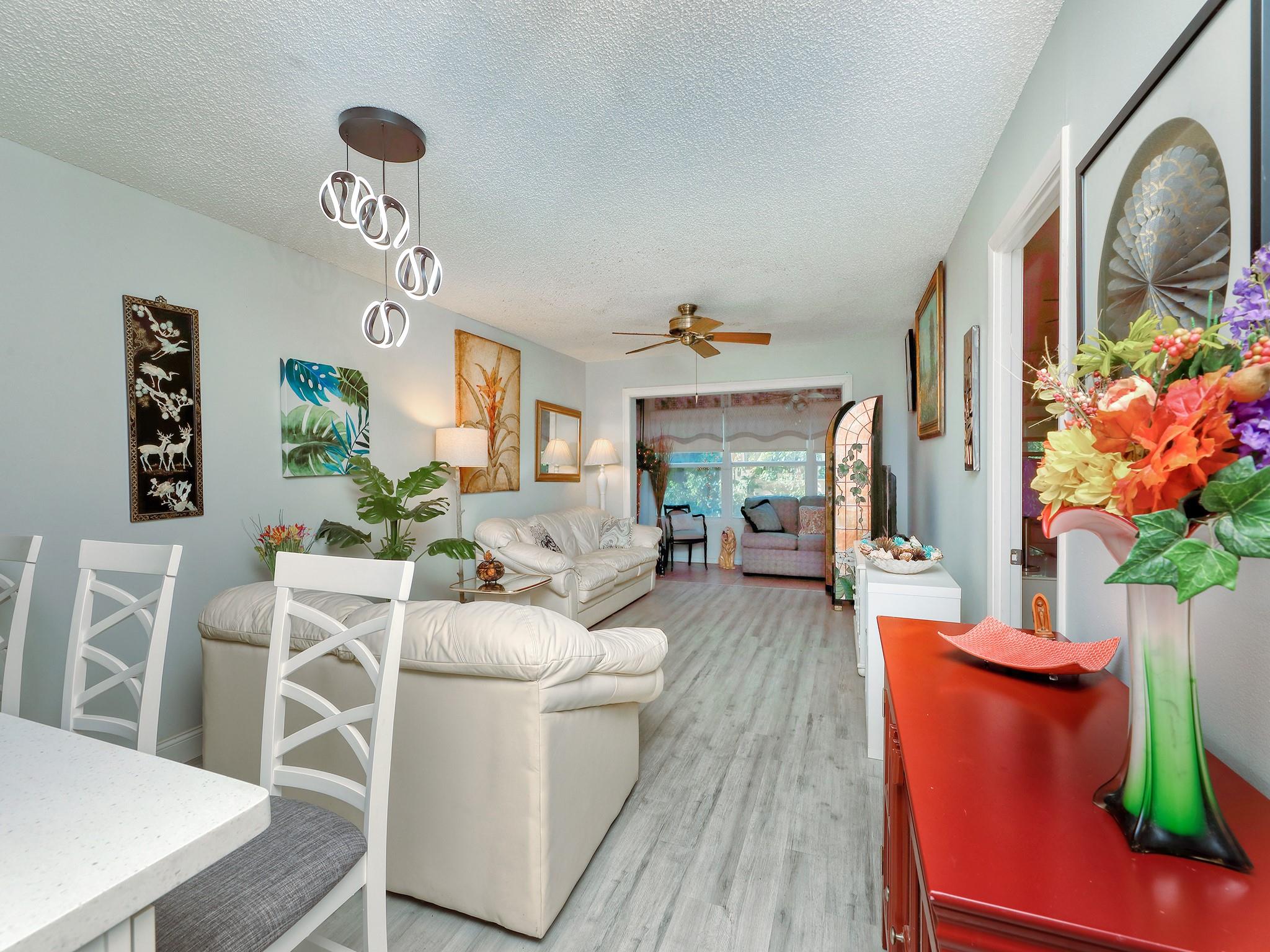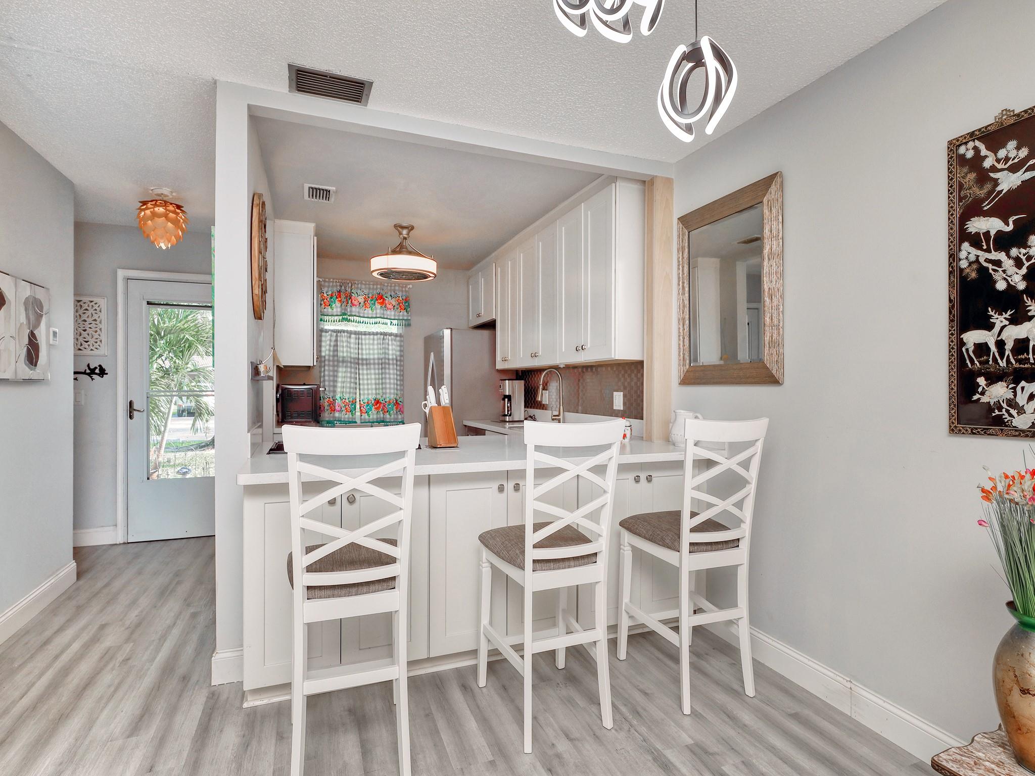 Every once in a while, a property comes on the market that checks ALL the boxes. Meticulously maintained one story villa, completely updated from floors to ceilings. BRAND NEW ROOF (2024), remodeled kitchen with custom wood cabinets, granite counter tops & stainless steel appliances. Kitchen wall opened to dining & living area with extra cabinets. Both bathrooms remodeled & primary bathroom is in suite to the extra large bedroom with walk in closet. Florida room with hurricane impact glass (throughout villa) opens to VERY private back yard with garden & water views. Washer & dryer in unit. This elegant over 55 community accepts pets (up to 30 pounds) & offers the most amazing amenities. Your shaded parking spot is directly in front of your villa. See all the rest then come see the best!
