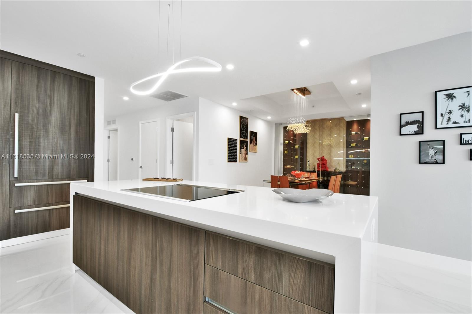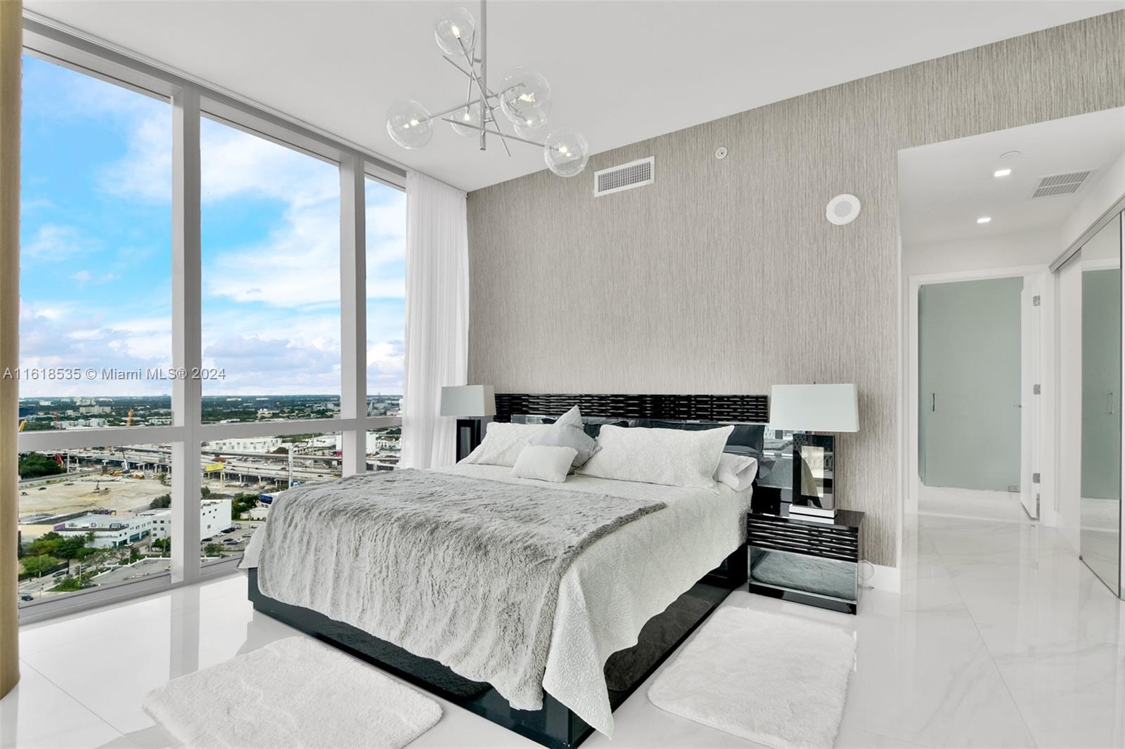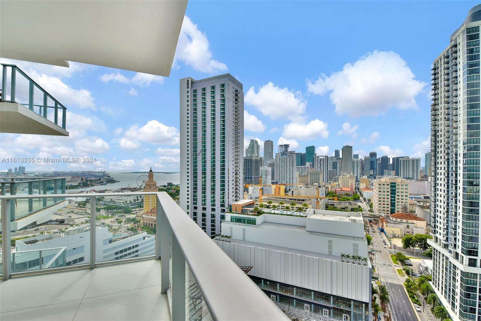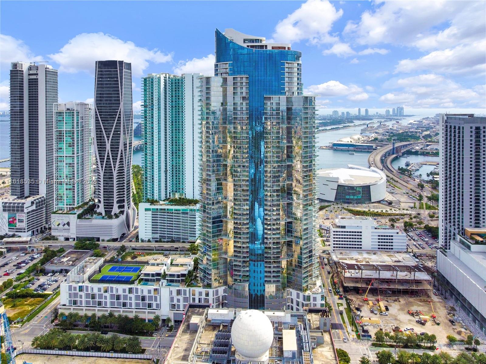 This exquisite unit features 3 bedrooms, 3 full bathrooms, and 1 powder room. Enjoy a private elevator with foyer, oversized terrace, private balcony in primary bedroom, over $300k in upgrades including a dining area with built-in glass wine cellar, custom wallpaper, electric blackout shades, recessed lighting, Italkraft kitchen cabinetry, custom wood panels, Bosch appliances, and a large kitchen island with stovetop and ample storage. Breathtaking views of the skyline and Biscayne Bay. Building amenities include multiple pools, fitness center, spa, tennis courts, soccer field, boxing studio, and game room. Located in the heart of Miami Worldcenter, surrounded by premier dining, shopping, and entertainment. 1 assigned parking space + the right to valet park a second vehicle complimentary.