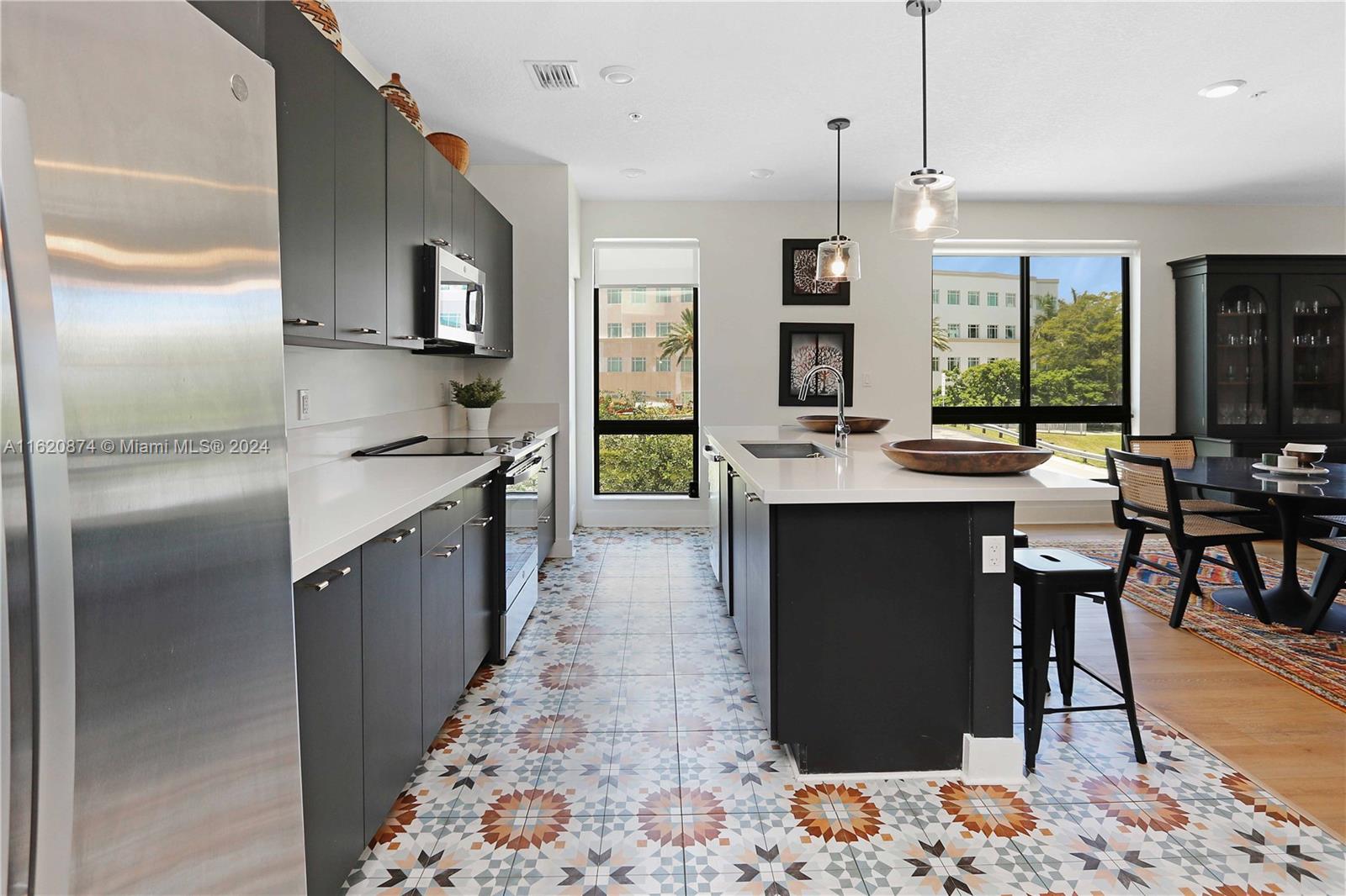 Bright and spacious corner unit with canal views. This beautifully updated 3/2 apartment offers 1,336 square feet of comfortable living space. Features open and inviting layout, new laminate floors throughout providing a modern and cohesive feel, perfect for any decor style. The kitchen boasts Moroccan style tile flooring, custom light fixtures throughout, new hardware on cabinets in both the kitchen and bathrooms Each bedroom is equipped with blackout blinds to ensure a restful night's sleep, while the rest of the apartment features stylish custom blind.The spacious primary bedroom includes a custom closet designed to maximize storage.Located in Urbana, Downtown Doral's newest construction, 3 minute drive to Palmetto expressway and walking distance to Downtown Doral and Doral City Place.