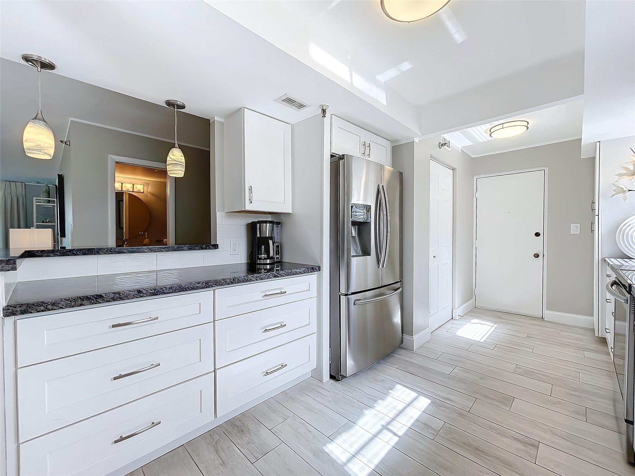 The pictures tell the story of this tastefully completed, high-end 3BR/2.5BA and 1715 sq ft remodeled condo. Seeing is believing! This spacious corner condo with open floor plan has the features today's buyers desire. Excellent views, cross ventilation options, windows on 3 of 4 sides of the building, built-in closets, stainless steel appliances, frameless shower glass... Simply put, exceptional design with high-end construction materials throughout. The complex features a clubhouse/community center with tennis /pickleball courts, large pool, back up generator, 24 hour video surveillance, cable, internet and water. The location is exceptional as it is just minutes from I95, the beaches and downtown areas of Boca and Delray. The green area is part of the planned Boca North Park.