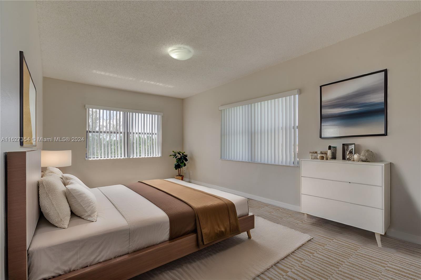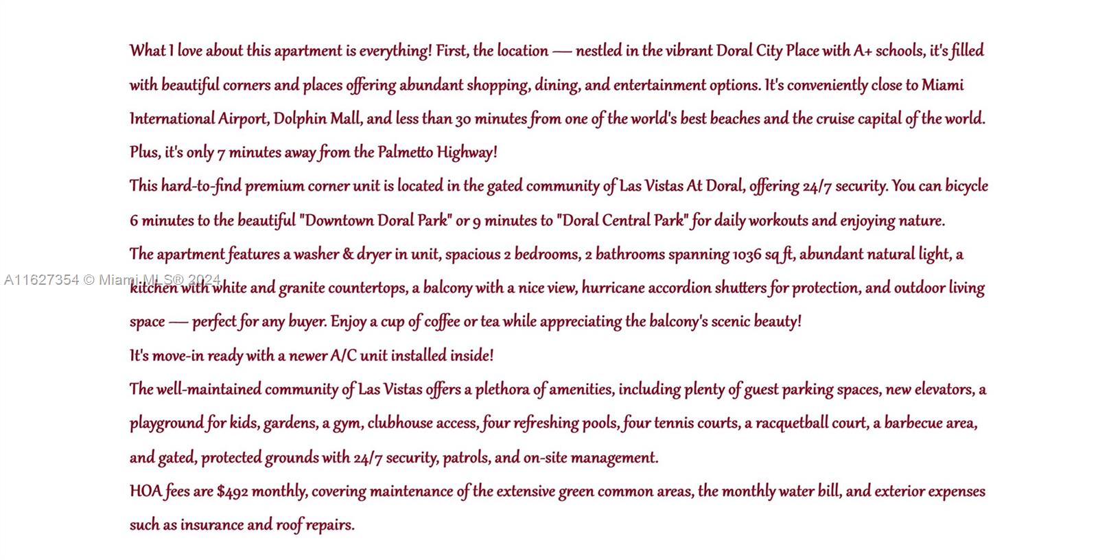 WASHER & DRYER in the Unit! Corner Unit! Spacious Apartment. This 2 bedroom, 2 bathroom,1036 sq ft, an abundance of natural light, newer A/A, modern-white and granite countertop kitchen, nice view balcony , protected by accordion hurricane shutters and outdoor living. Las Vistas offers a plethora of amenities including a playground, gardens, gym, clubhouse access, four refreshing pools, four tennis courts, racquetball court, barbecue area, a gated community protected with 24/7 security at the entrance, patrol, and on-site management, all while maintaining a low monthly maintenance fee of $492, which includes the monthly water bill. Enjoy the convenience of being close to finest attractions and luxurious living in the heart of Doral and Miami. VERY EASY TO SHOW.