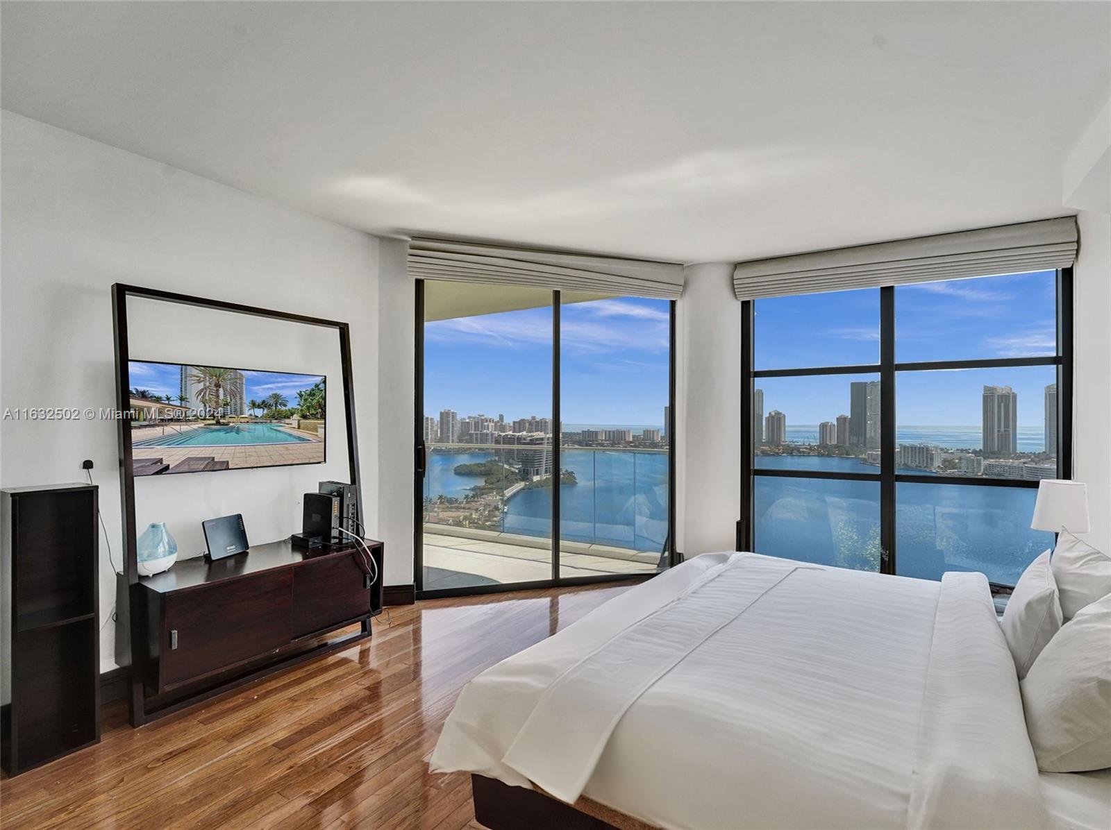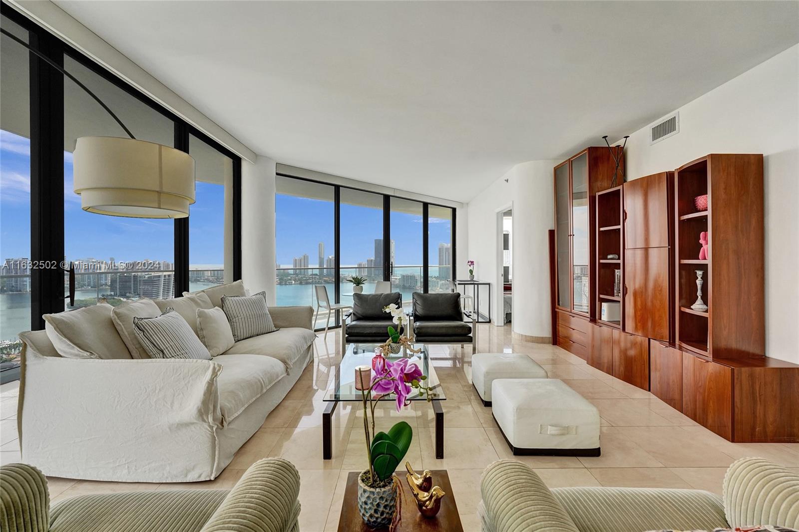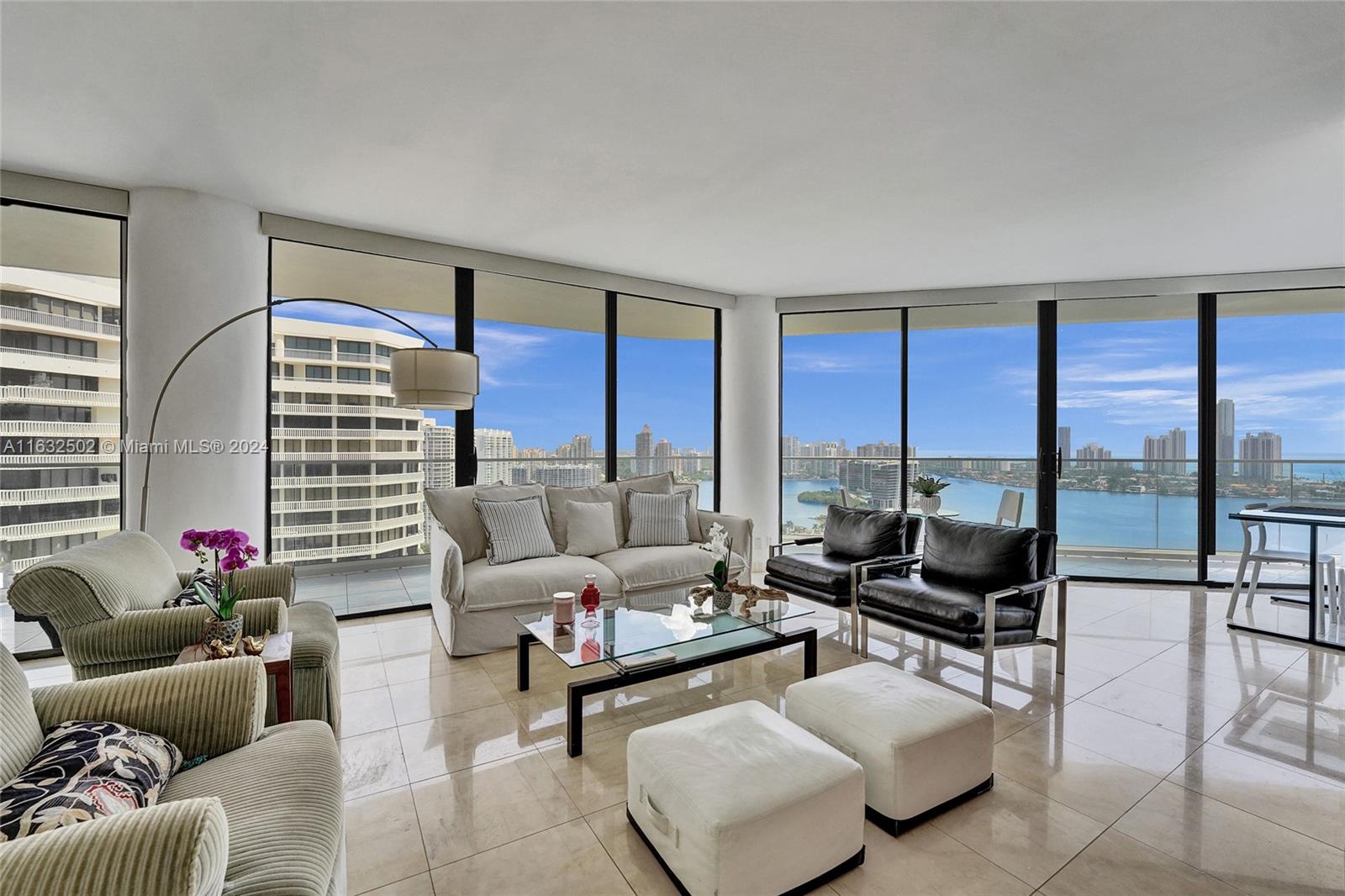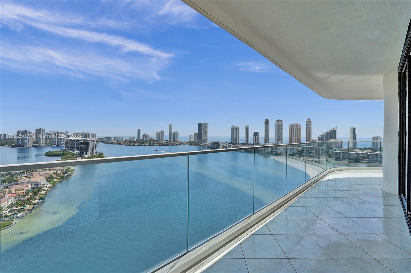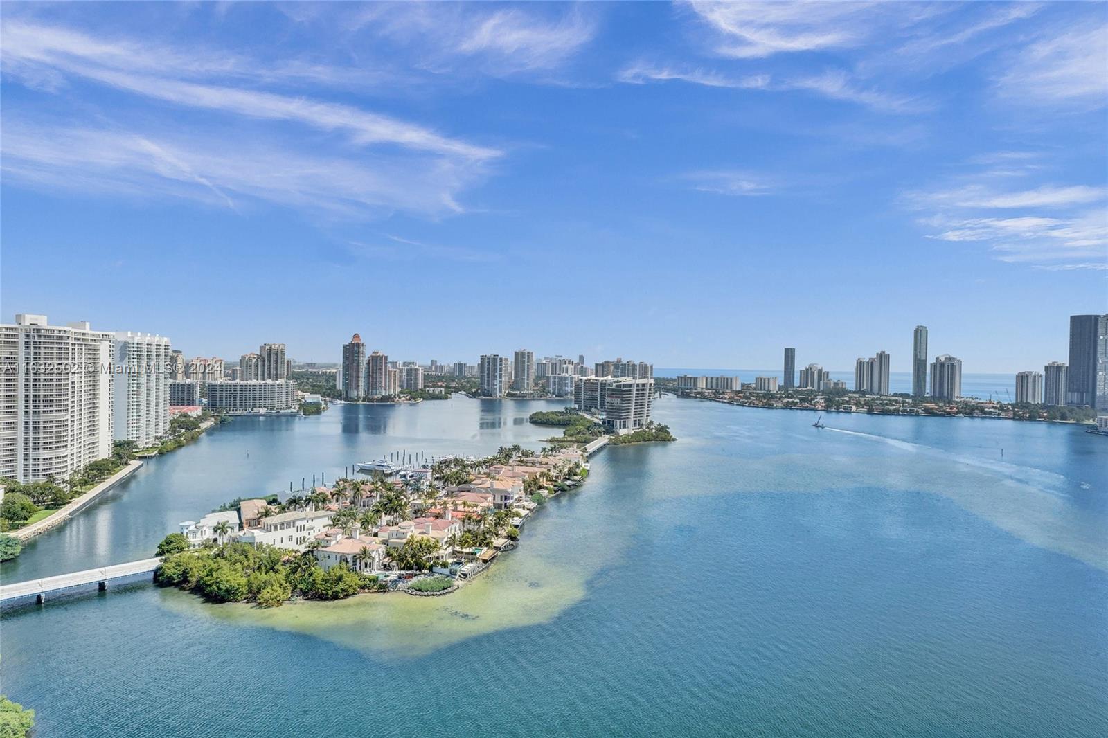 Experience stunning Intracoastal water views from every room in this turnkey 3-bedroom, 3-bathroom sky-high residence with a wraparound balcony, offering both sunrise and sunset vistas. The open floor plan features an expansive master suite with ample closets and an open kitchen. This home is equipped with elegant lighting and shades on every door. Includes a 2-car garage valet parking. Nestled on the prestigious Williams Island, which offers an exclusive and private lifestyle. The 2800 building boasts full-service amenities including a pool, jacuzzi, gym, and more. A pleasure to show.