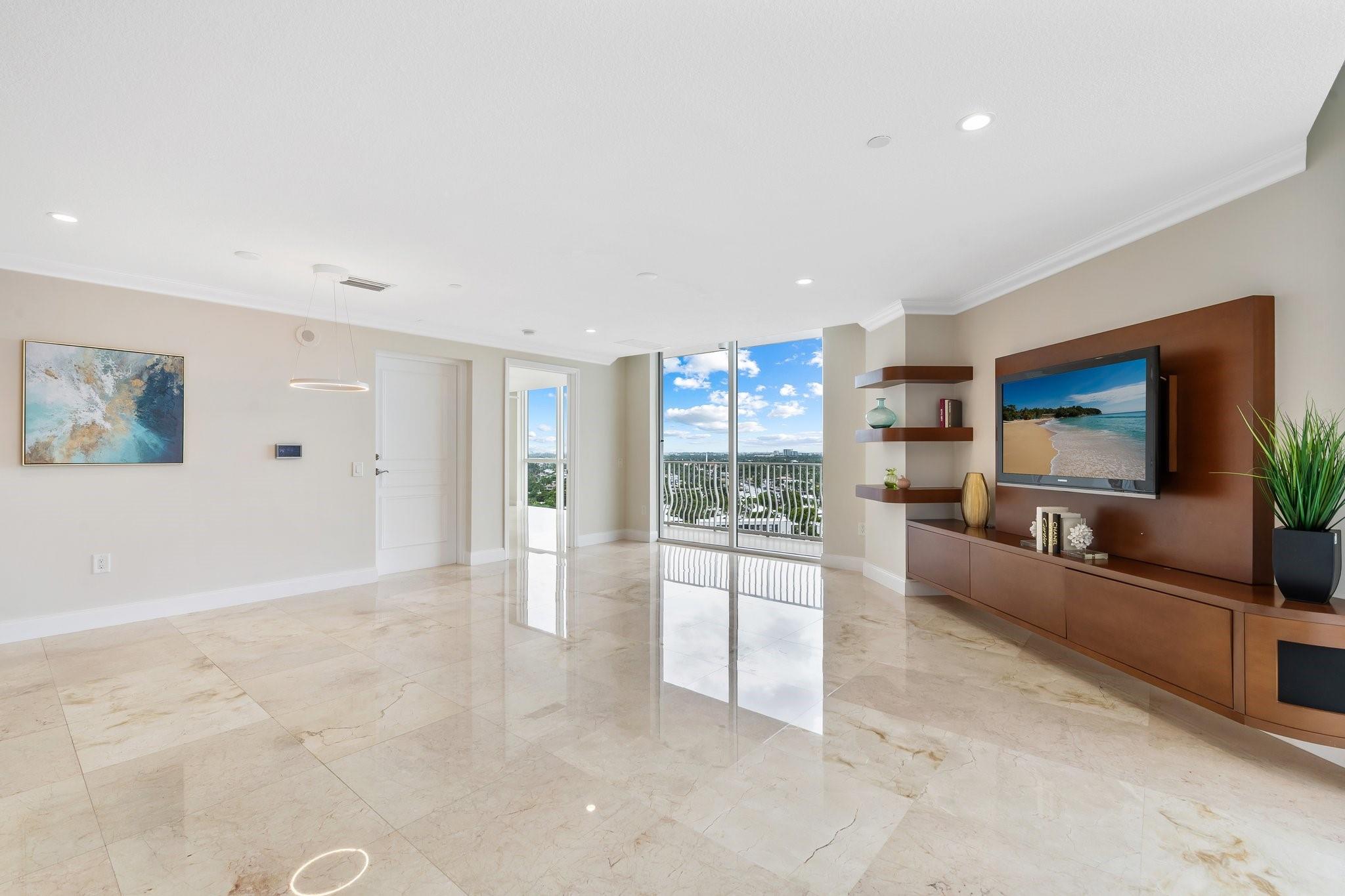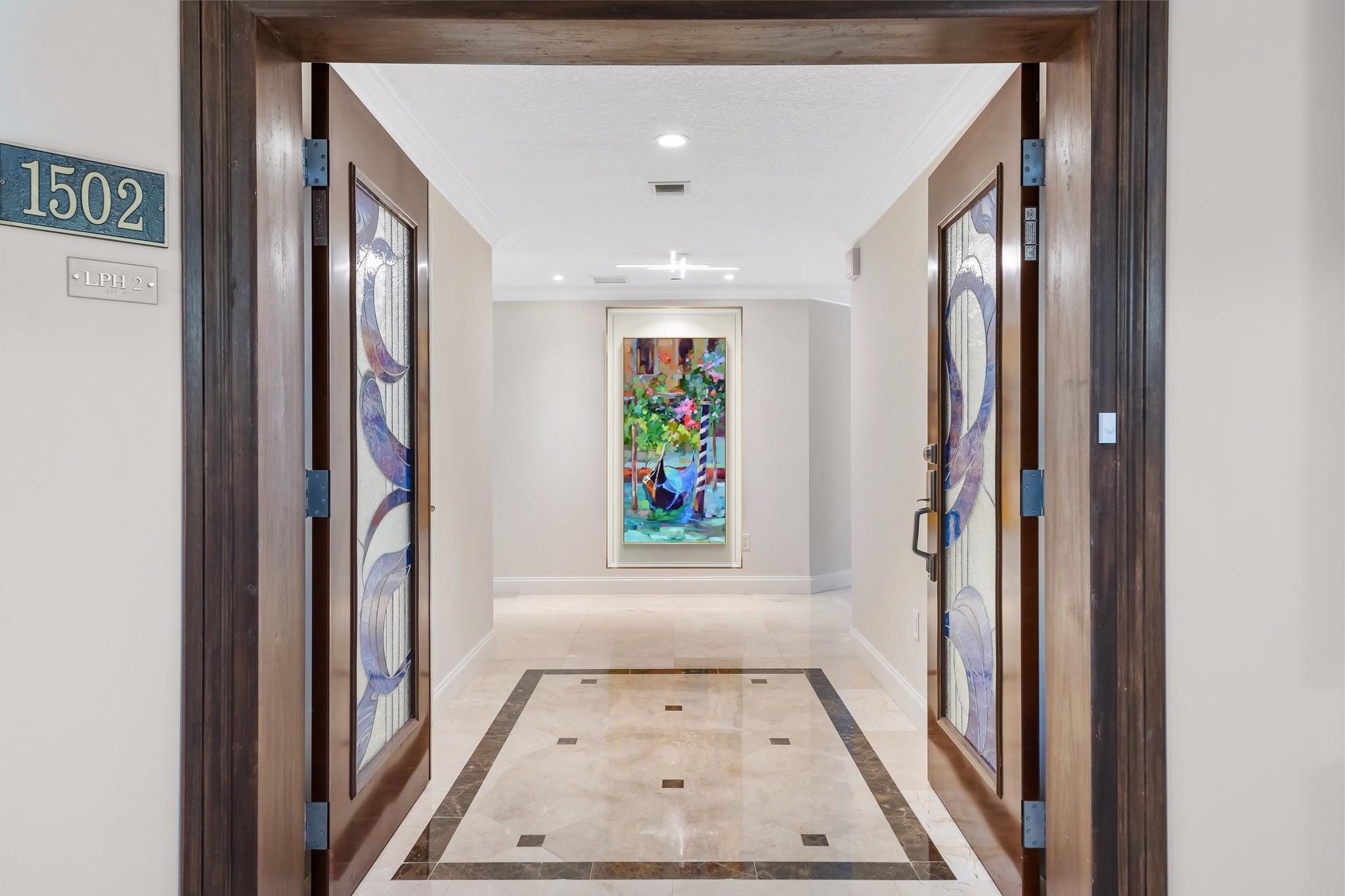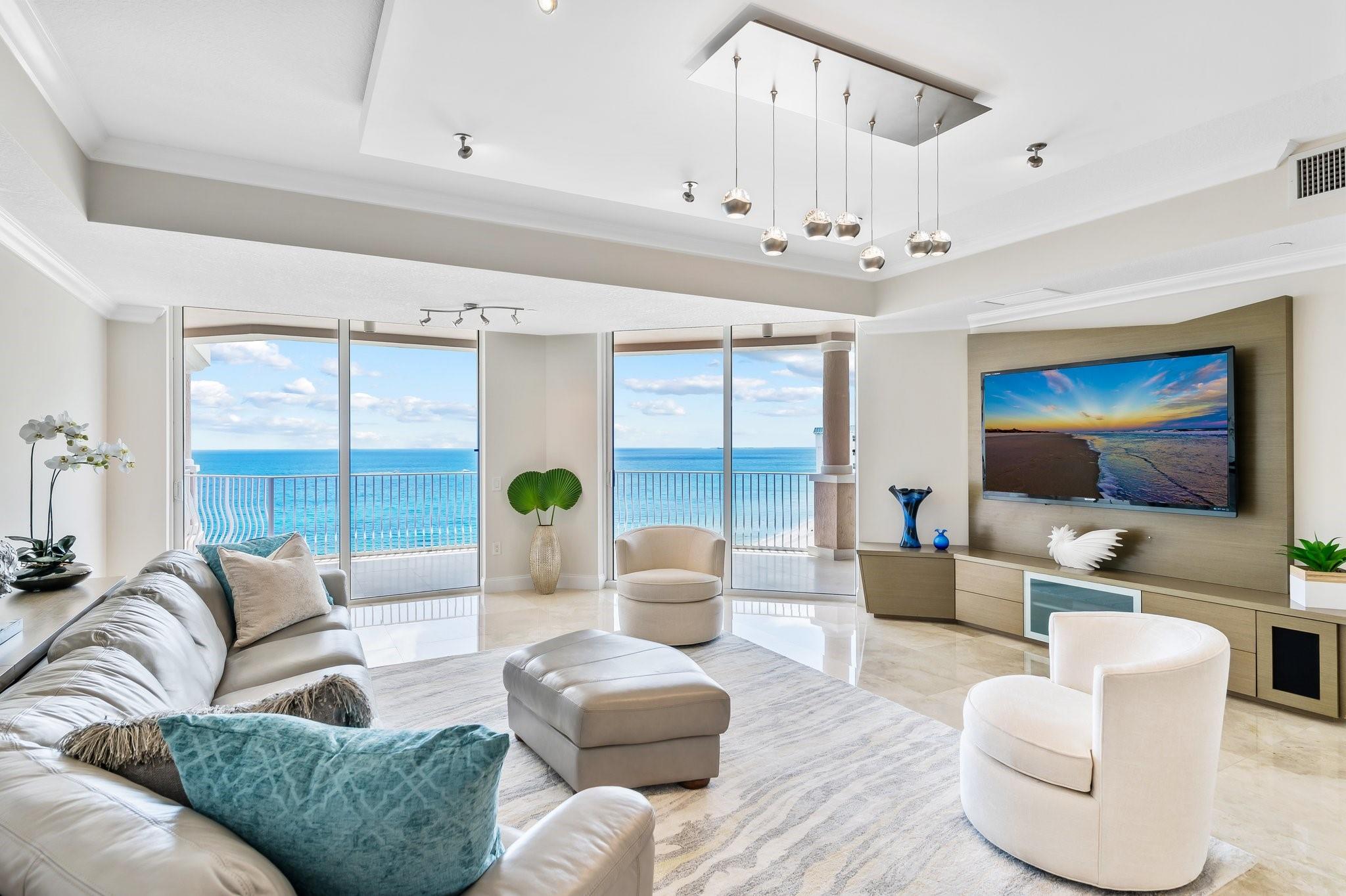Lower Penthouse with endless ocean views in this pristine flow-through residence. Exit the elevator into your private foyer leading you through stained glass double doors. Features include marble floors, trey ceilings enhanced with LED lighting, granite countertops, electric shades, custom closets and 9' floor to ceiling impact windows. Two expansive living areas, 3 ensuite bedrooms, an office/den or 4th bedroom. Boasting three balconies to enjoy your morning coffee watching the sunrise over the ocean, and your evening glass enjoying spectacular sunsets overlooking the Intracoastal. Two dedicated parking spaces & a storage unit in a pet-friendly building. Amenities include a fitness center, two club rooms, pool, hot tub, dog run, BBQ area and direct beach access. Easy to show!