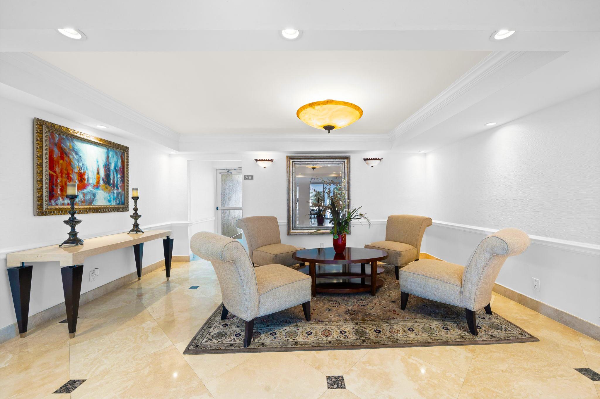 Pristine Penthouse overlooking the wide waters of the Intracoastal. Remodeled with porcelain tile floors throughout, modern kitchen with custom cabinetry, island, quartz countertops & LED lighting. Open concept living provides a spacious living/dining area leading out to the private covered terrace with remarkable views. The primary suite features an upgraded bath with glass enclosed walk-in shower, illuminated mirror, and floating vanity. Washer and dryer in the unit. Garage parking and storage included. Great beach location building amenities include Lobby entry, spacious clubroom with full kitchen, billiard room, fitness center, library, saunas, BBQ grills and rooftop sundeck. Sunny heated saline pool on the Intracoastal Waterway