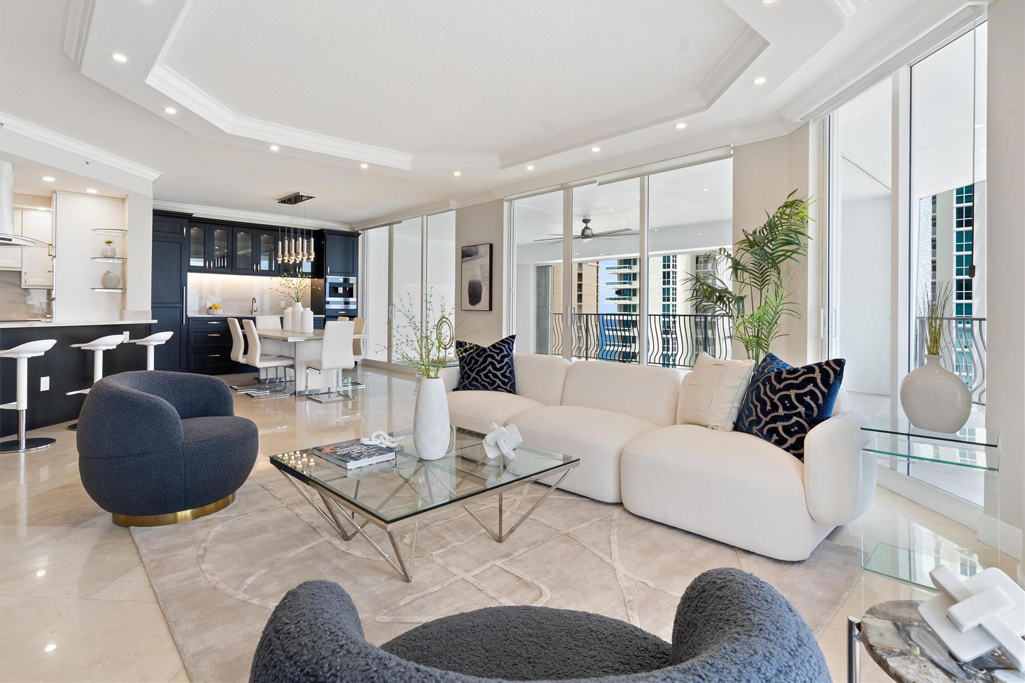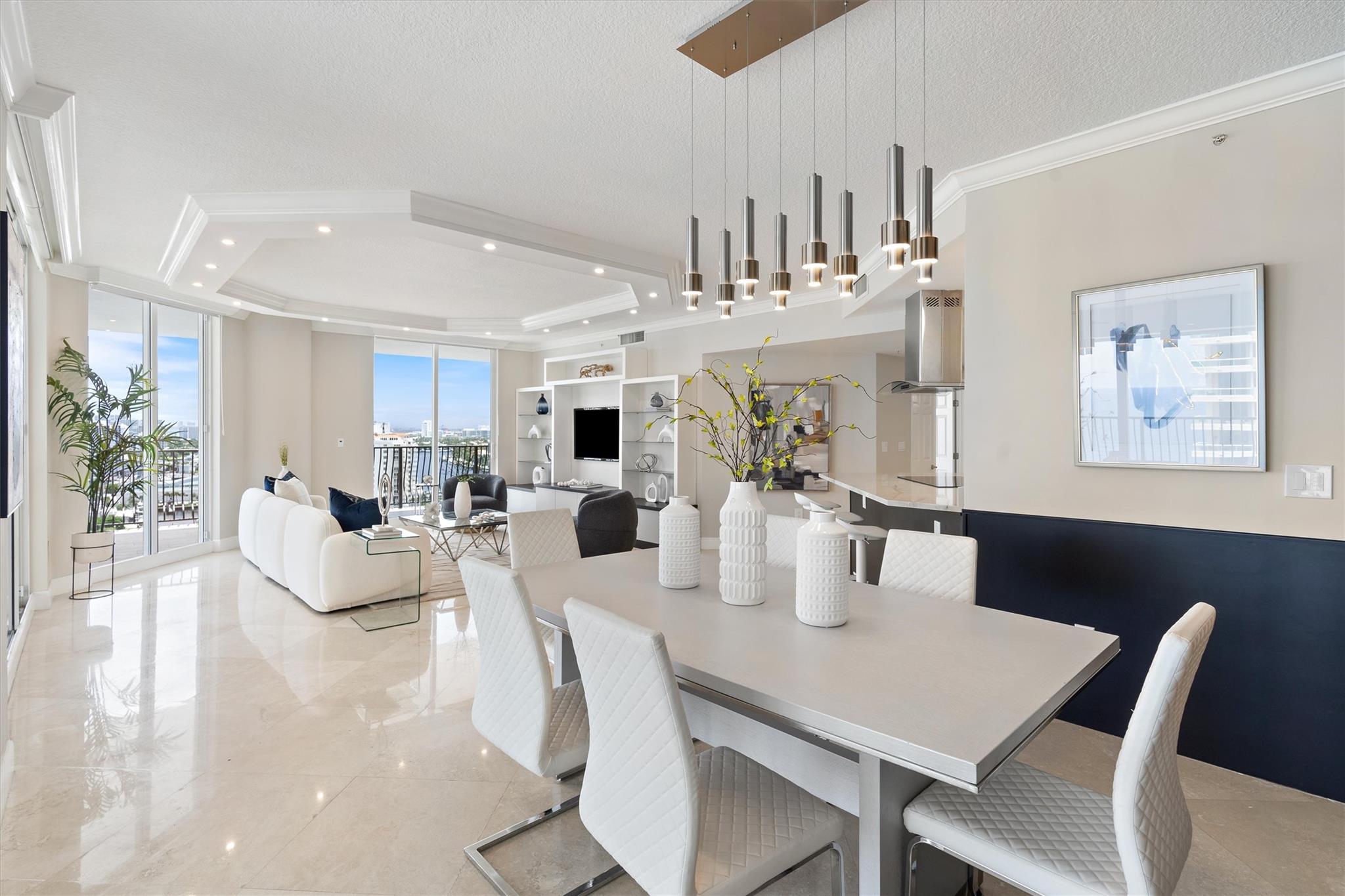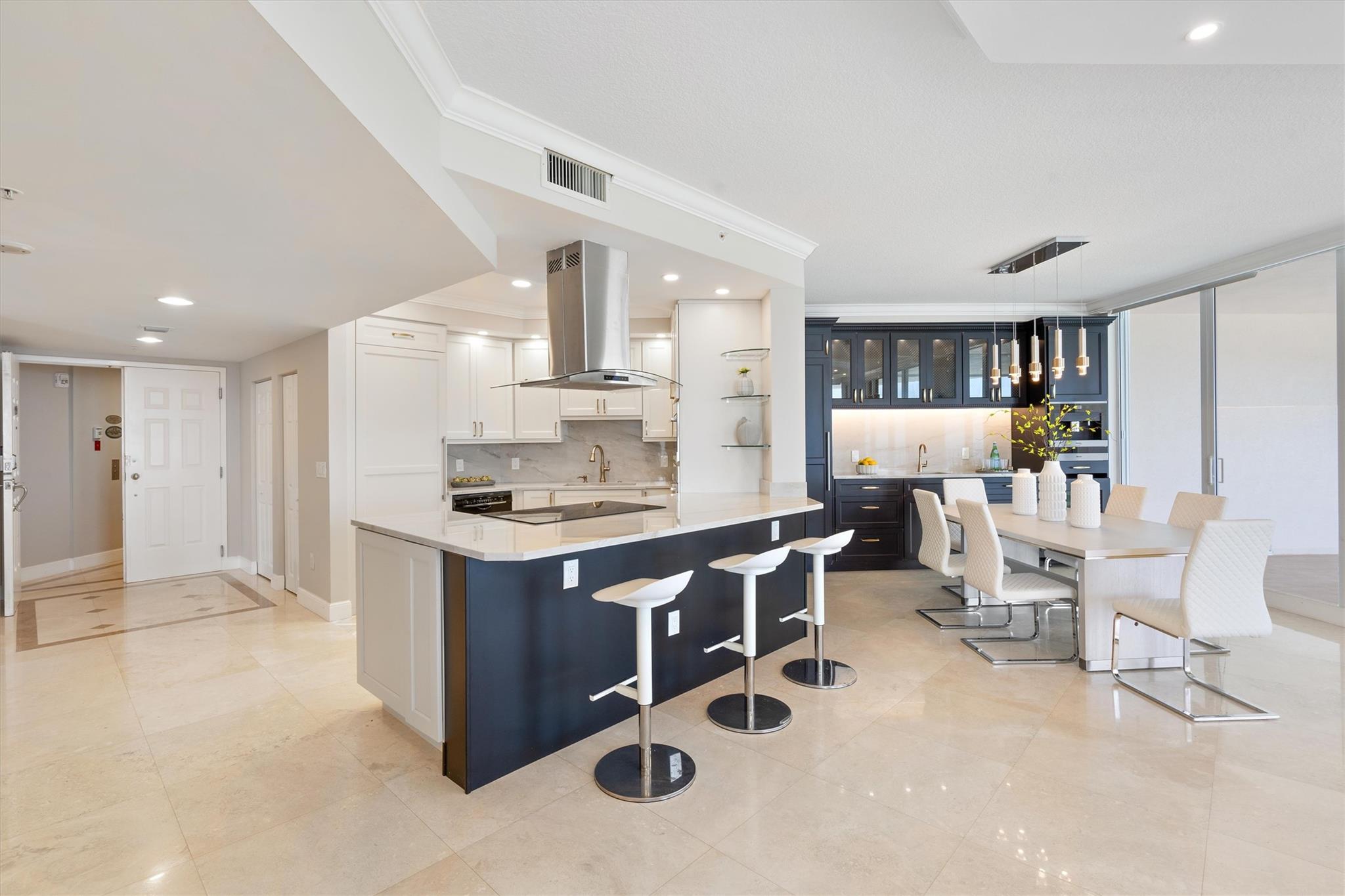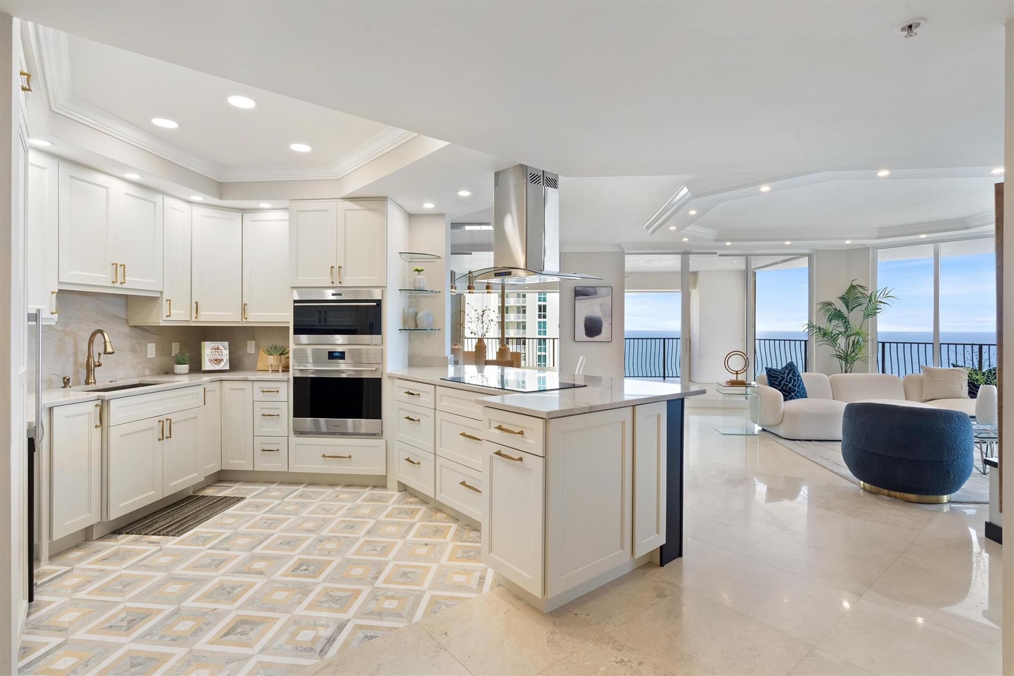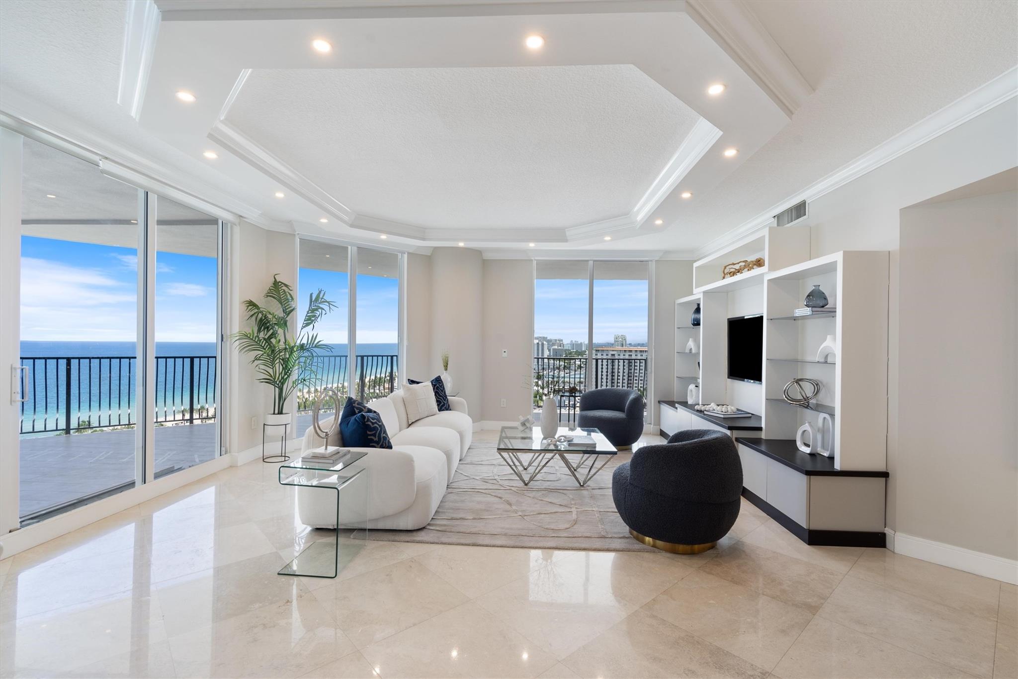 Spectacular panoramic views of the ocean, Intracoastal and city await from this graciously appointed and sought after southeast corner unit. Featuring 2 bedrooms, two and a half baths, plus office/den and oversized 1,100 SF wrap around terrace with brand new tile. Kitchen renovated with high end appliances, quartz countertops and beautiful cabinetry including wet bar in dining area with Miele coffee system, warming drawer and wine cooler. Spacious primary suite with double closets and primary bath with double vanity walk-in shower and jacuzzi tub. Both the primary suite and second bedroom have direct to access to the terrace and share those amazing ocean & Intracoastal views. Brand new washer and dryer, California Closets throughout. Two garage parking spaces. Pet Friendly Building!