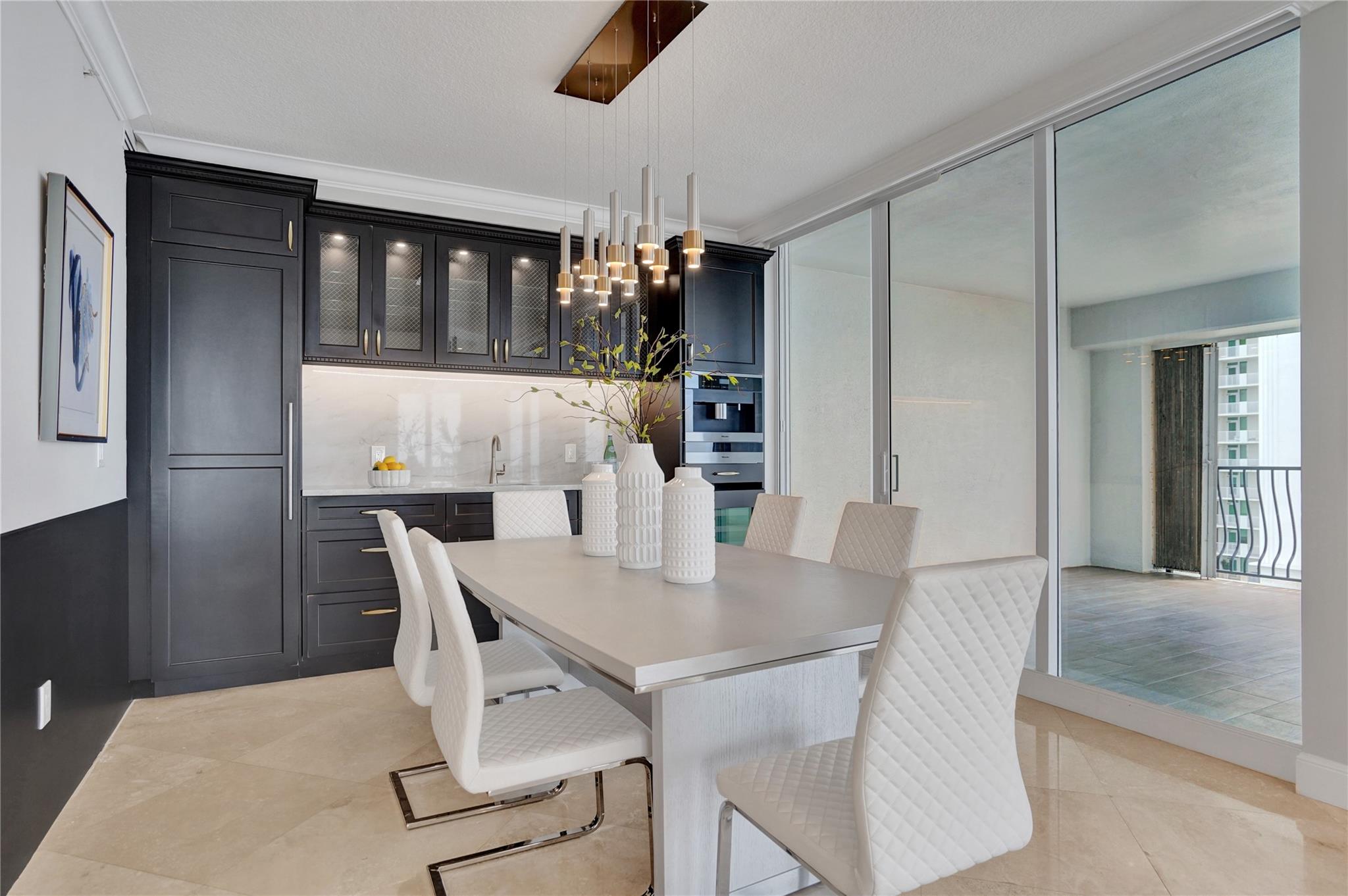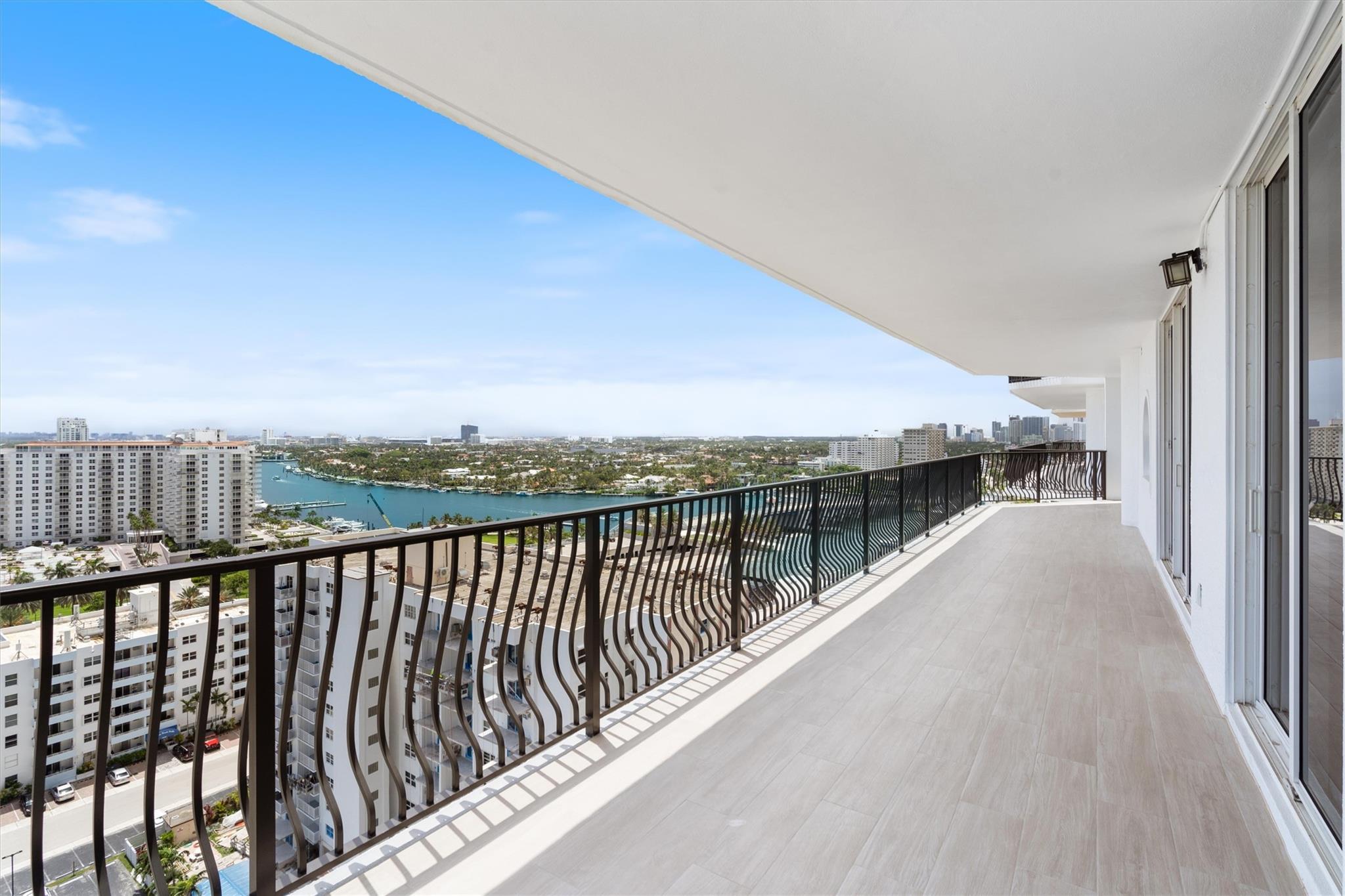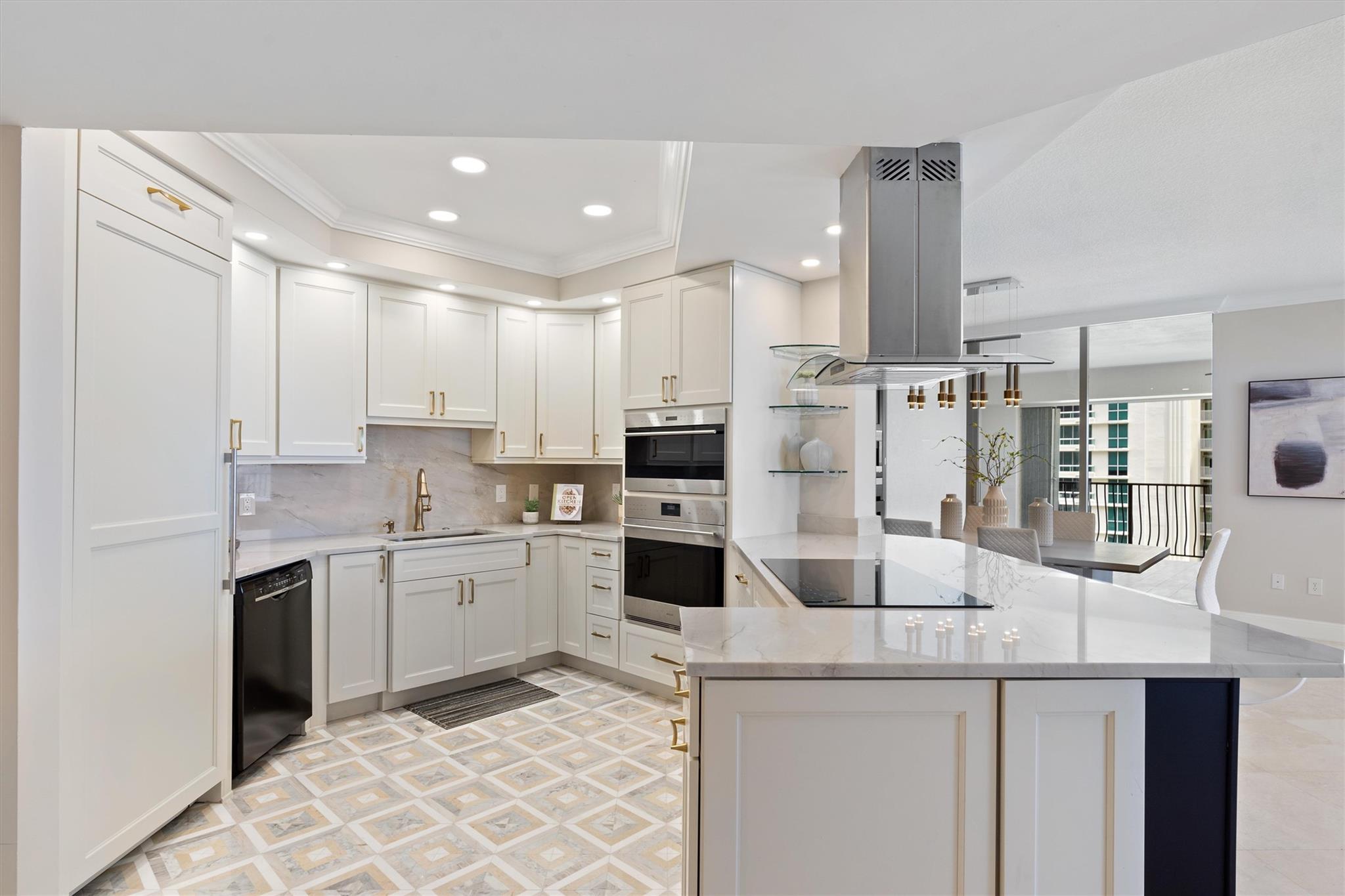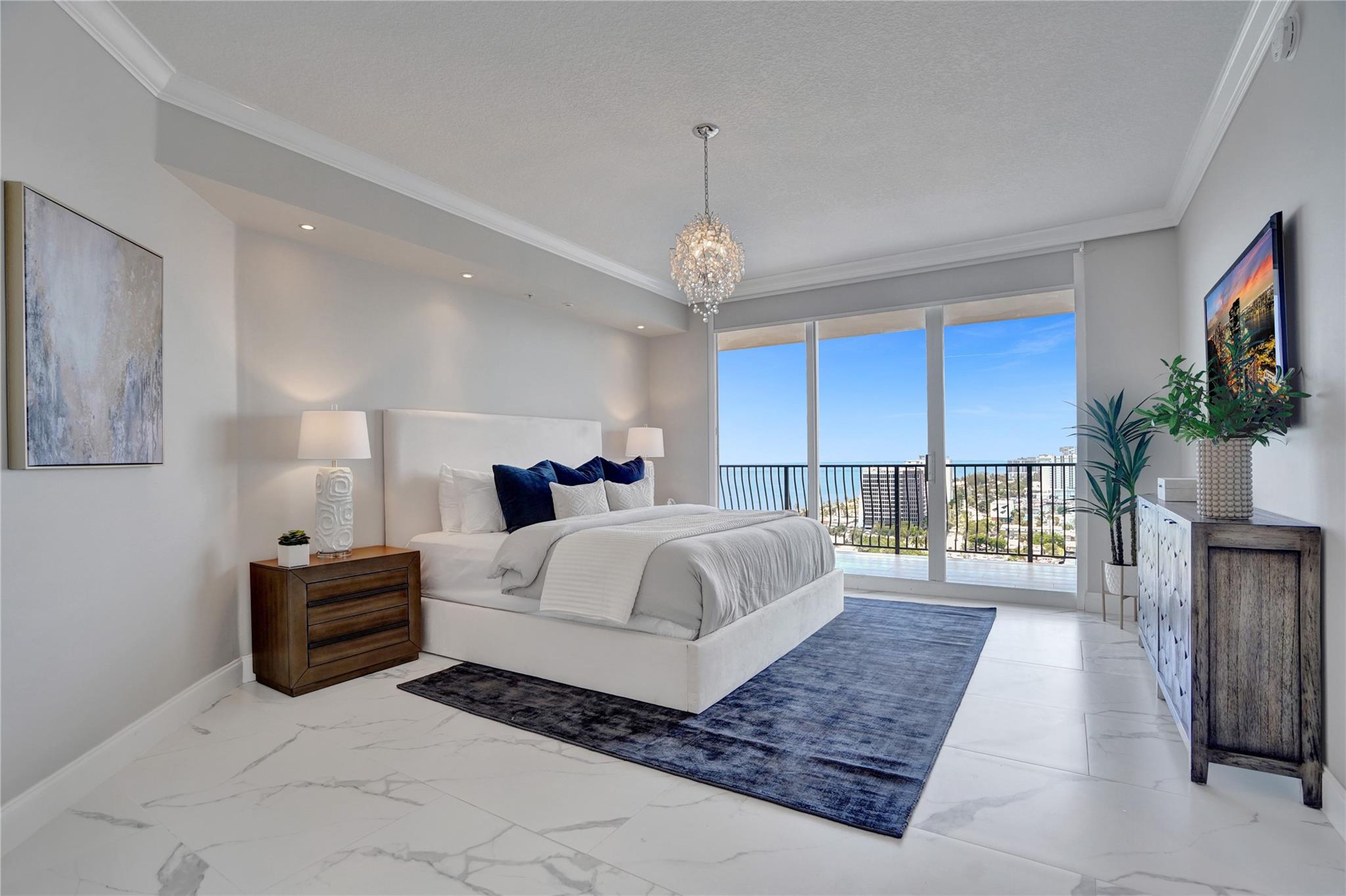 Spectacular panoramic views of the ocean, Intracoastal and city await from this graciously appointed and sought after southeast corner unit. Featuring 2 bedrooms, two and a half baths, plus office/den and oversized 1,100 SF wrap around terrace with brand new tile. Kitchen renovated with high end appliances, quartz countertops and beautiful cabinetry including wet bar in dining area with Miele coffee system, warming drawer and wine cooler. Spacious primary suite with double closets and primary bath with double vanity walk-in shower and jacuzzi tub. Both the primary suite and second bedroom have direct to access to the terrace and share those amazing ocean & Intracoastal views. Brand new washer and dryer, California Closets throughout. Two garage parking spaces. Pet Friendly Building!