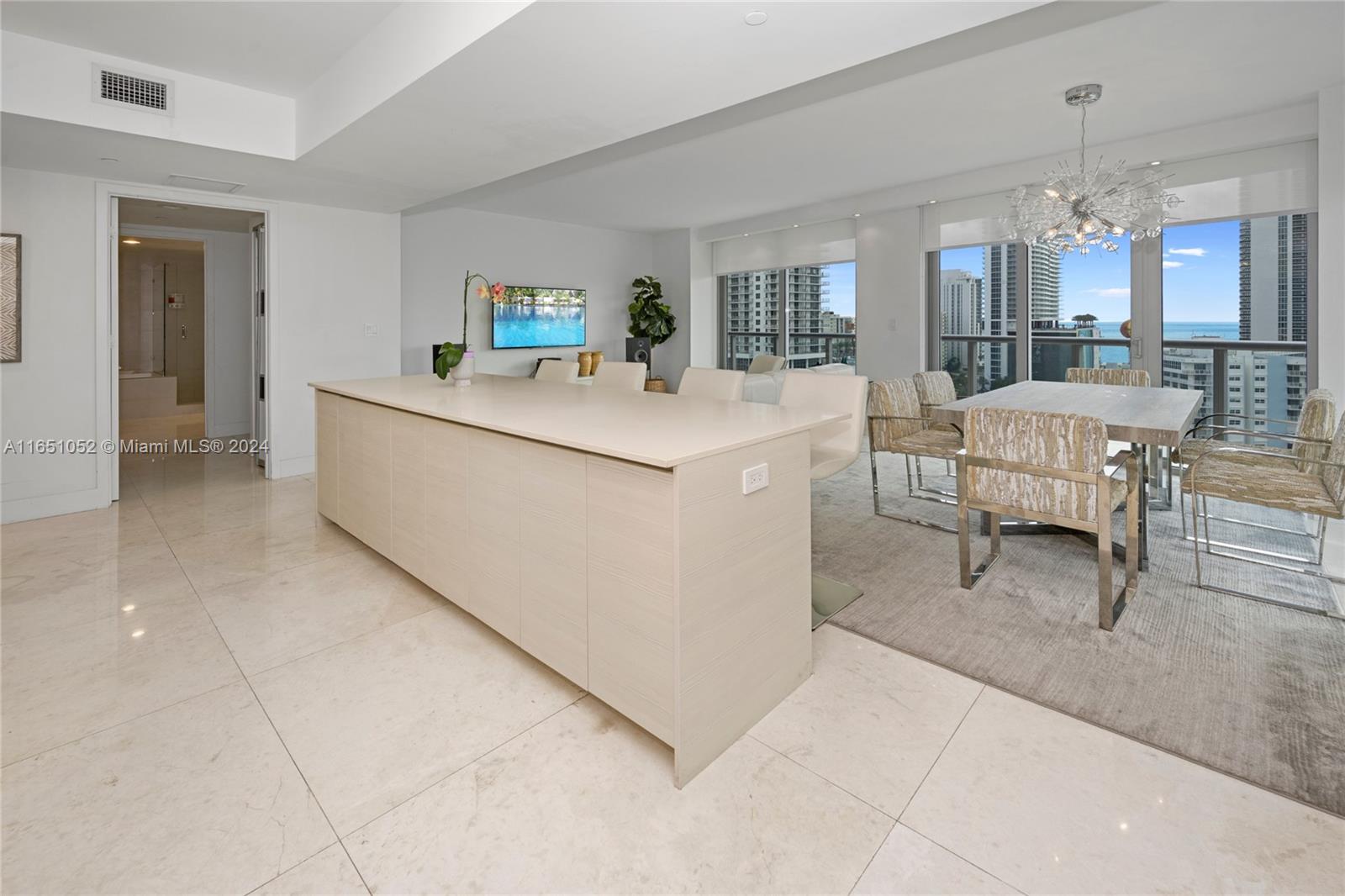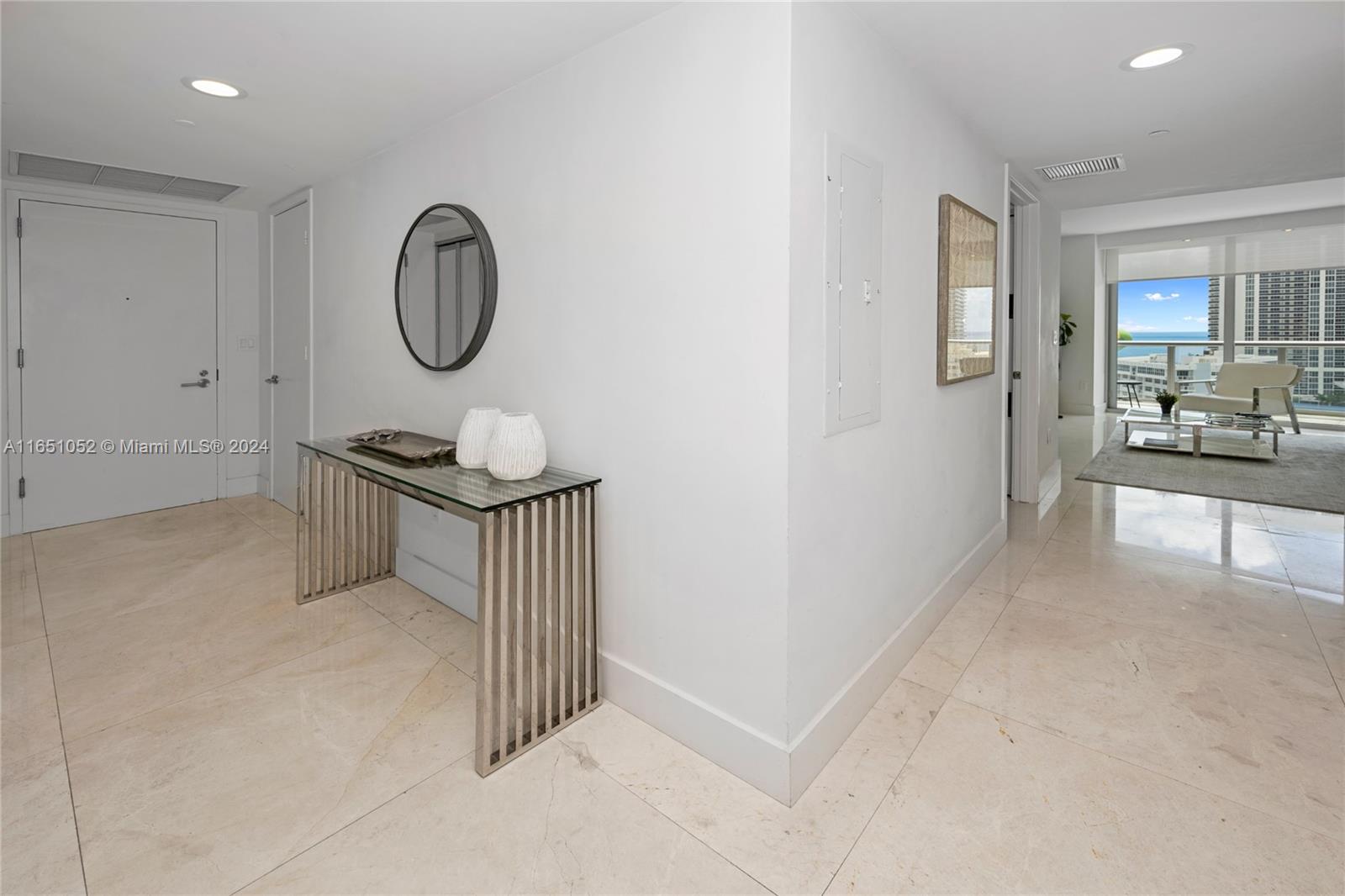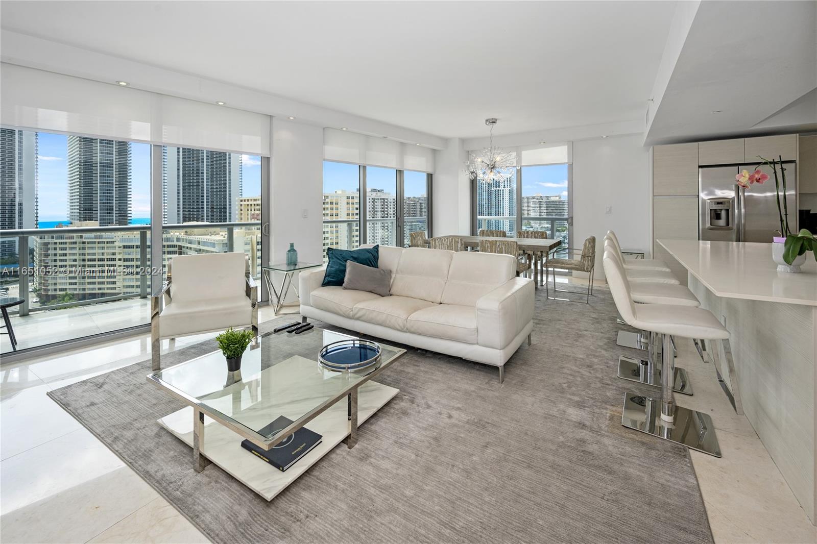 Experience luxury living in this stunning 3-bedroom, 3-bathroom residence, offering sweeping views of the ocean, Intracoastal Waterway, and the city skyline. With no rental restrictions, this property is a prime investment opportunity. Step off your private elevator into a space designed with elegance—high-end stainless-steel appliances, custom Armadi closets, and exquisite 32x32 marble floors throughout. Furnished by a private interior designer, every detail exudes sophistication. Residents enjoy exclusive access to a rooftop pool, state-of-the-art gym, valet and concierge services, a lounge, and a beach club offering towels, umbrellas, and chair service. Located just minutes from Aventura Mall and Gulfstream Park, this is coastal luxury at its finest!