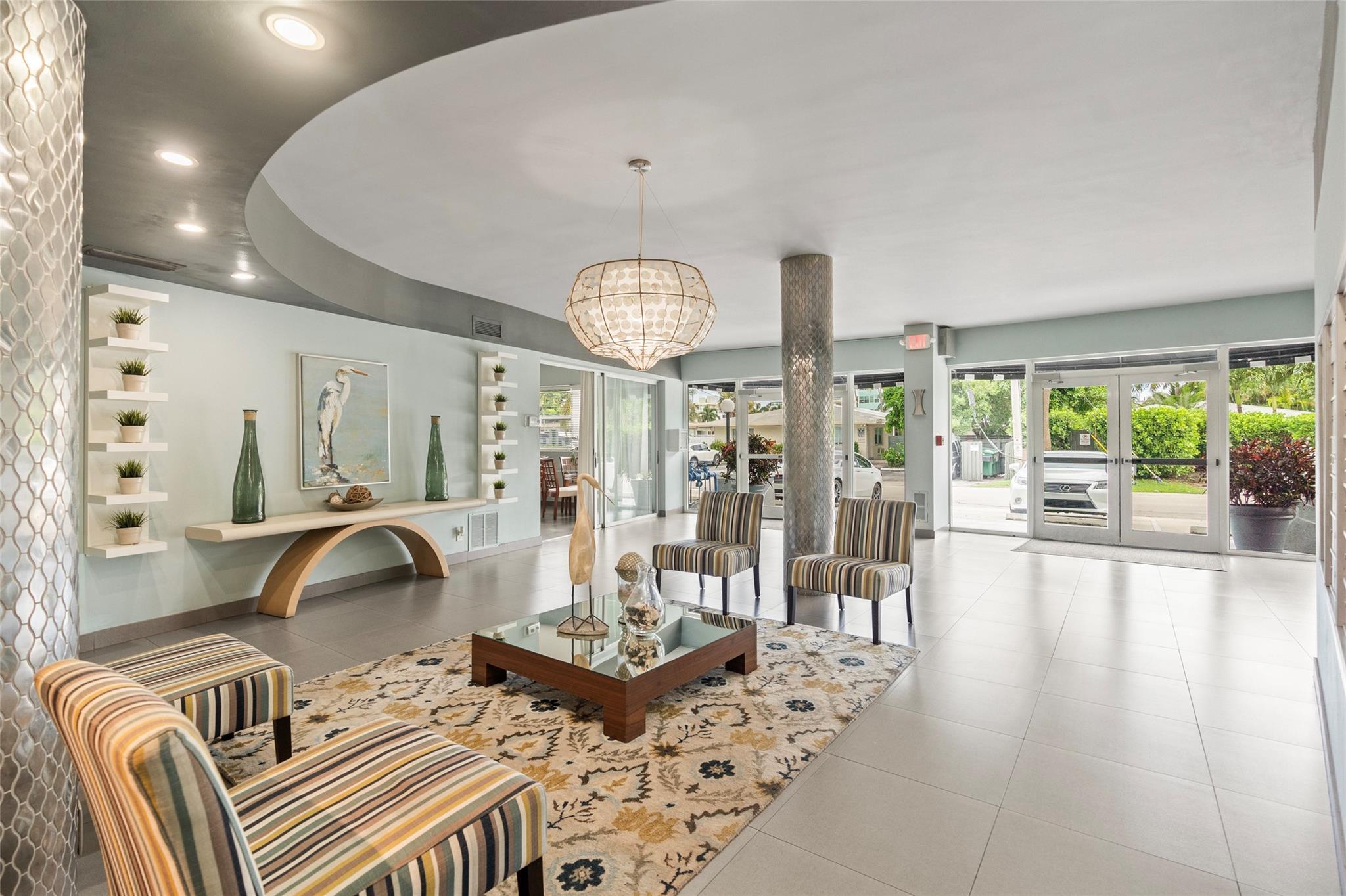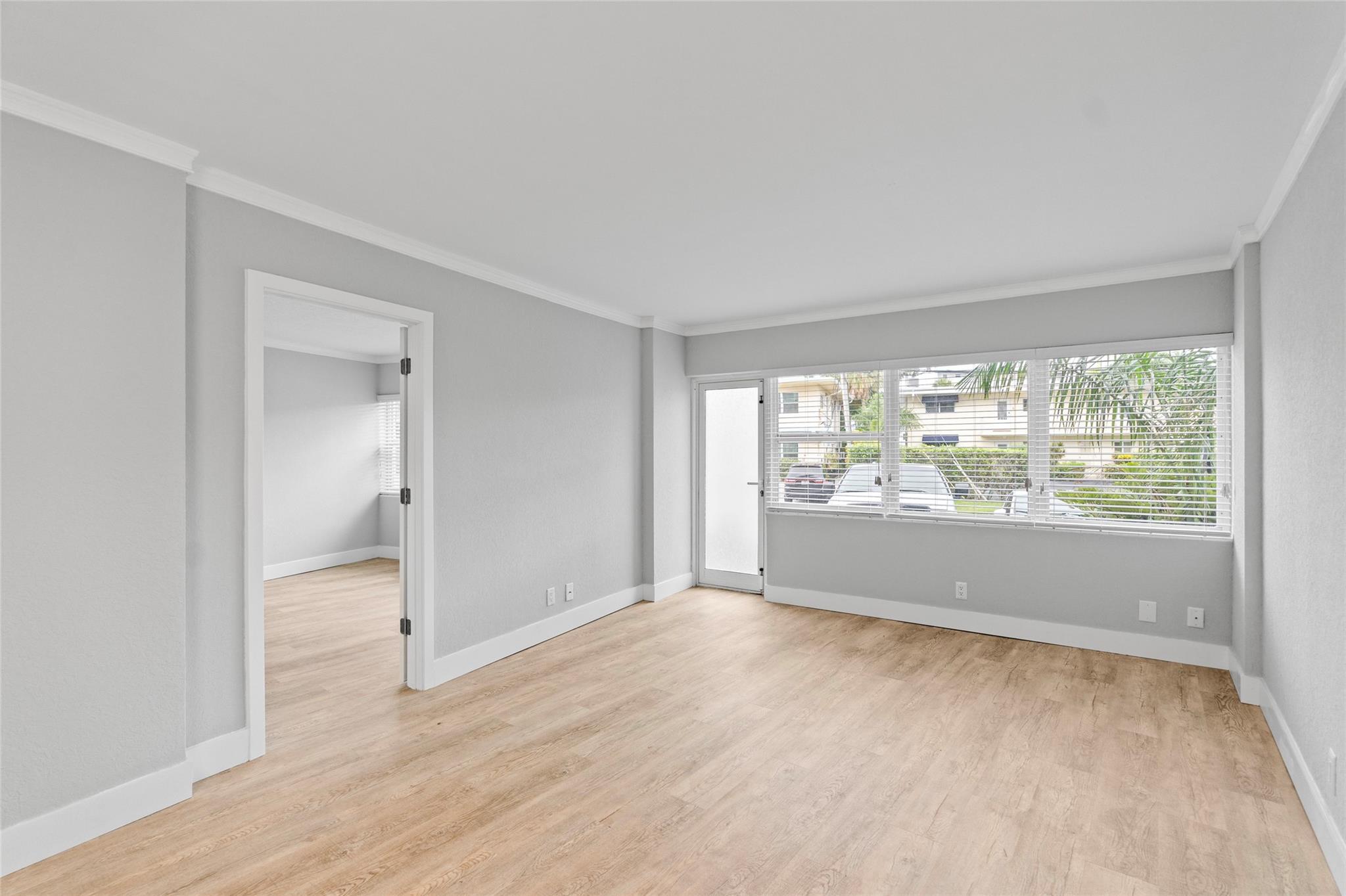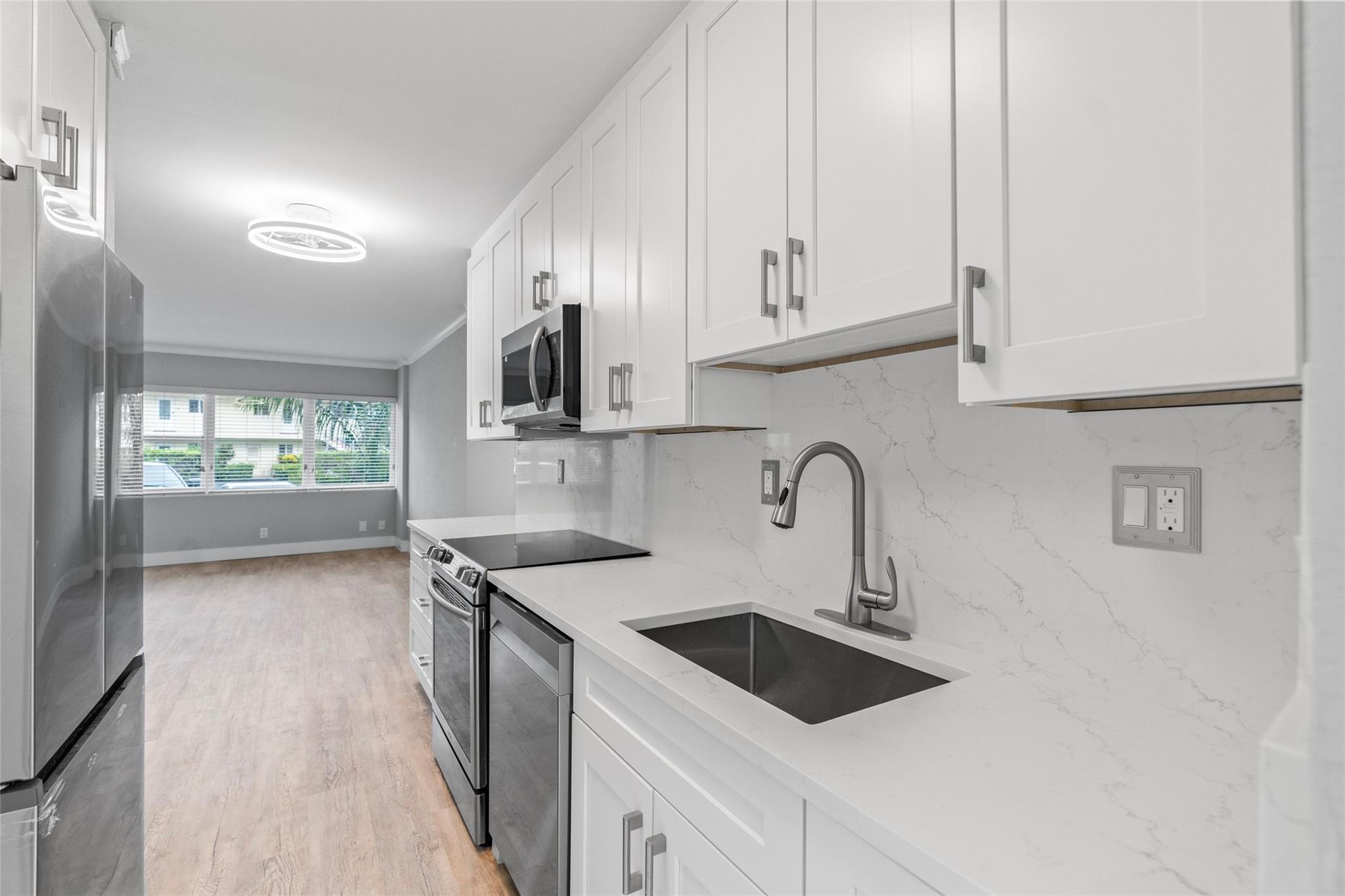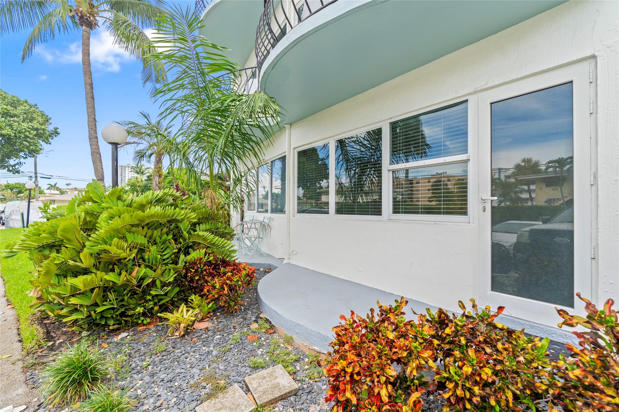 The perfect Garden Oasis! 2 blocks Ft Lauderdale beach & 1/8 mile to dining/shopping. Completely renovated/not lived in- everything is new! Love the simplicity of main level living with a dedicated parking space just outside the back door. Relax in the peaceful beachy vibe that has been crafted. The floorplan is an open concept between the living, dining & kitchen. Luxury vinyl plank flooring throughout w/soft close white shaker cabinets. The bathroom has a walk-in tiled shower & stylish frosted glass barn doors to allow for natural light but still allows privacy. Primary bedroom w/walk-in closet. The back bedroom makes a perfect office. White wood blinds on all windows. New appliances & AC. Kitchen is steps from the BBQ & pool area. Hurrican windows/doors. This home will not disappoint!