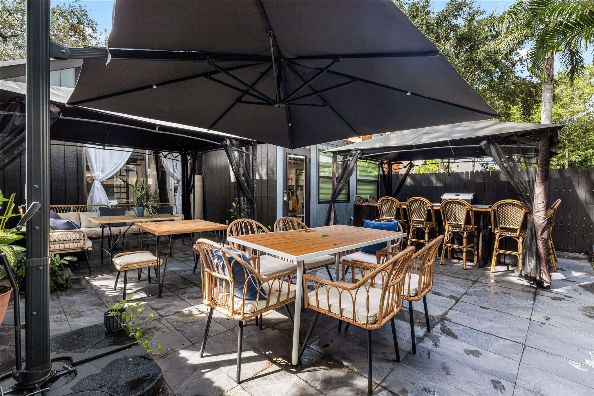 Stunning two story loft nestled in tall oak trees of Palm Aire Village with abundant space. This updated home features a two month old roof, vaulted ceilings, and a modern kitchen with waterfall quartz island, custom cabinets, and sleek black appliances. Enjoy upgraded bathrooms with glass shower enclosures and custom vanities. Two split bedroom floor plan offer walk in closets with built ins, and a Florida room serves as a third bedroom. The loft can be used as a home office or a fourth room. Outdoors, there's a brick paved driveway for three cars and a tranquil backyard with two covered seating areas, a grill, and a fire pit. Perfect for relaxation and entertaining.