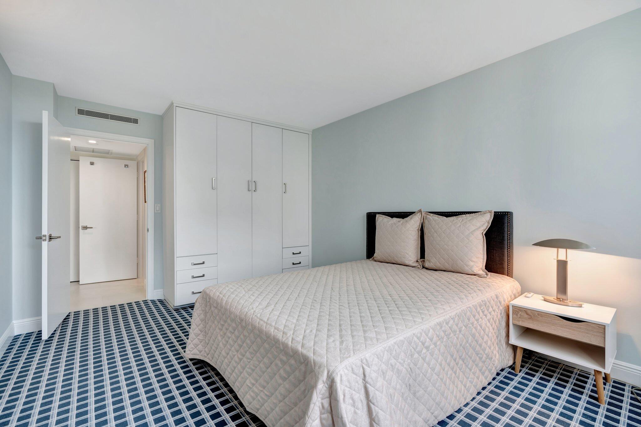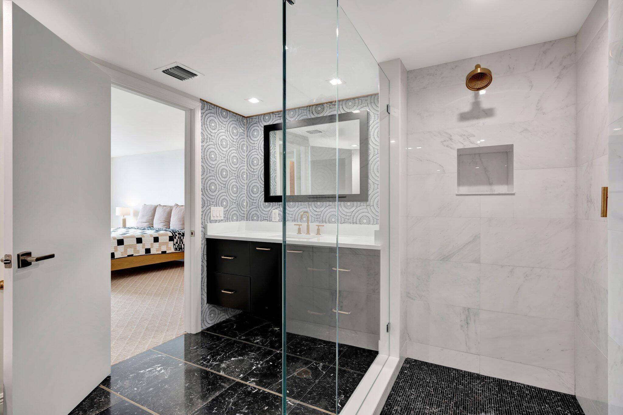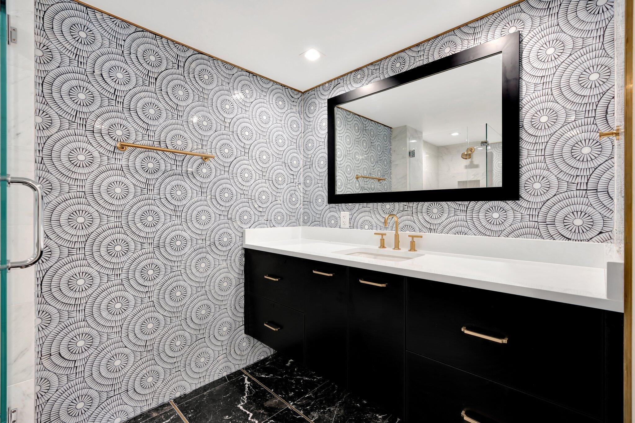 Rapallo residence 503 is a studs-down renovation for the discerning buyer--a completely remodeled turnkey condominium for easy waterfront living. Everything is included in this striking oversized two-bedroom, two-bathroom condominium with intracoastal views. This designer residence has an exquisite kitchen with white oak cabinets, Bosch appliances, quartz countertops with marble backsplash, and a breakfast nook. The attention to detail is superb, from the marble in the bathrooms to the porcelain flooring throughout the living space, the eye-catching wallpaper, dramatic mosaic tile work, brass and gold accent artistry, wool carpeting in the bedrooms, and the three-dimensional tile in the dry bar. This is the one!
